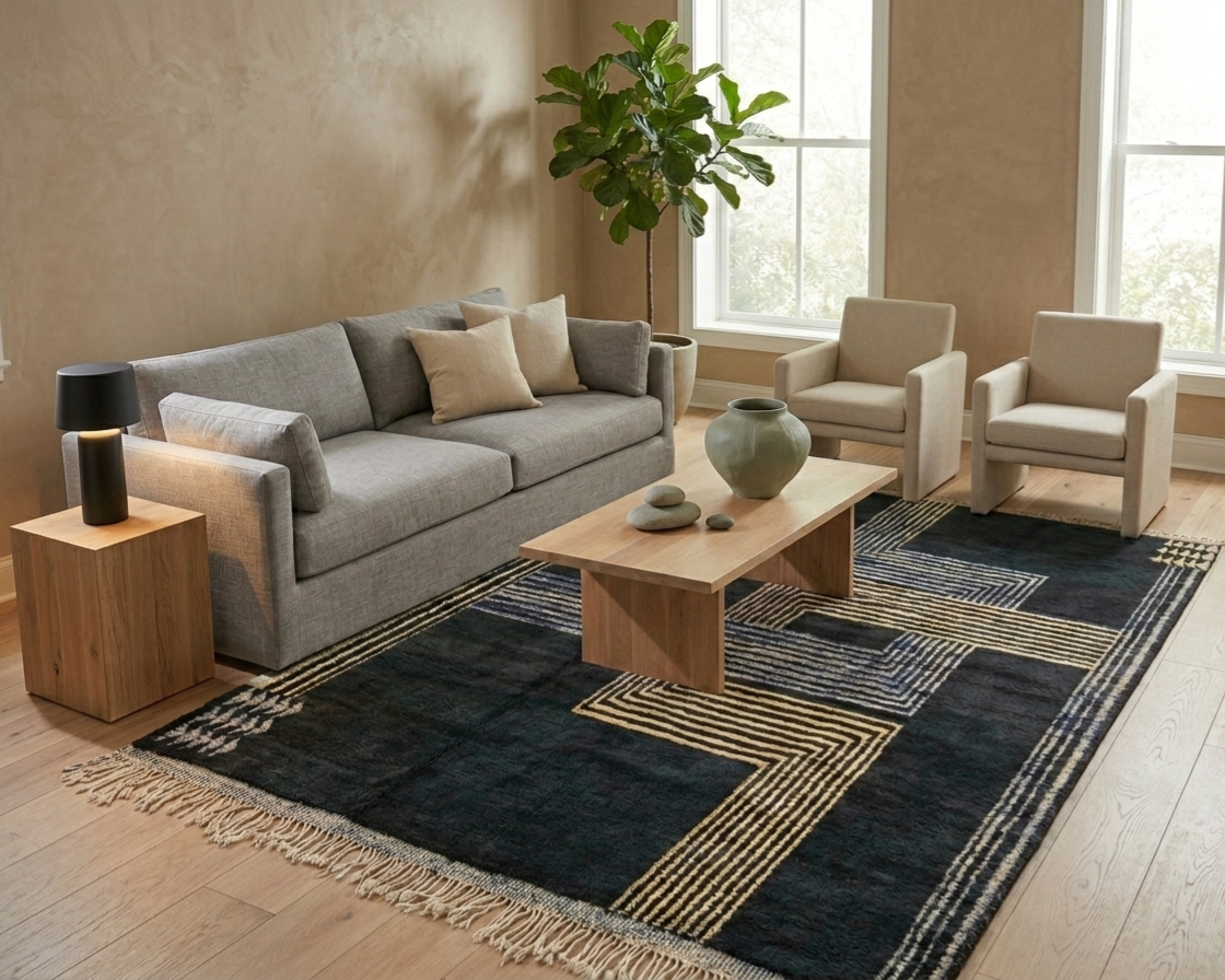 Handwoven Moroccan Area Rug: Soft Beige, Pink & Black Geometric Pattern - Elegant Living Room Decor