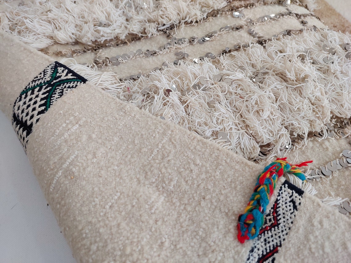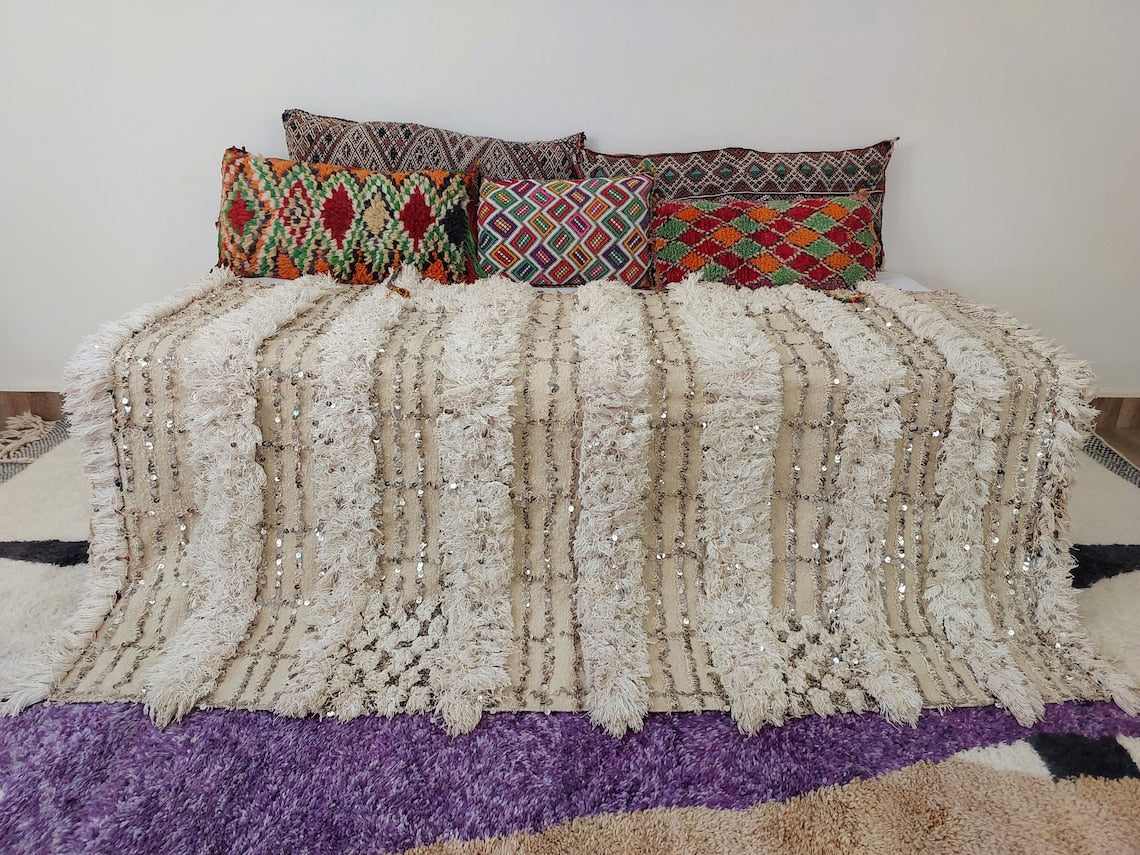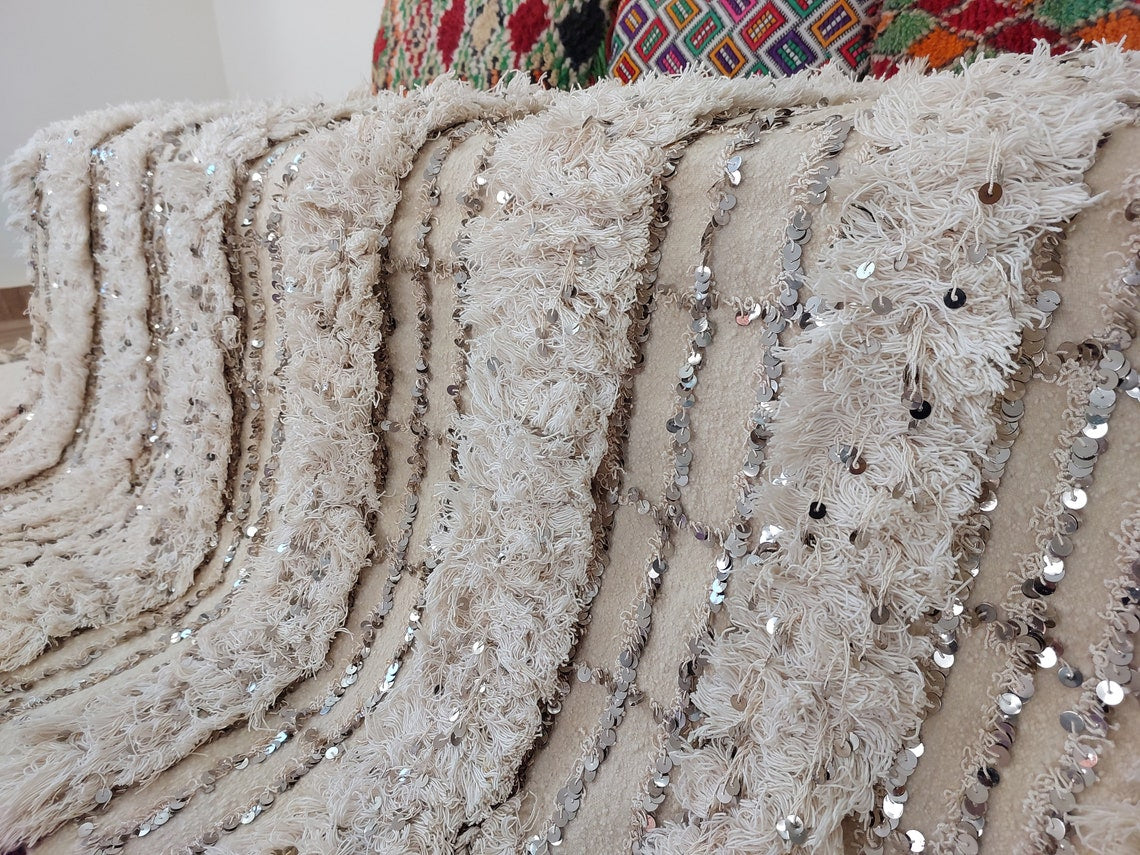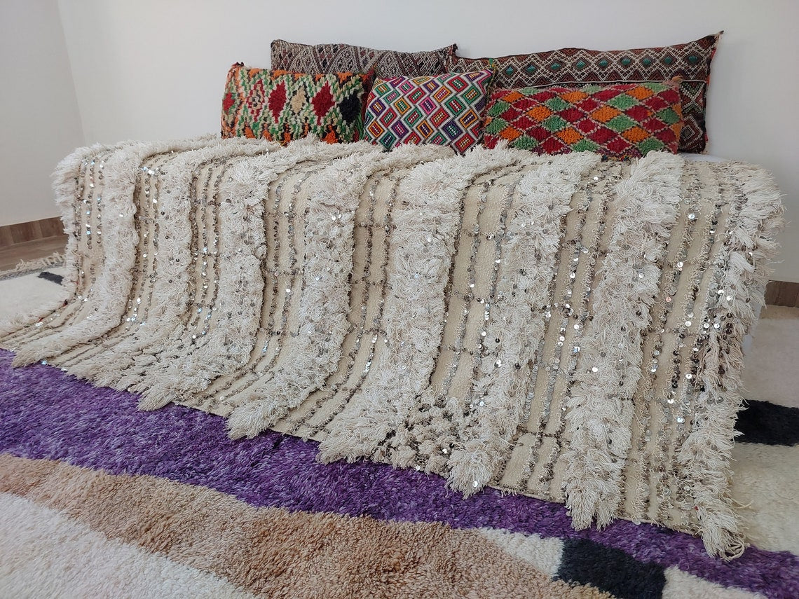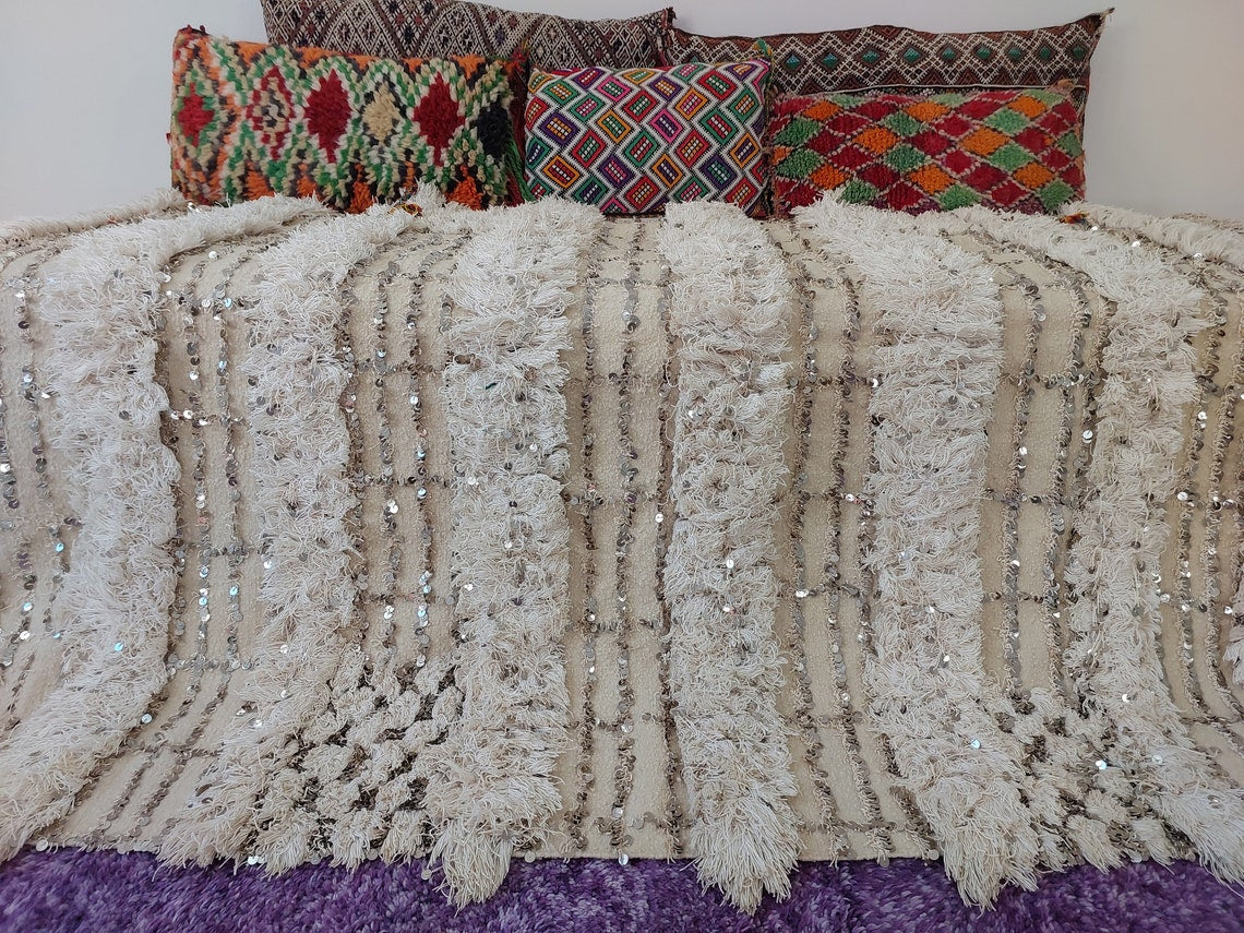 Wedding Blanket Moroccan Wool Cotton Throw With Sequins, Neutral Boho Berber Bed Cover Or Wall Tapestry Decor