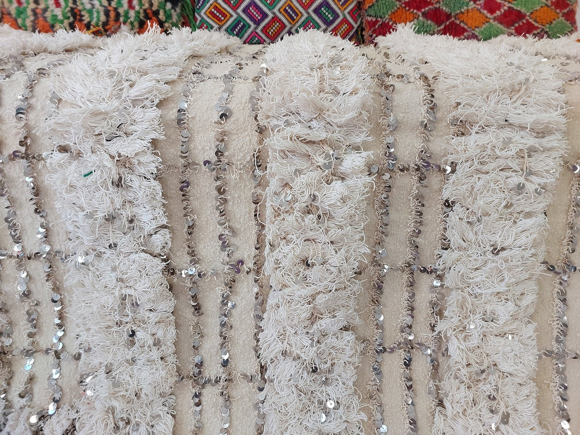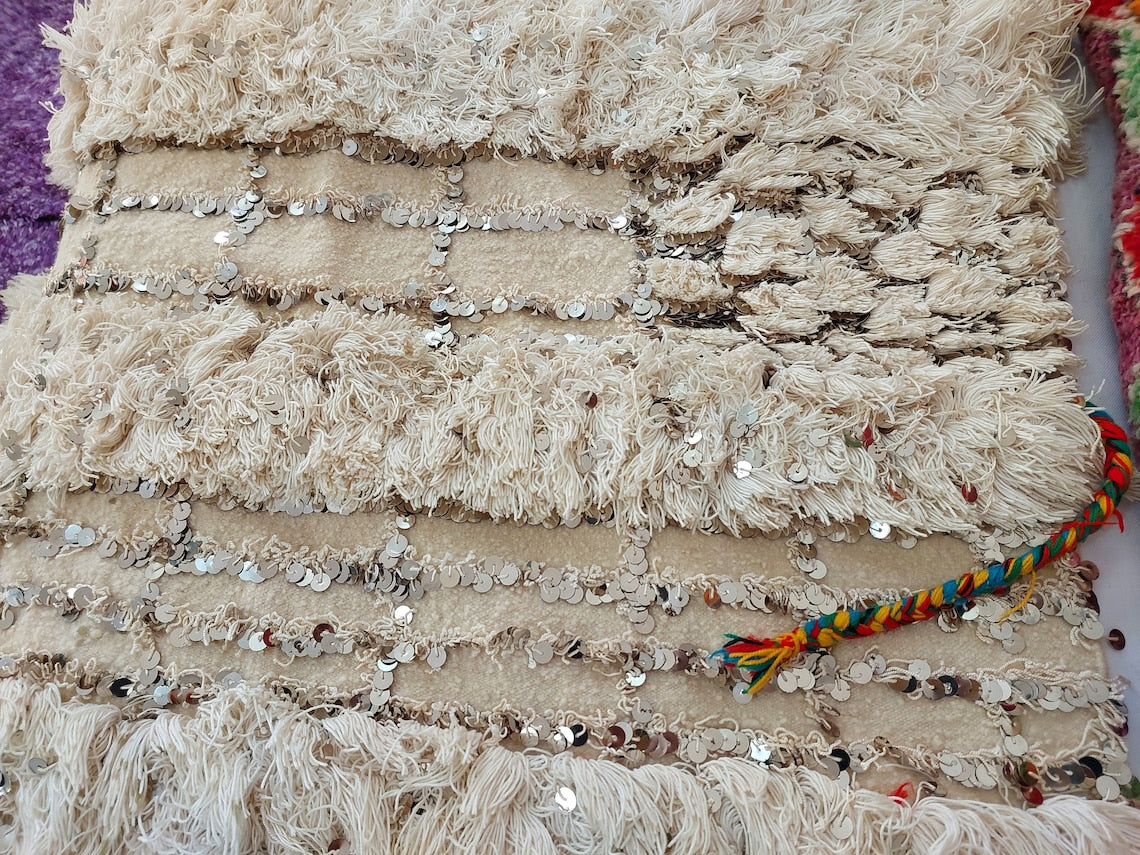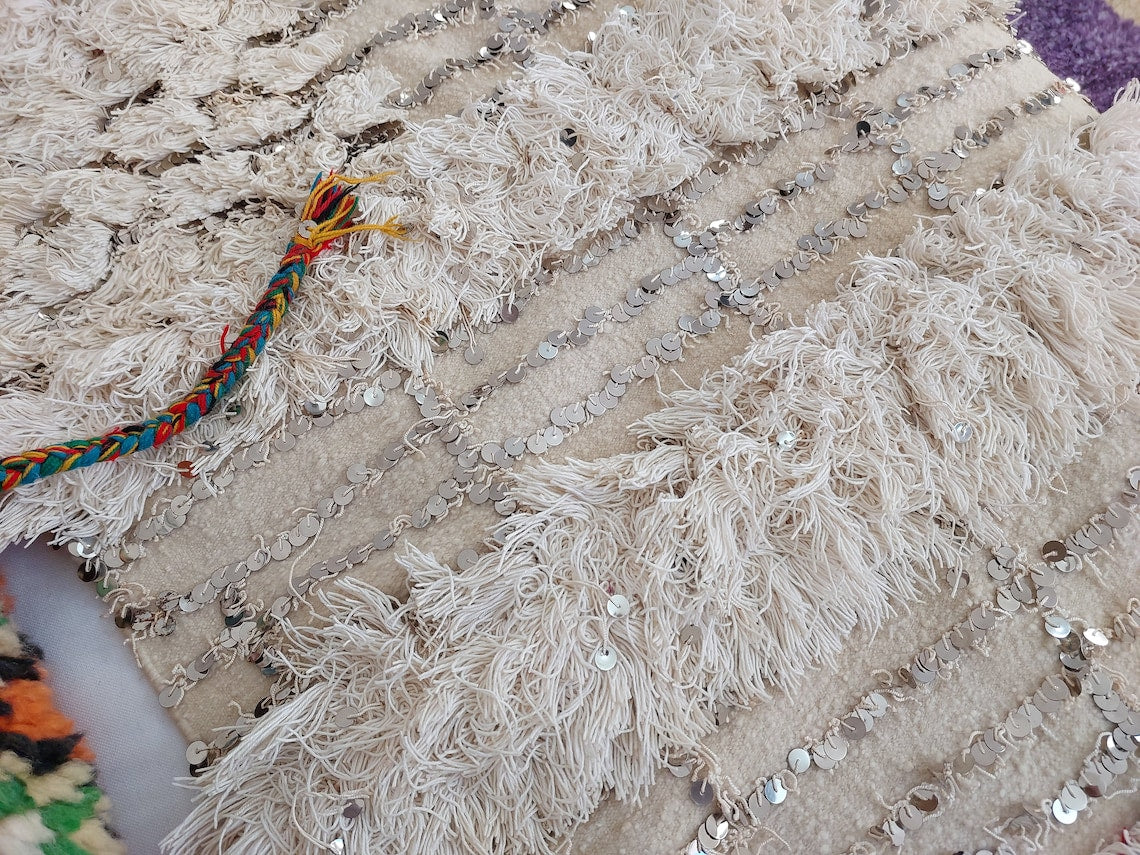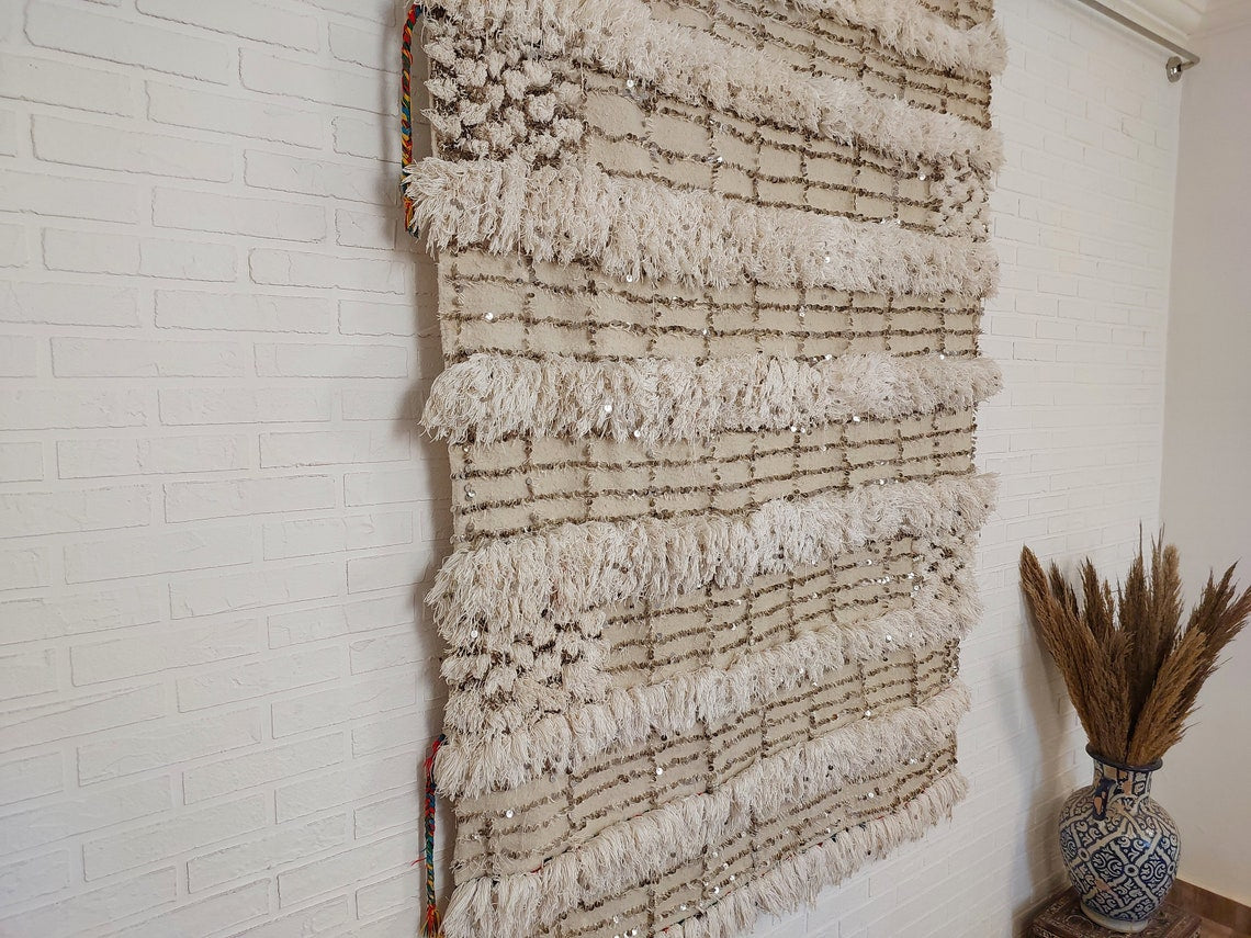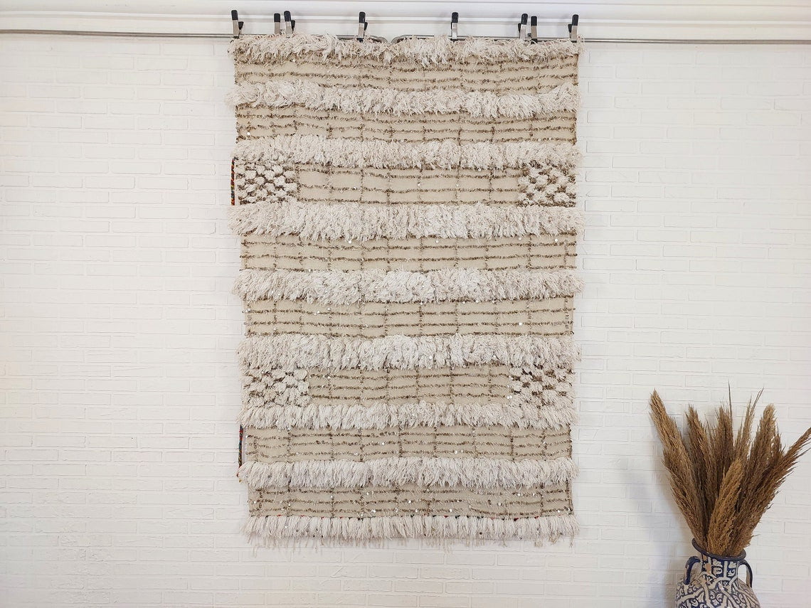 Wedding Blanket Moroccan Wool Cotton Throw With Sequins, Neutral Boho Berber Bed Cover Or Wall Tapestry Decor