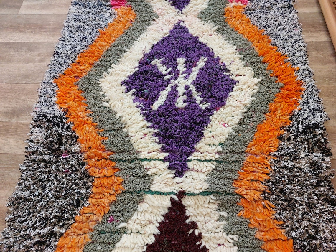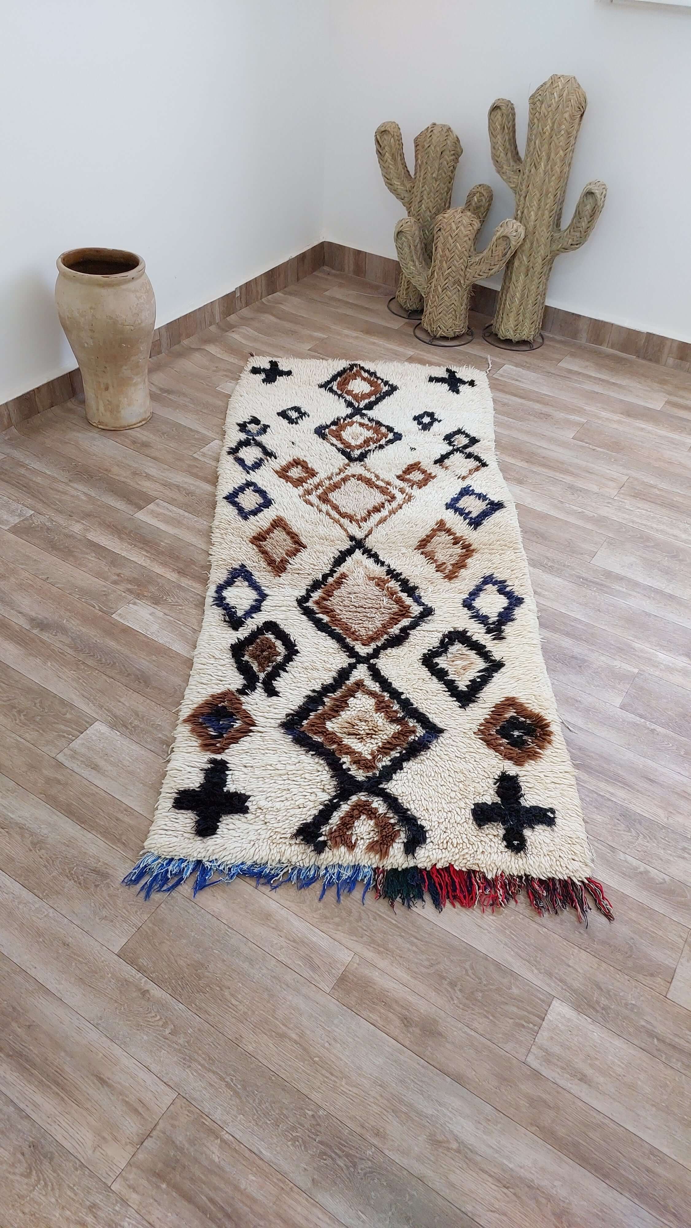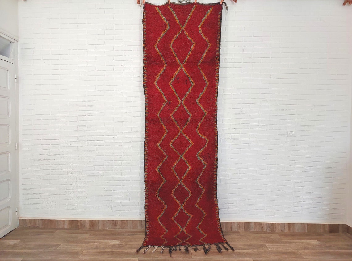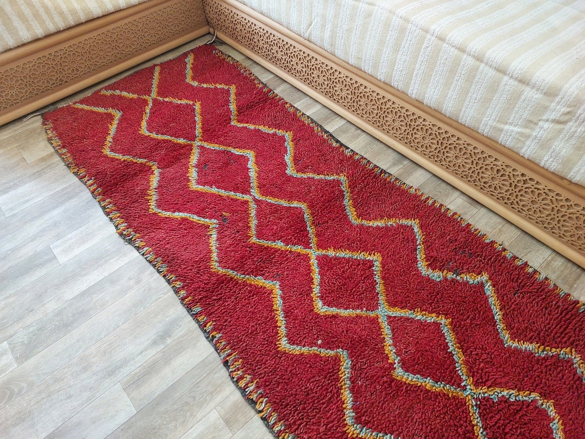 Small Moroccan Rug - Vintage Azilal Runner Rug - Handknotted Bedside Rug - Used Berber Rug .
