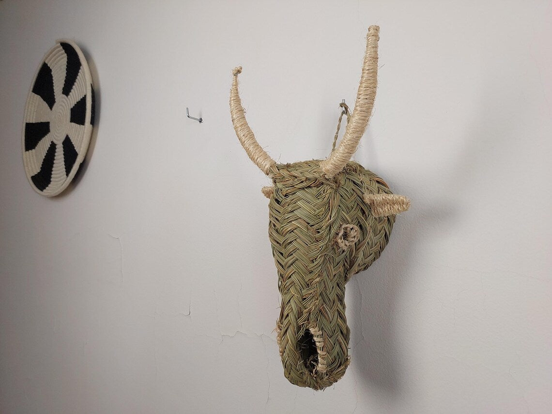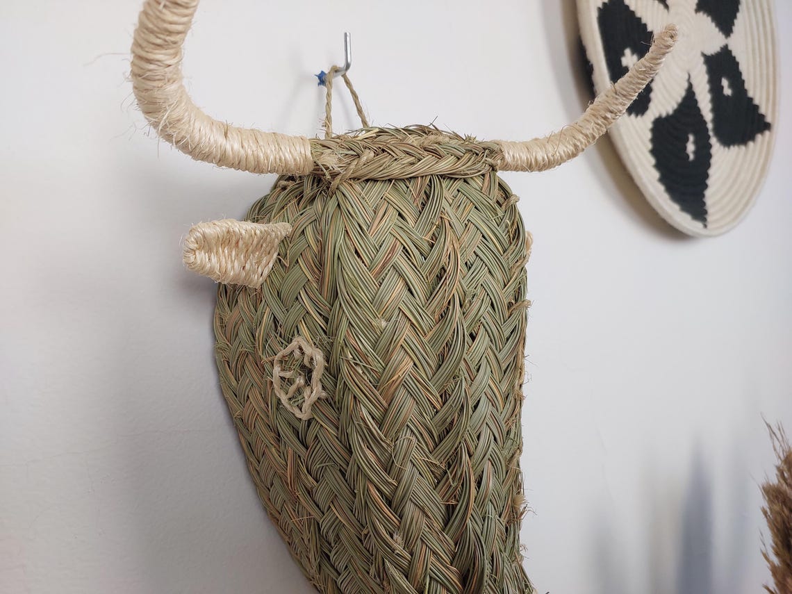 Straw Bull Head Wall Hanging – Custom Handmade Rattan Wall Art, Rustic Boho Animal Head Decor, Moroccan Palm Leaf Trophy