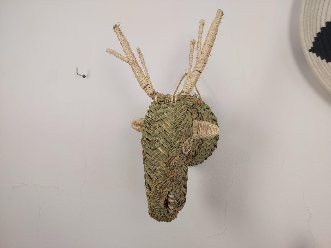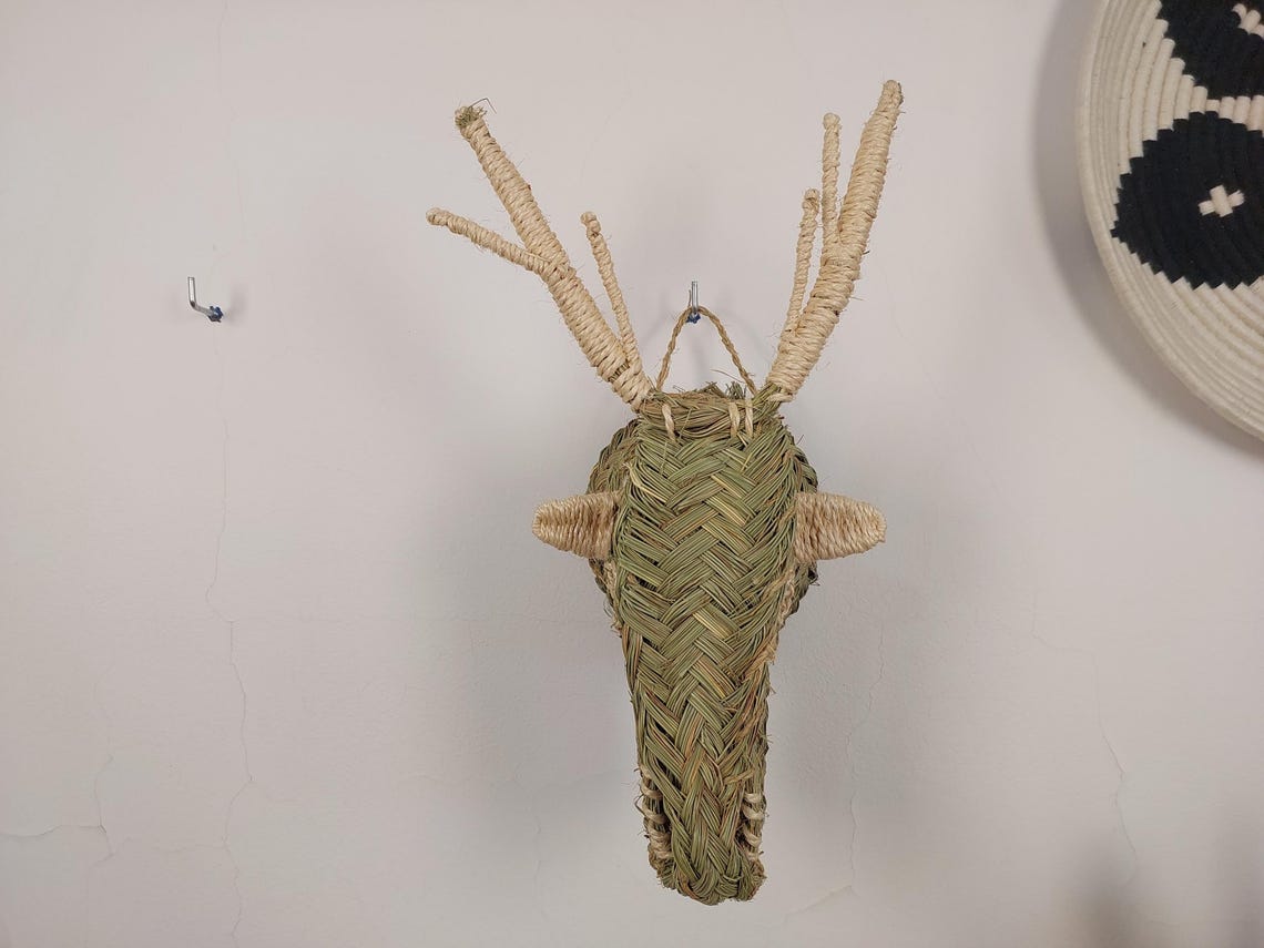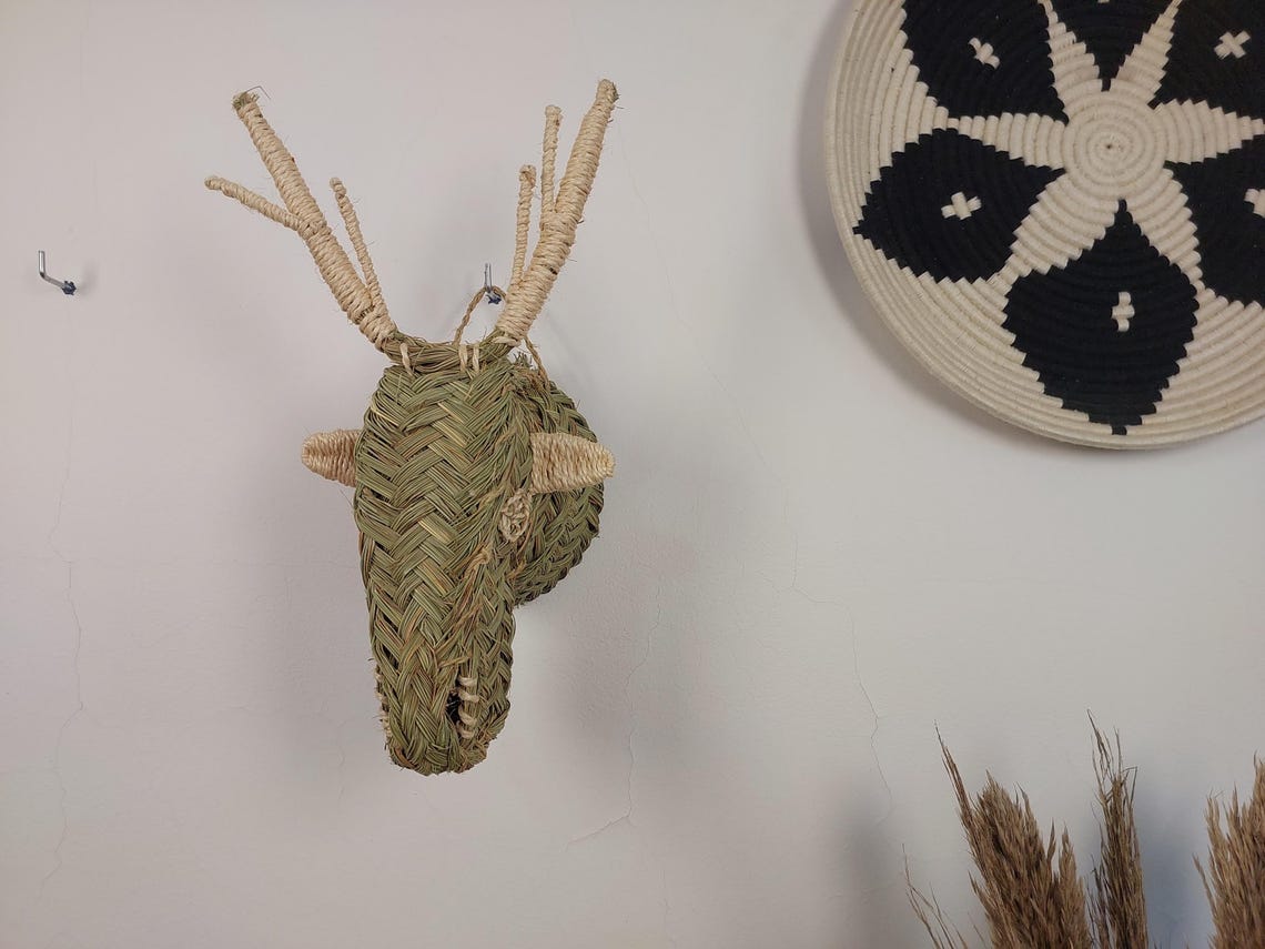 Straw Deer Head Wall Hanging – Custom Handmade Rattan Wall Art, Rustic Boho Animal Head Decor, Moroccan Palm Leaf Trophy