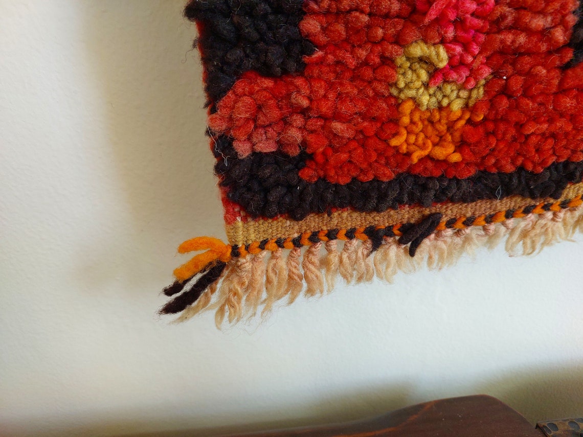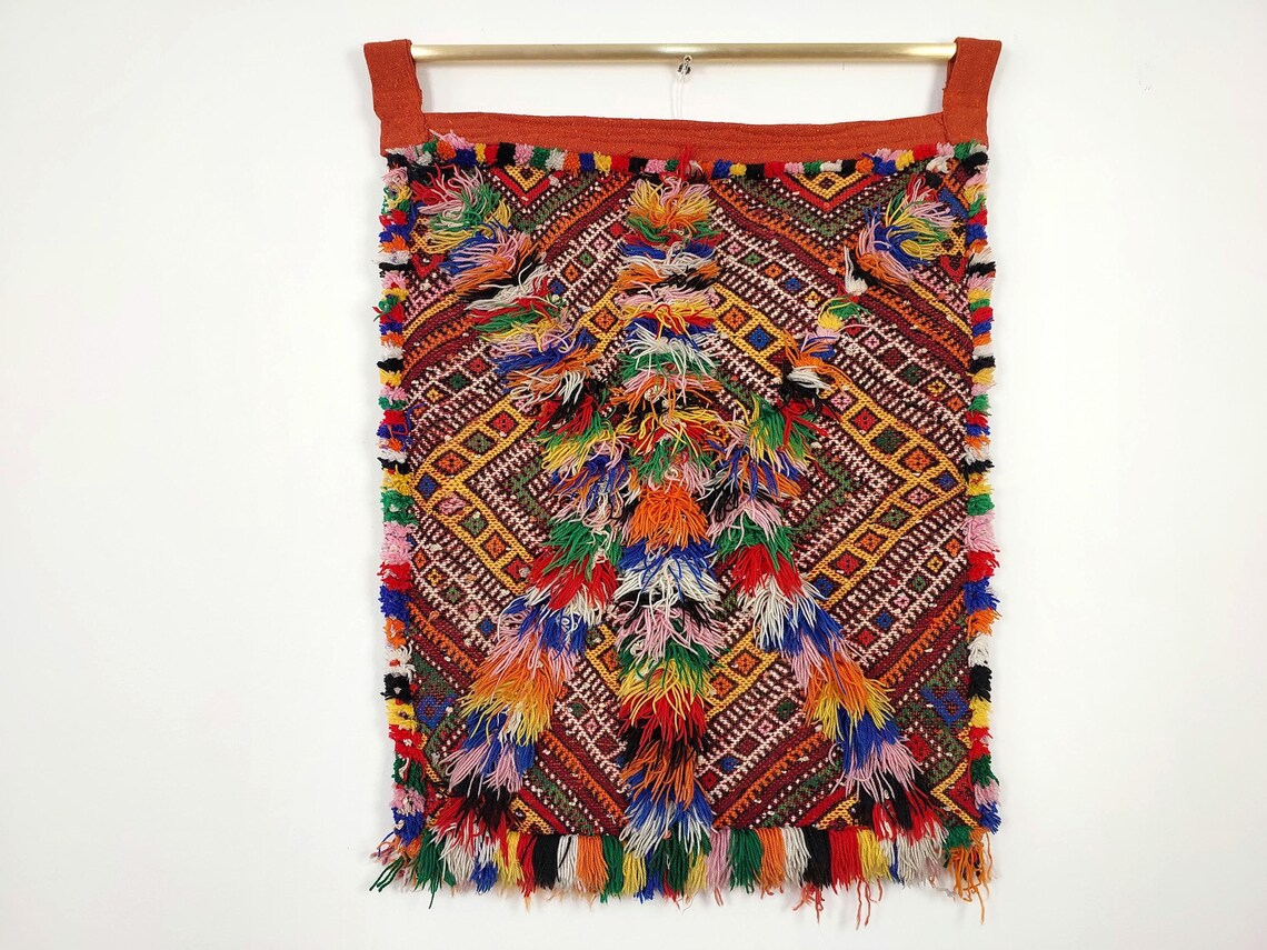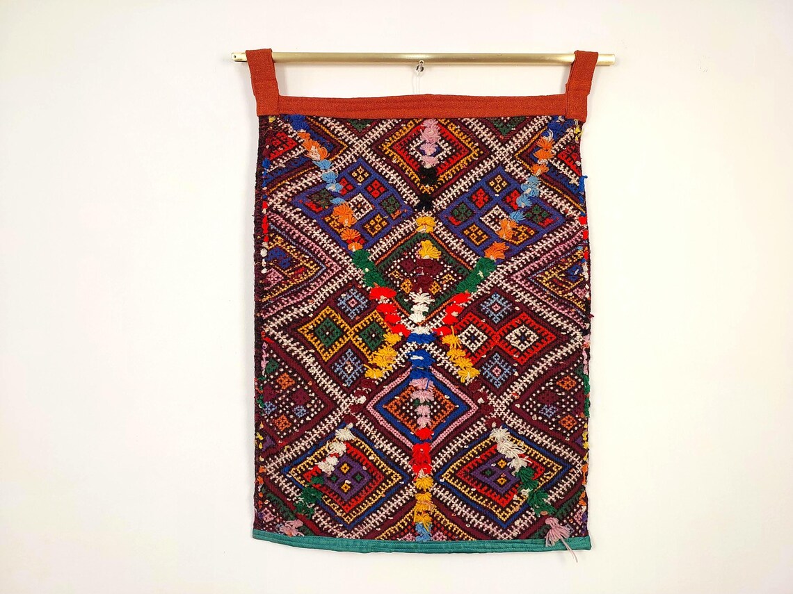 Vintage Berber Handwoven Wool Wall Art: Colorful Rectangular Hanging Pillow With Tribal Amazigh Symbols