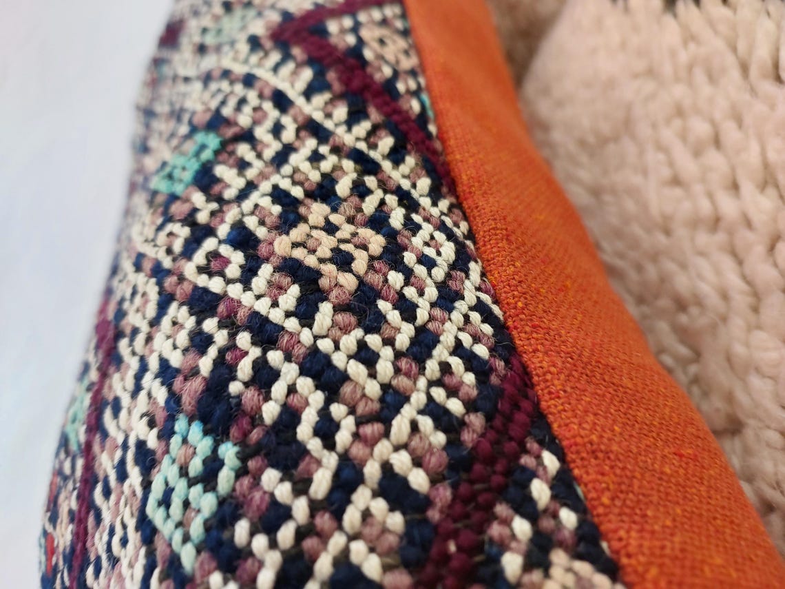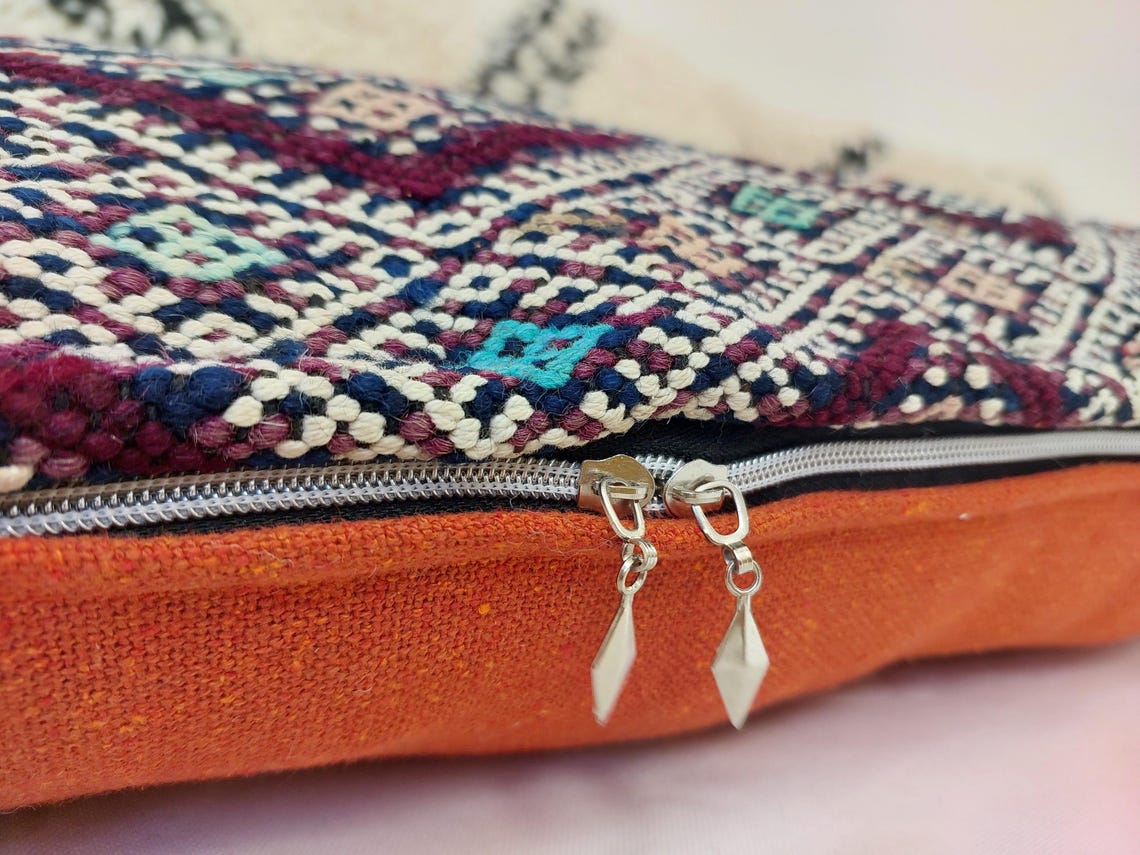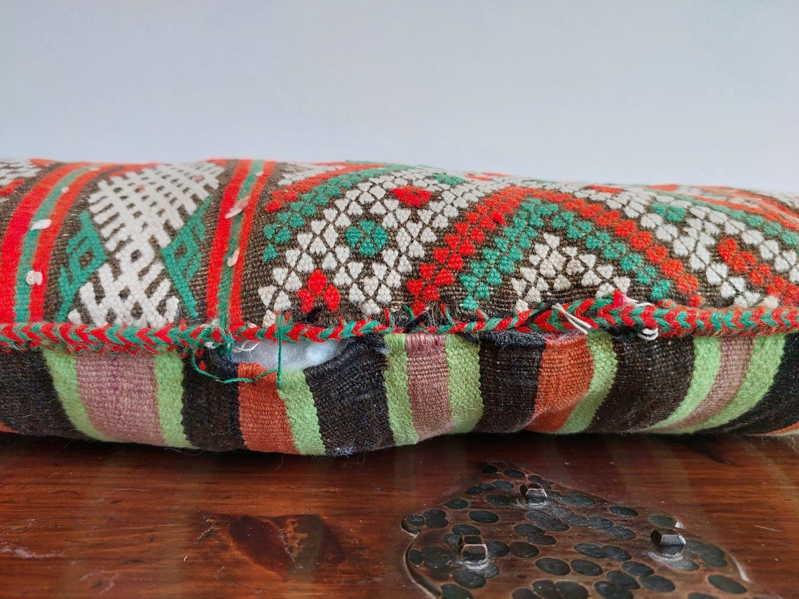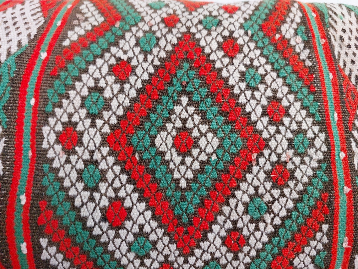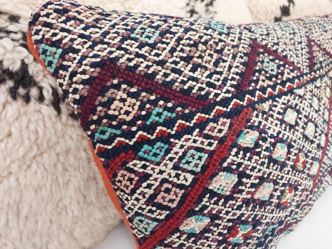 Unique Moroccan Kilim Lumbar Cushion | 12x32 Inches | Rectangular | Vintage Colorful Berber Decorative Pillow