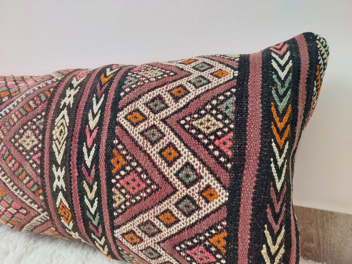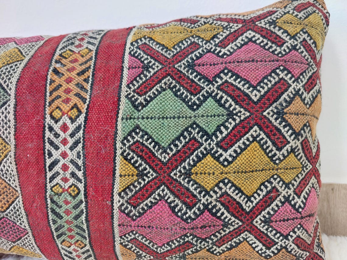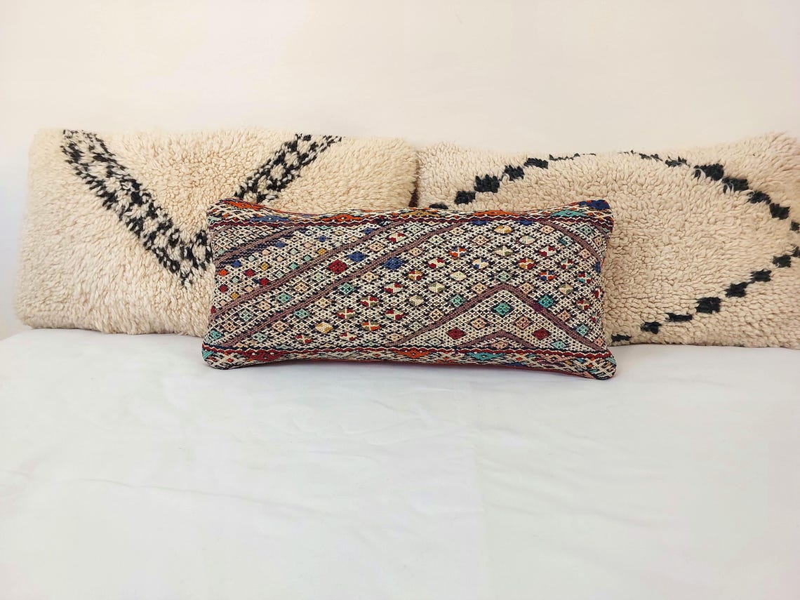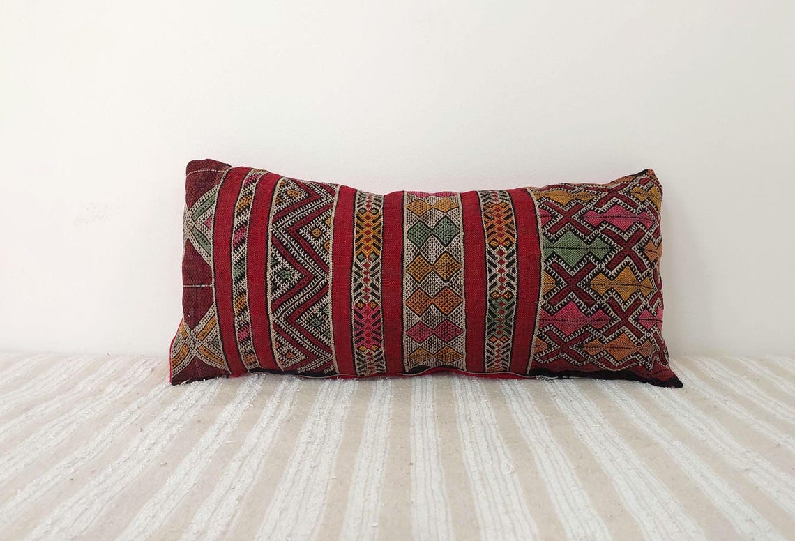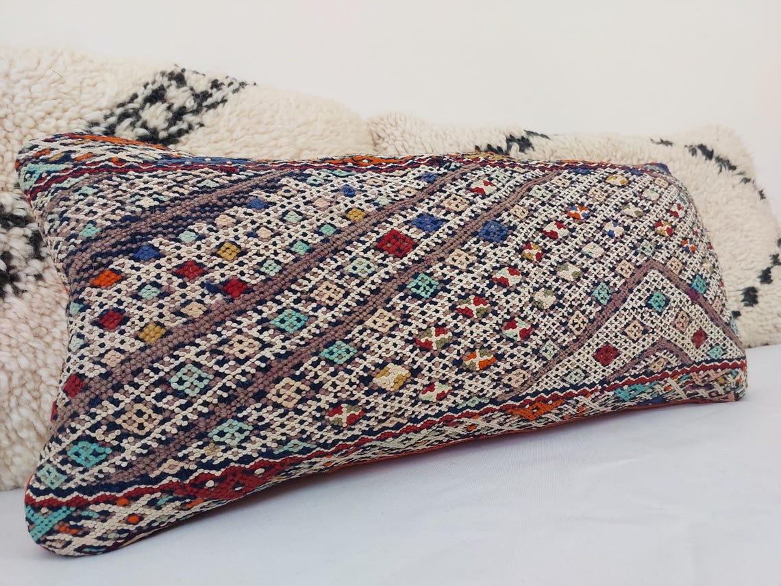 Unique Moroccan Kilim Lumbar Cushion 13x24 Inches - Vintage Berber Decorative Pillow