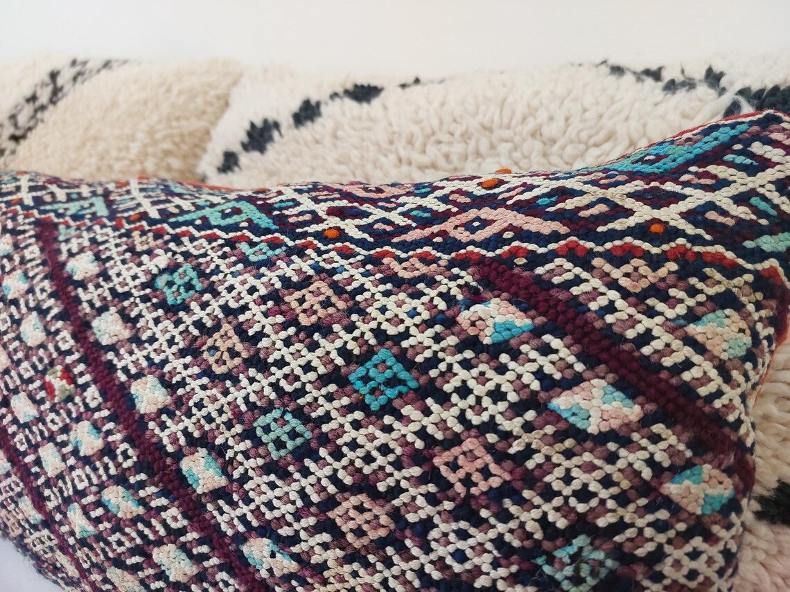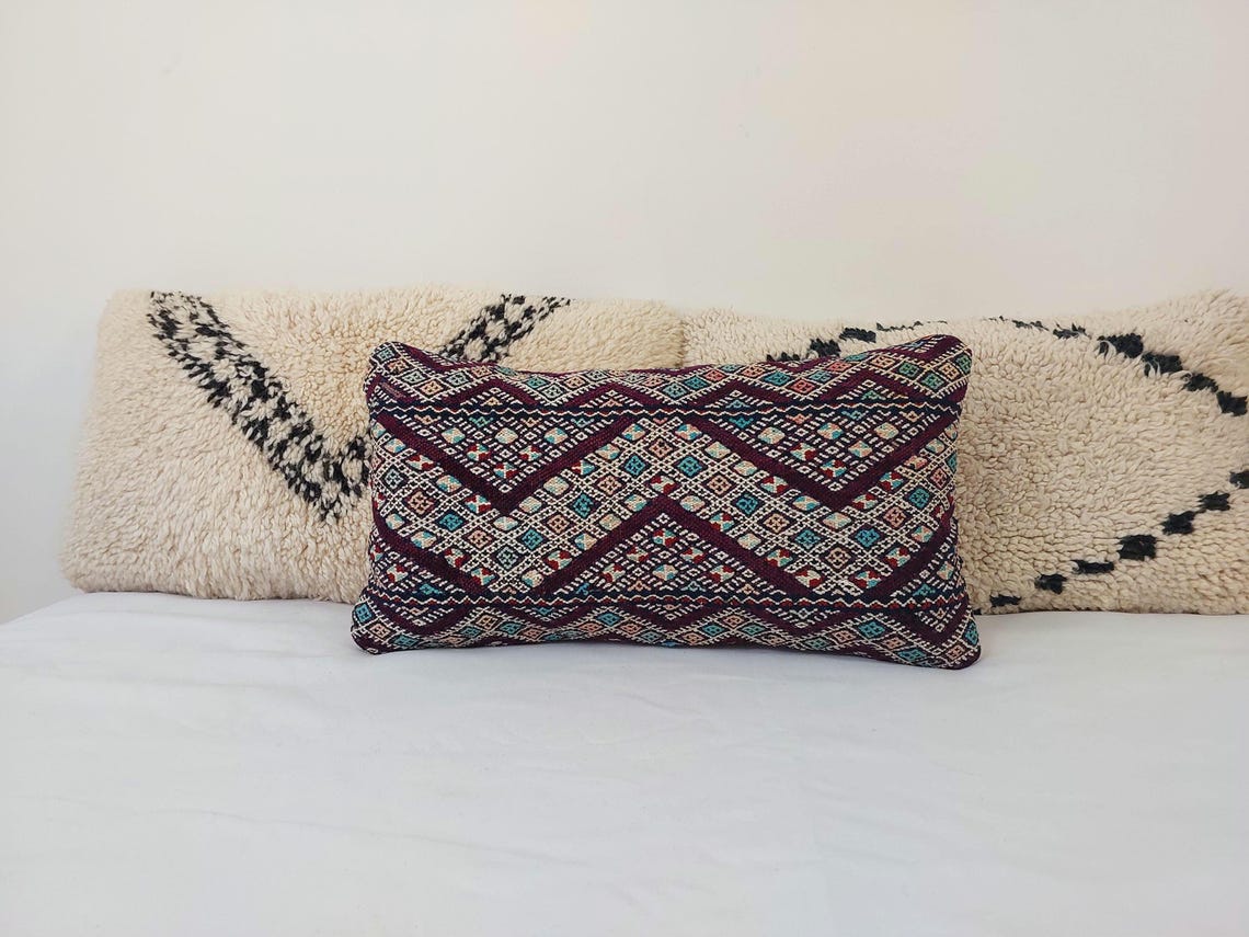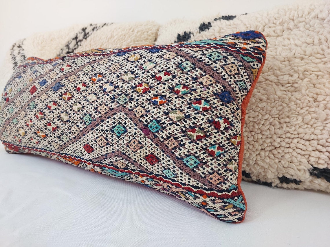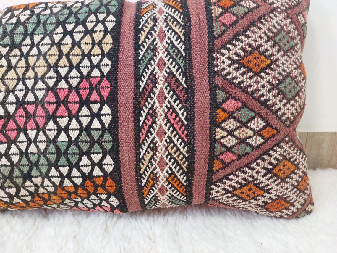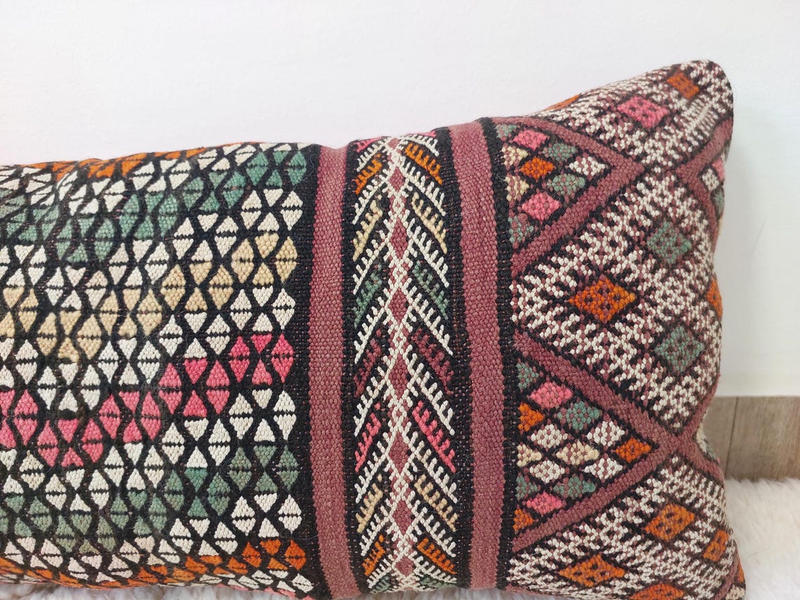 Unique Moroccan Kilim Lumbar Cushion 13x24 Inches - Vintage Berber Decorative Pillow