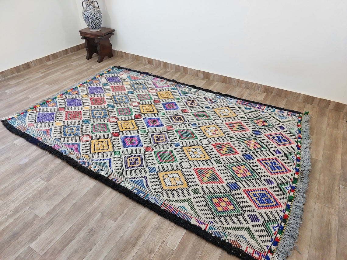 Vibrant Taznakht Moroccan Wool Kilim: Handmade Flatweave Rug for Modern Home Decor