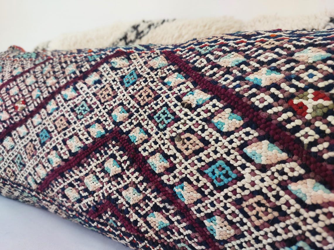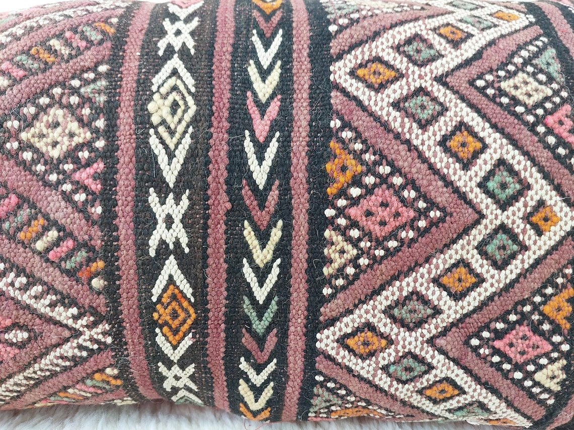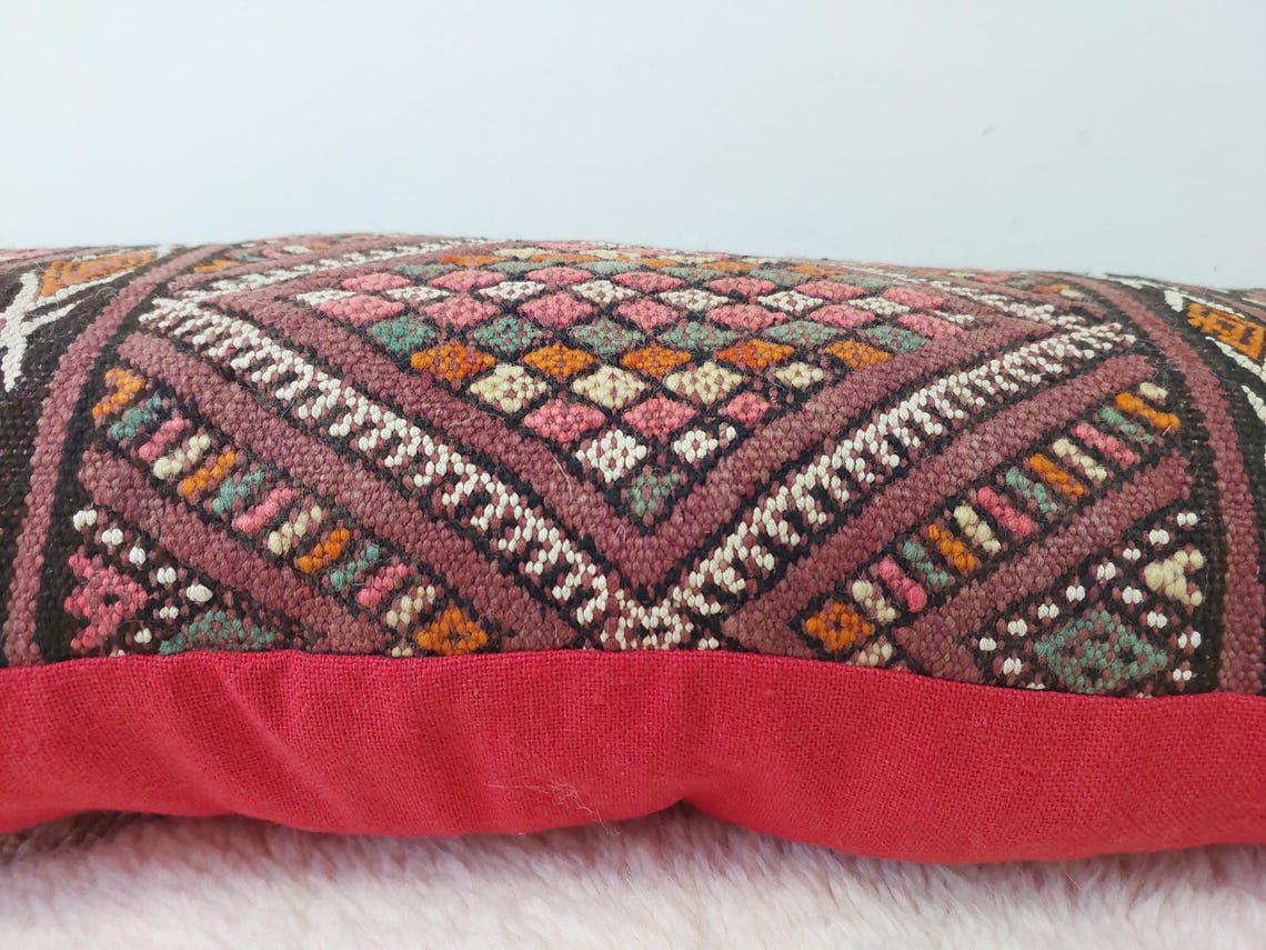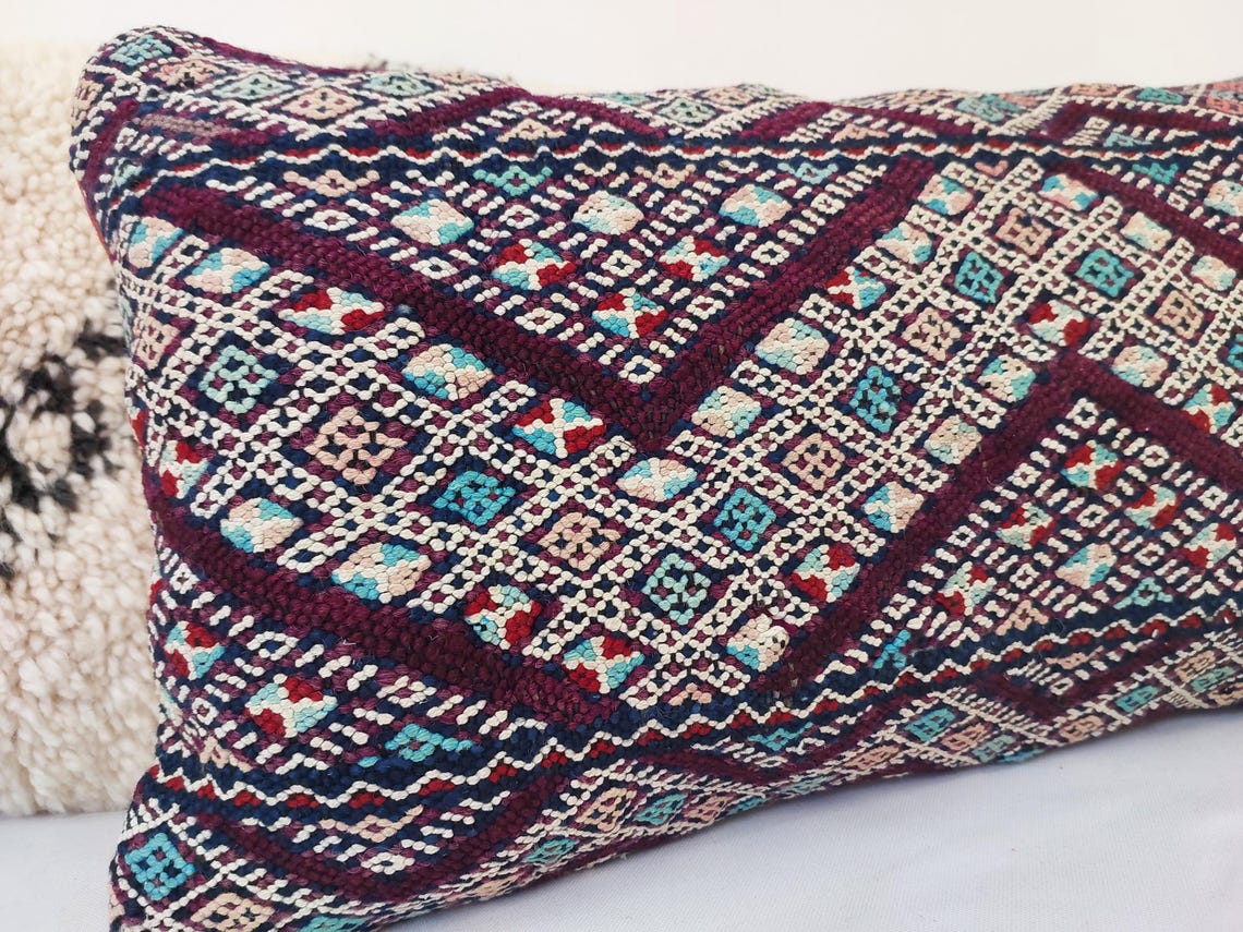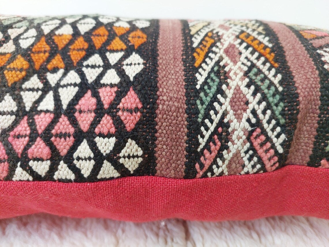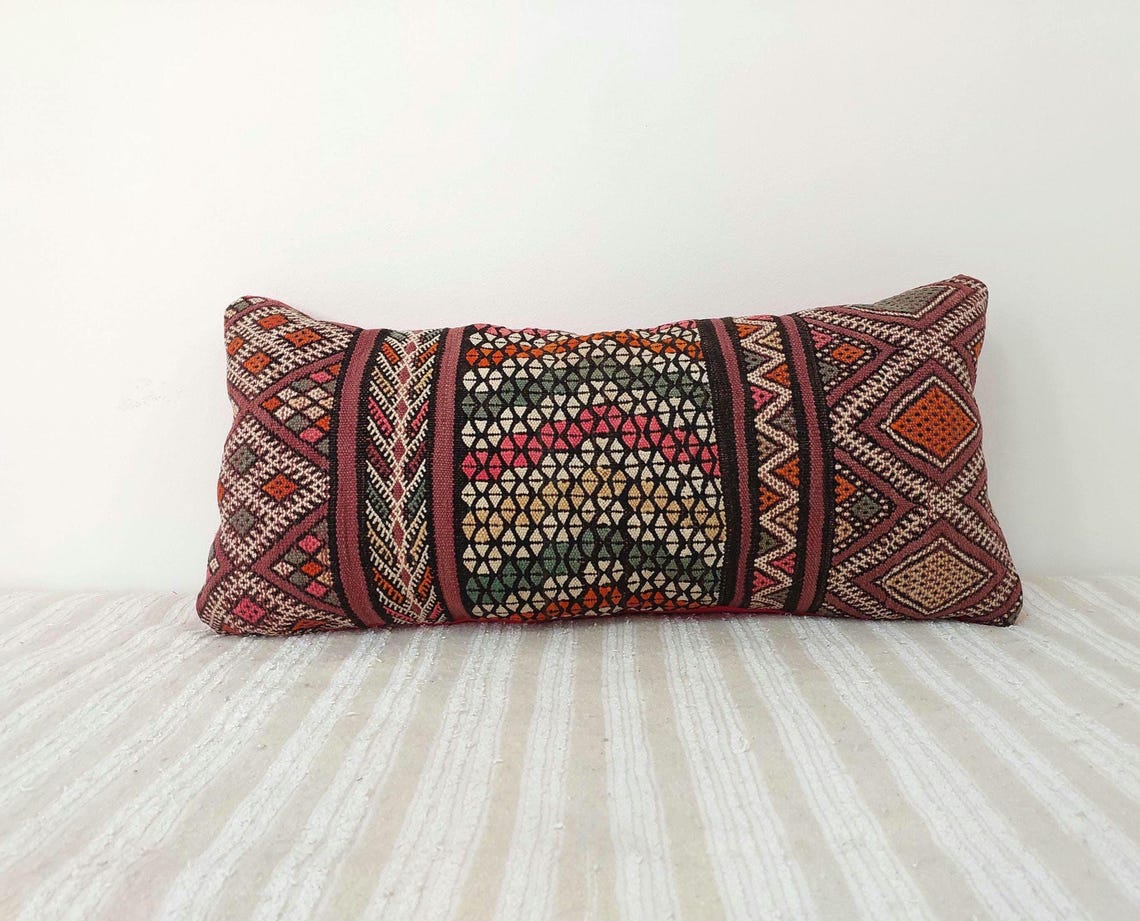 Unique Moroccan Kilim Lumbar Cushion 12x25 Inches - Vintage Berber Decorative Pillow