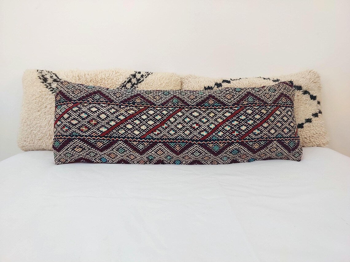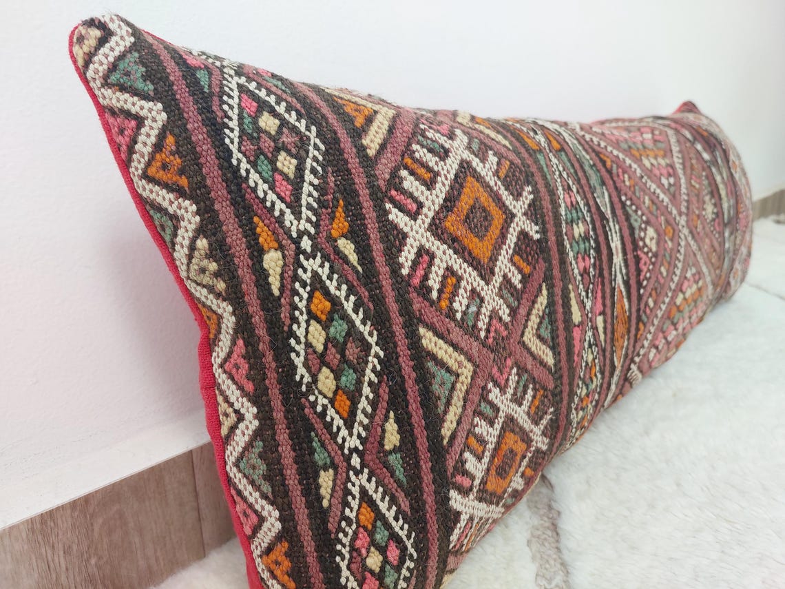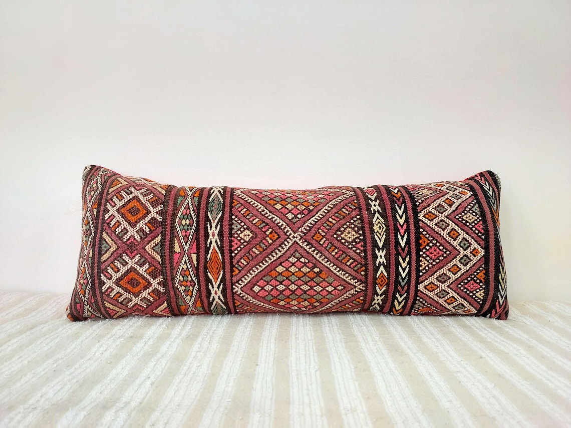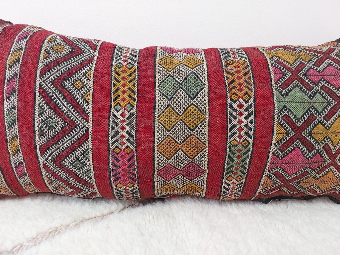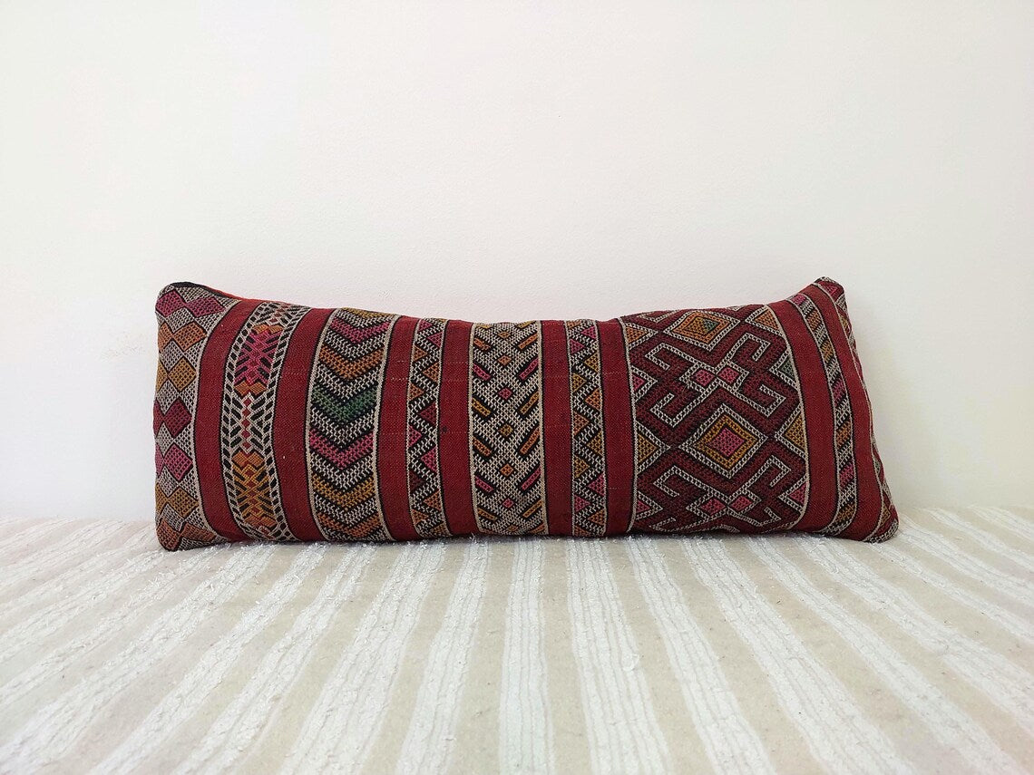 Unique Moroccan Kilim Lumbar Cushion 13x40 Inches - Vintage Berber Decorative Pillow