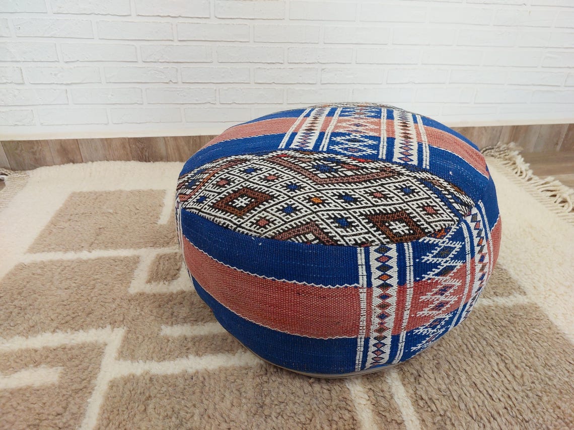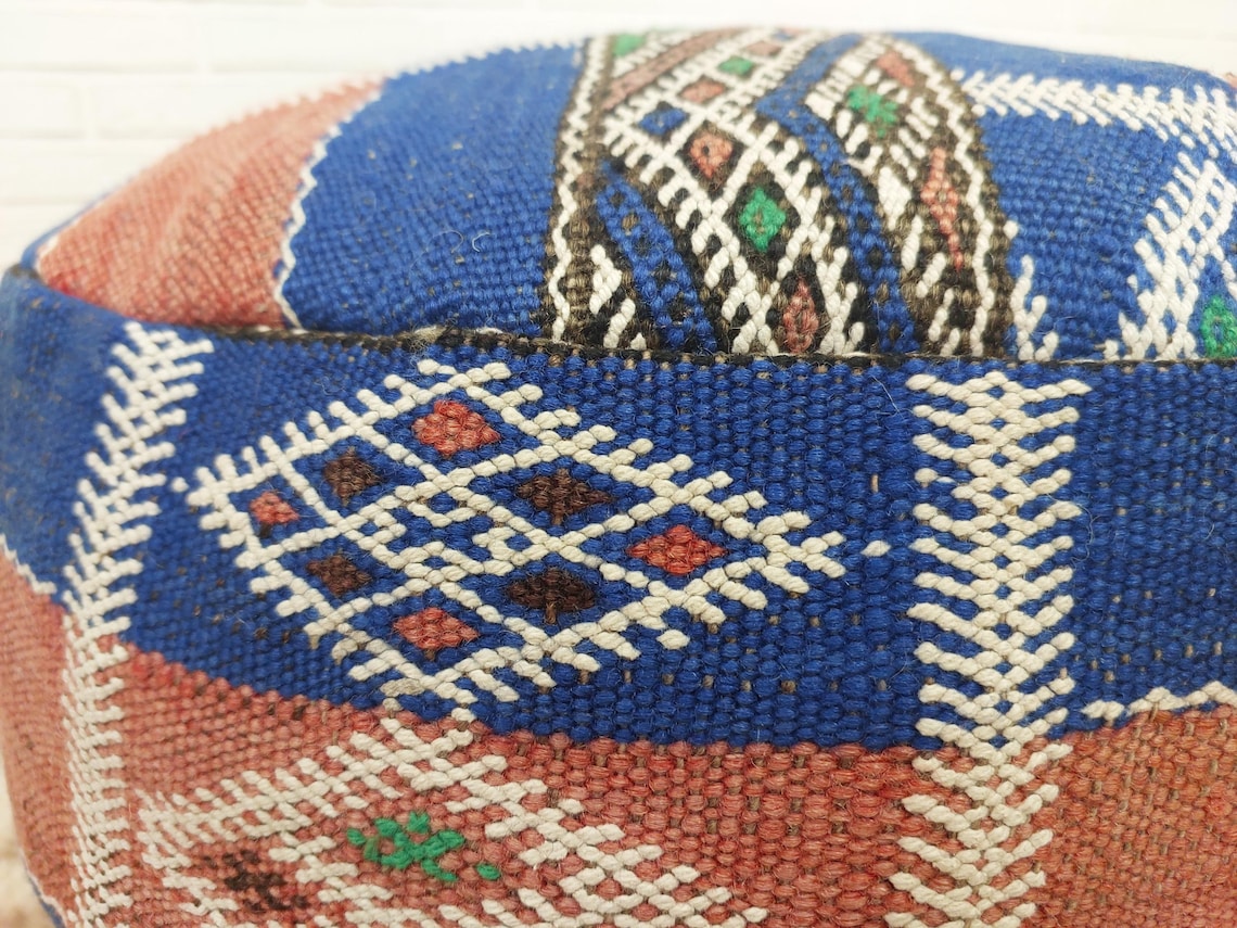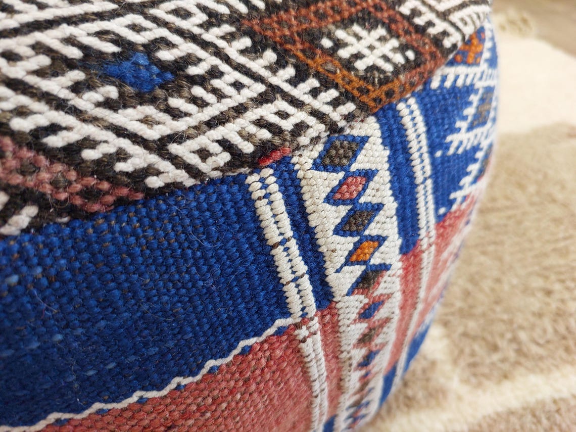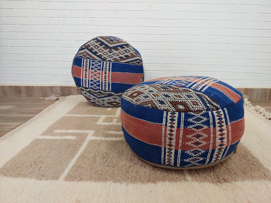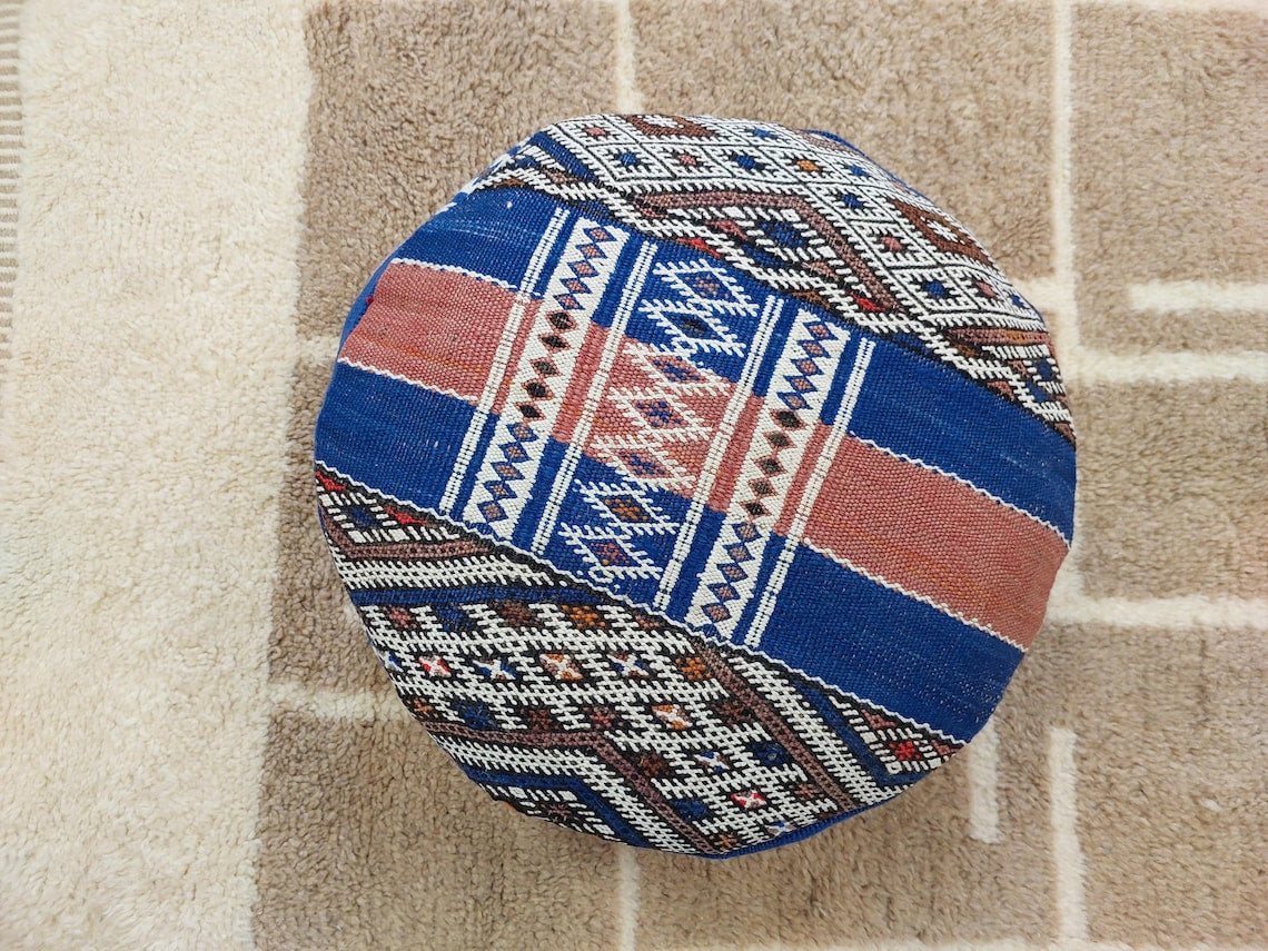 Vintage Berber Kilim Round Ottoman Pouf: Handmade Moroccan Floor Cushion For Boho Home Decor