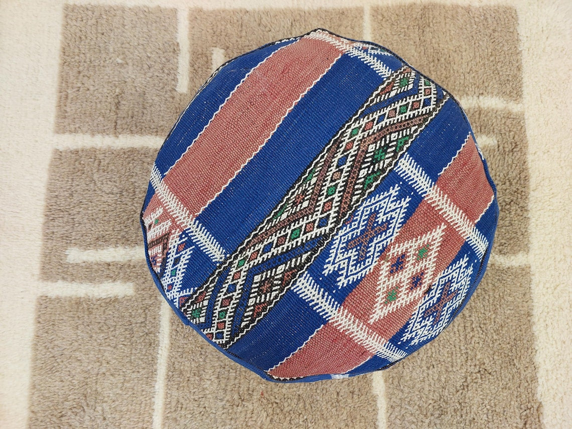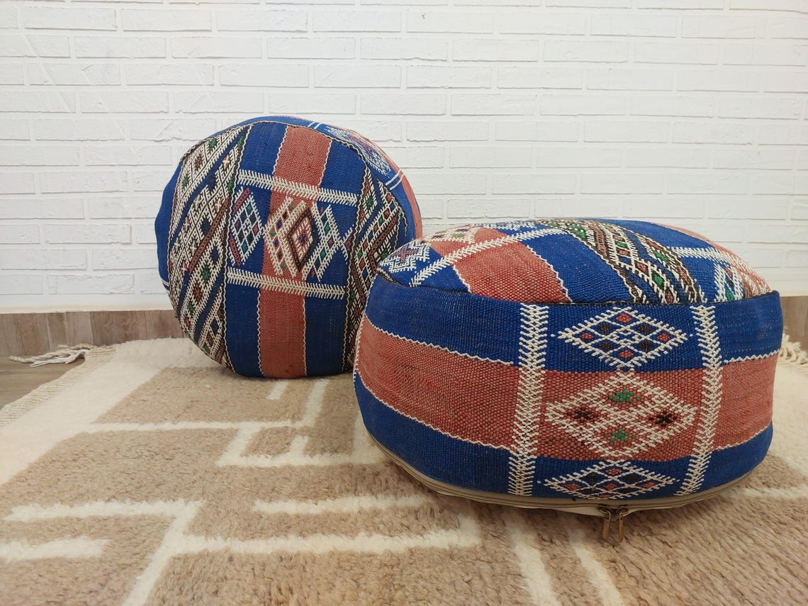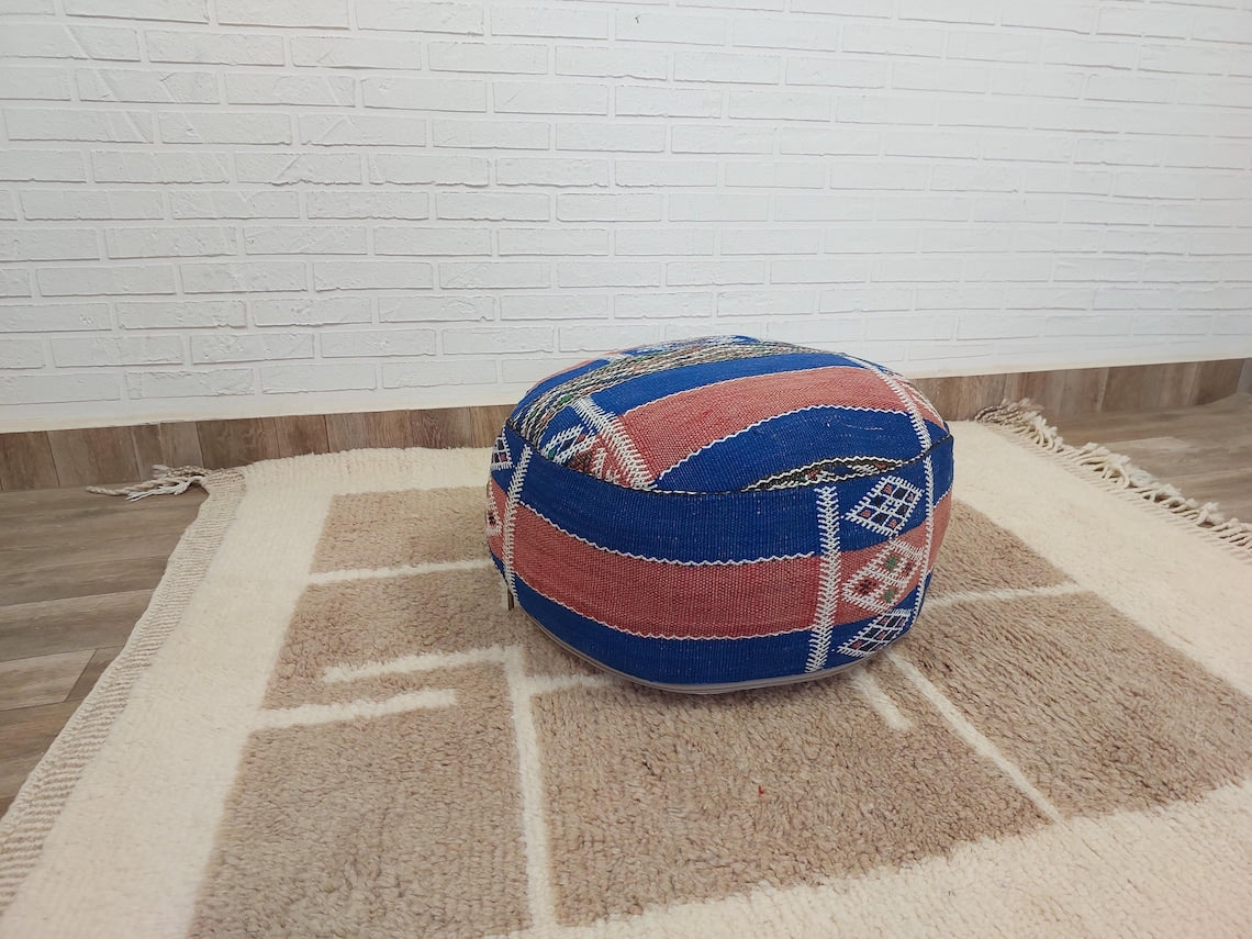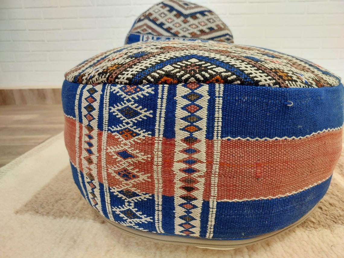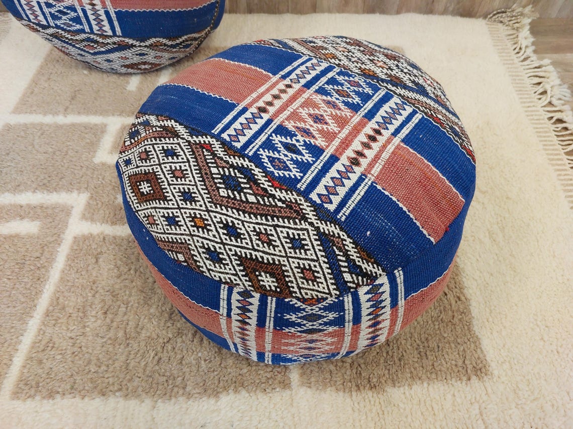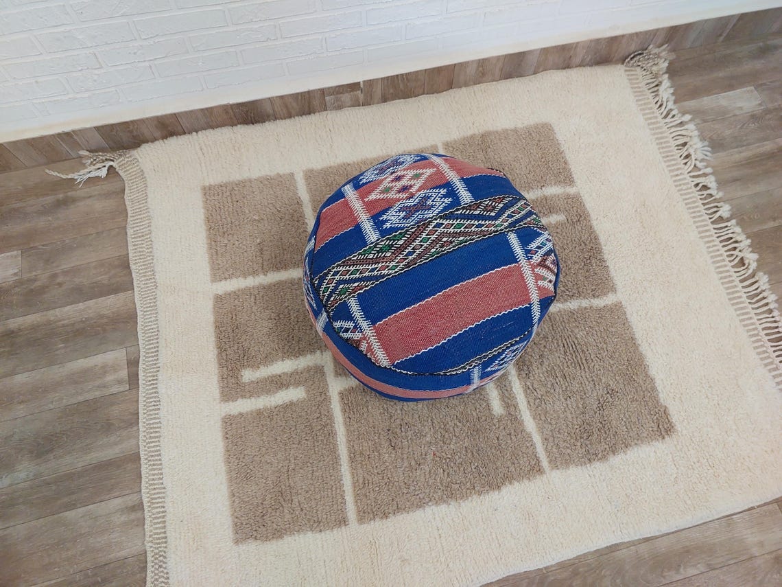 Vintage Berber Kilim Round Ottoman Pouf: Handmade Moroccan Floor Cushion For Boho Home Decor