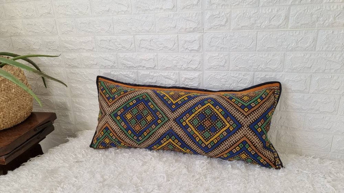 Vintage Moroccan Kilim Lumbar Pillow - Handwoven Berber Marmoucha Cushion Cover 14x31 Inches