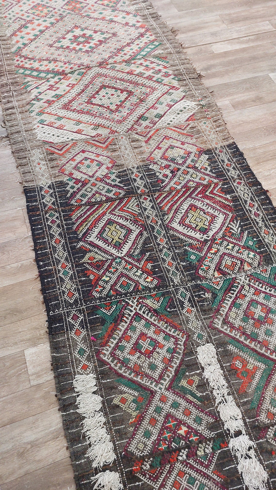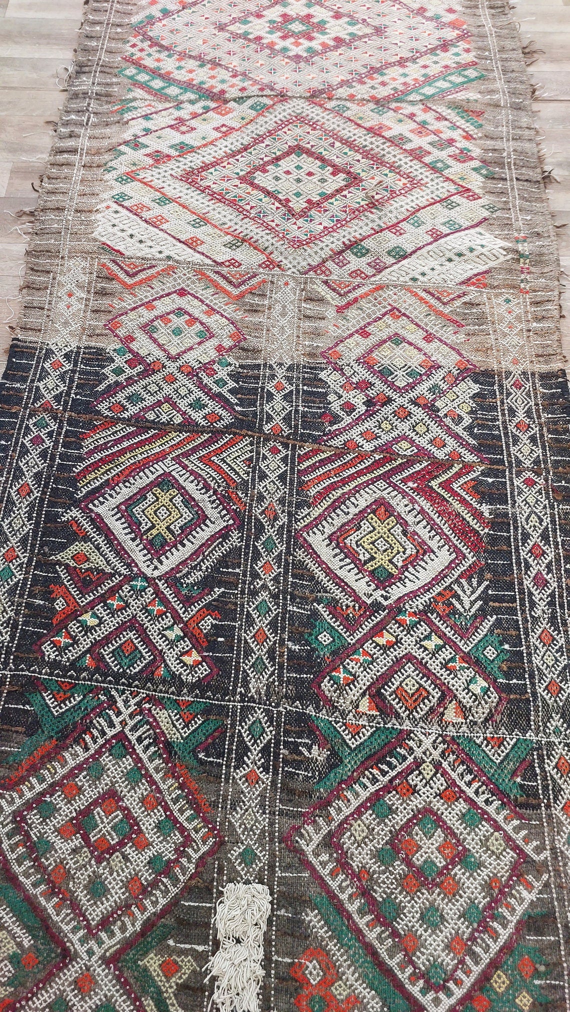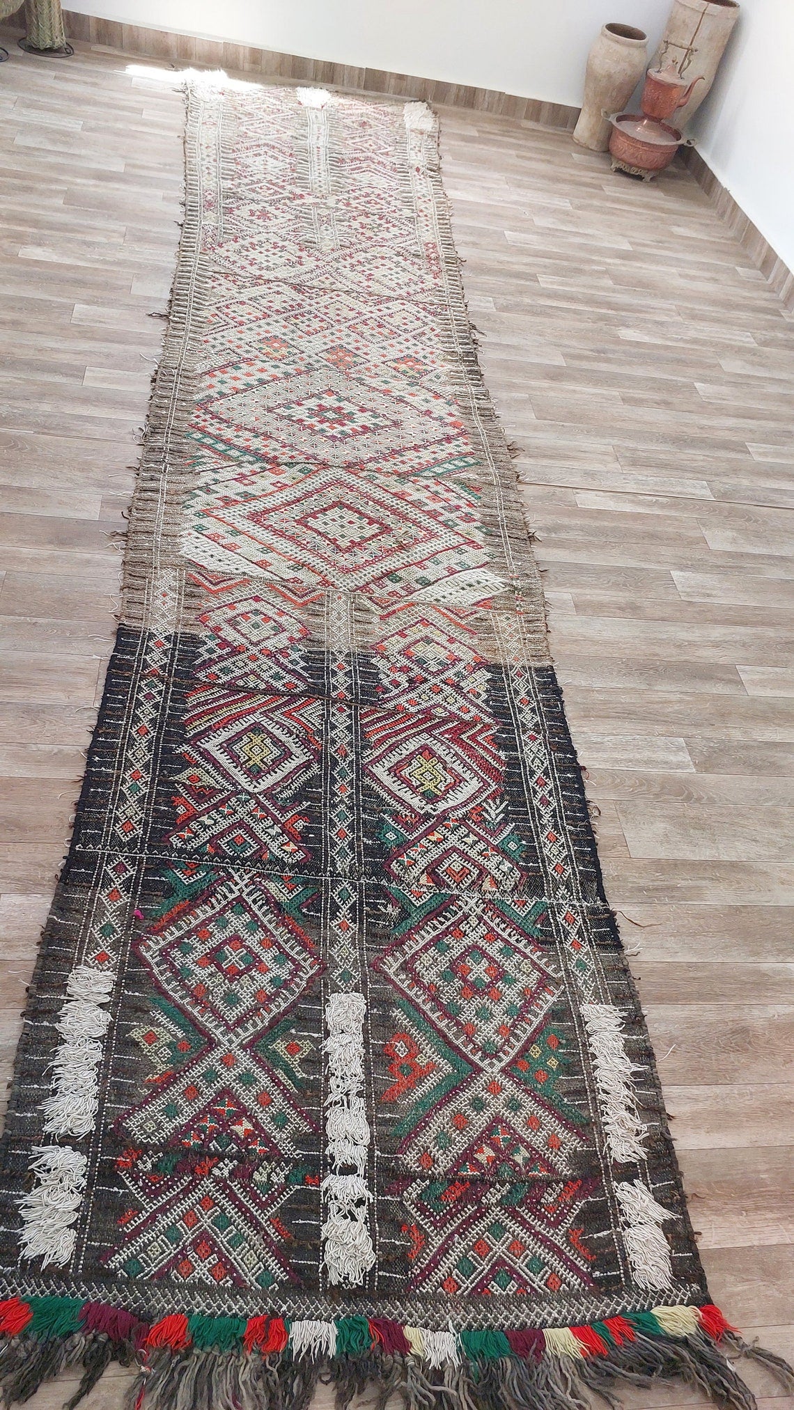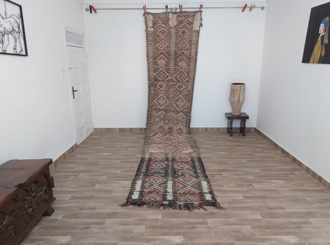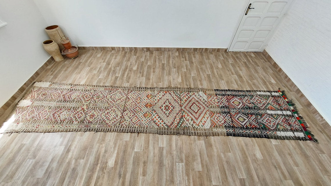 Vintage Moroccan Beni Mtir Kilim Runner: Handwoven Berber Tribal Rug for Boho Hallway Decor