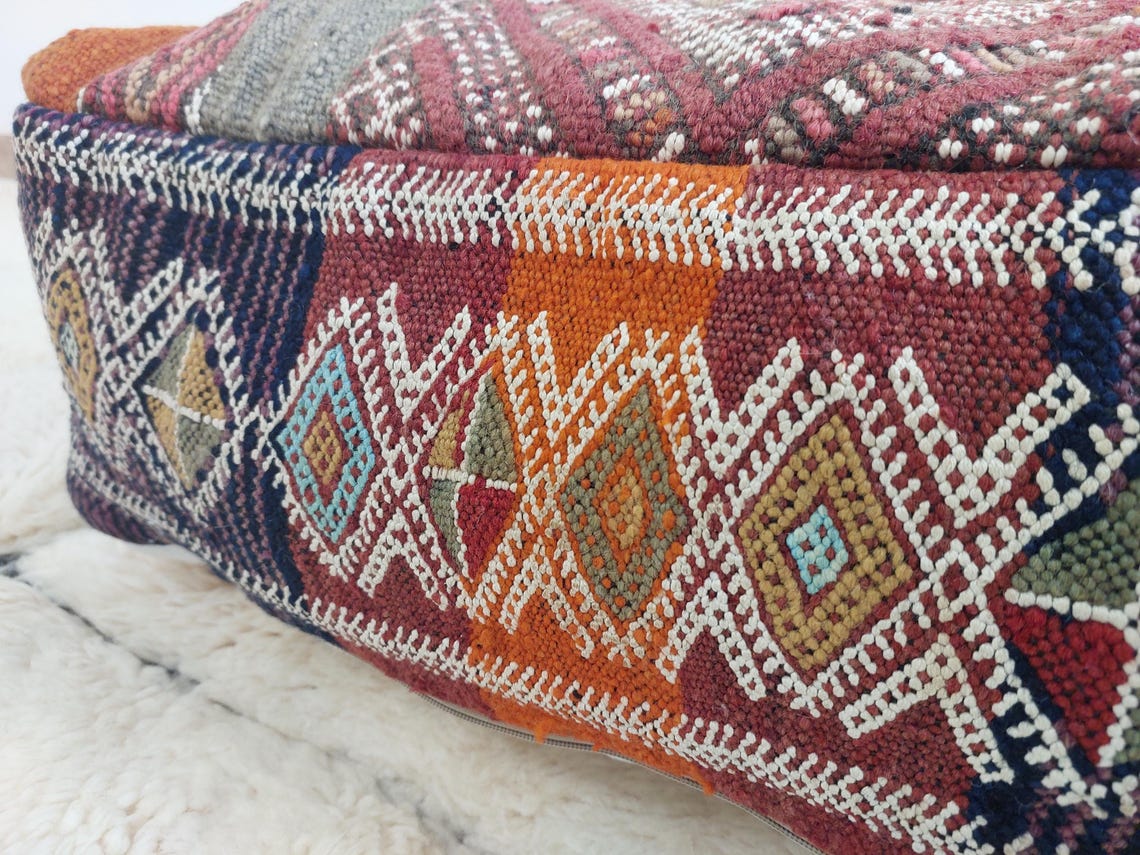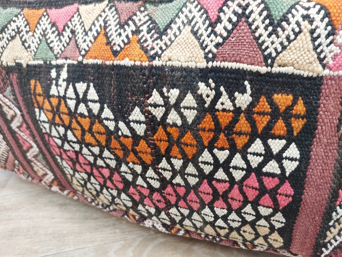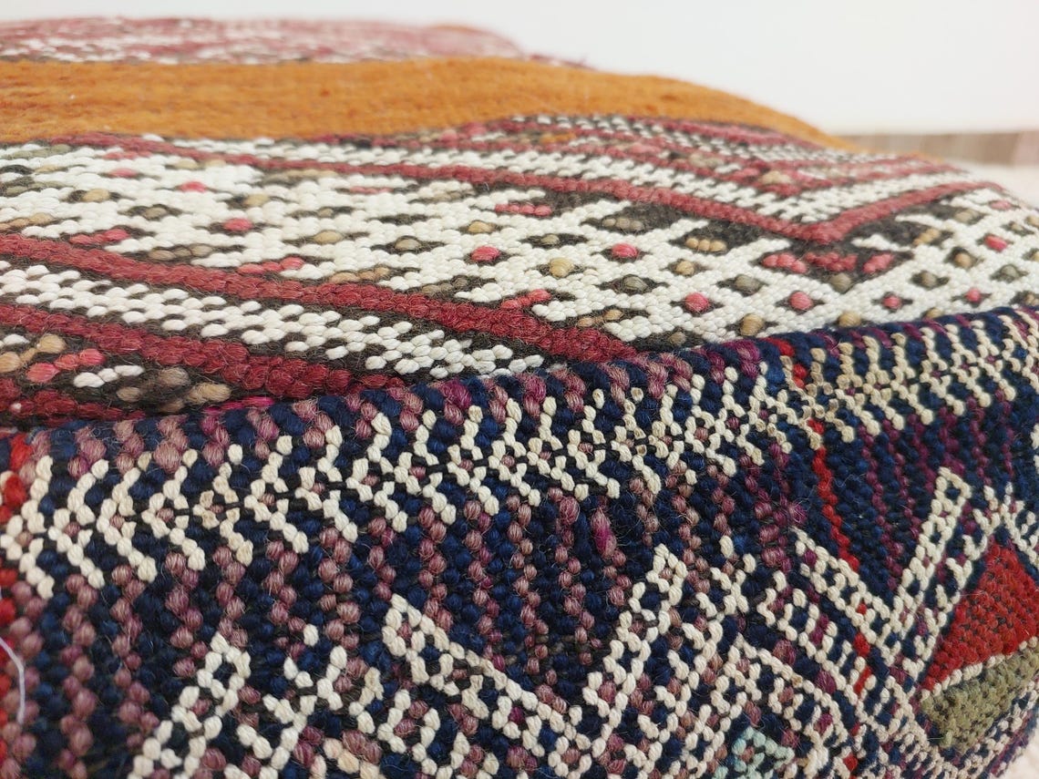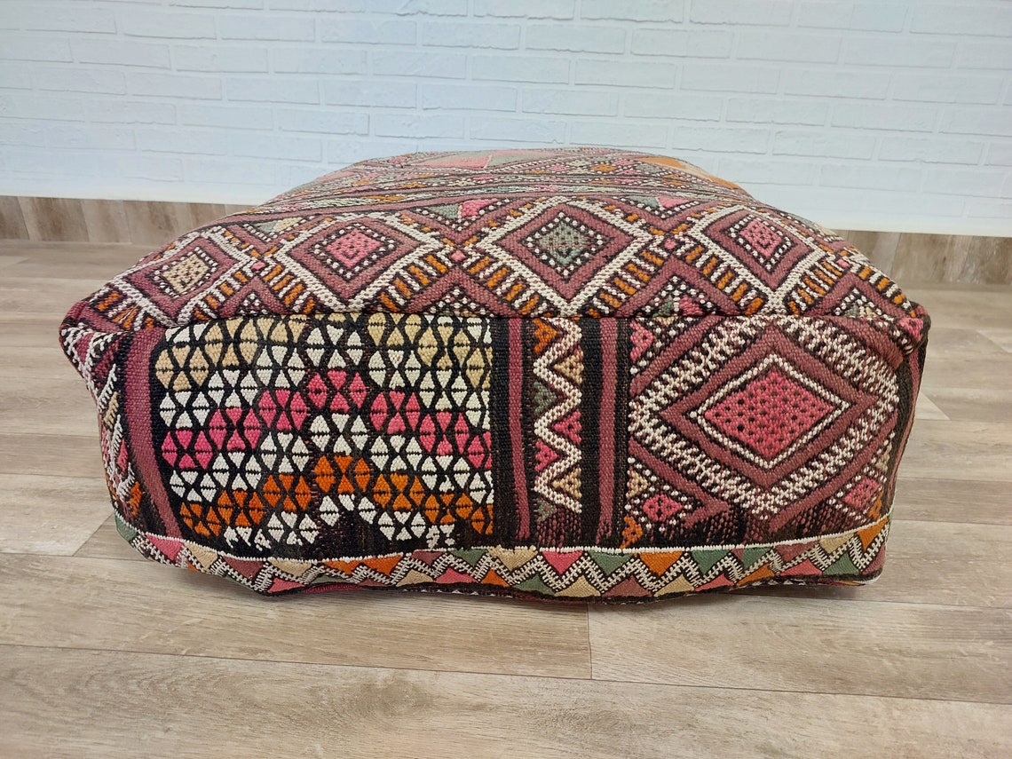 Vintage Moroccan Kilim Pouf: Handcrafted Berber Floor Ottoman, Colorful Wool Boujaad Cushion