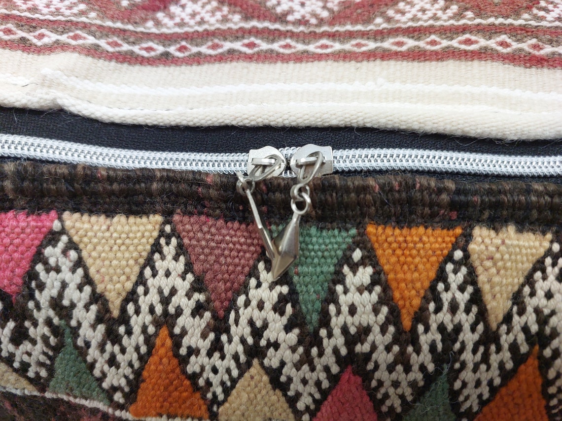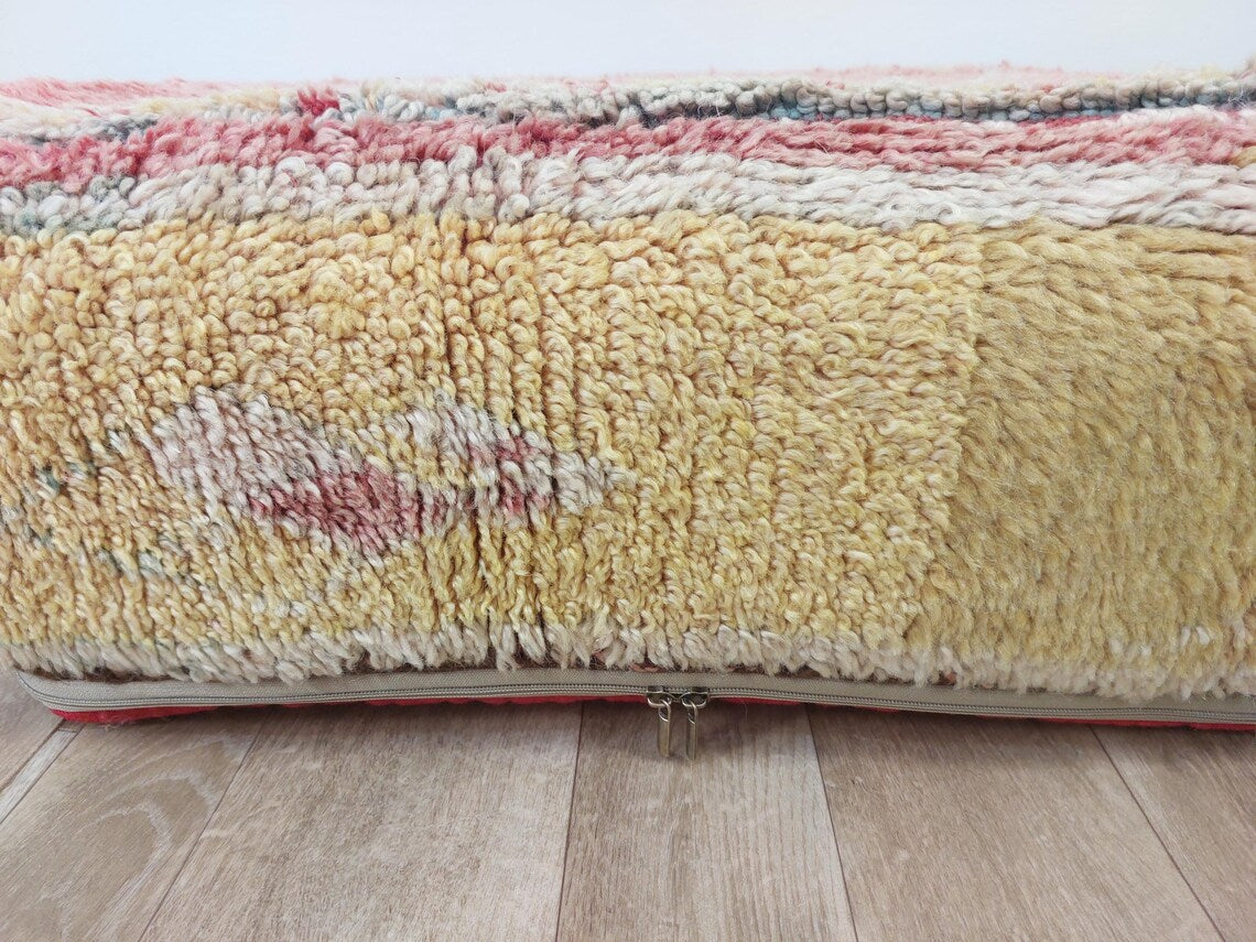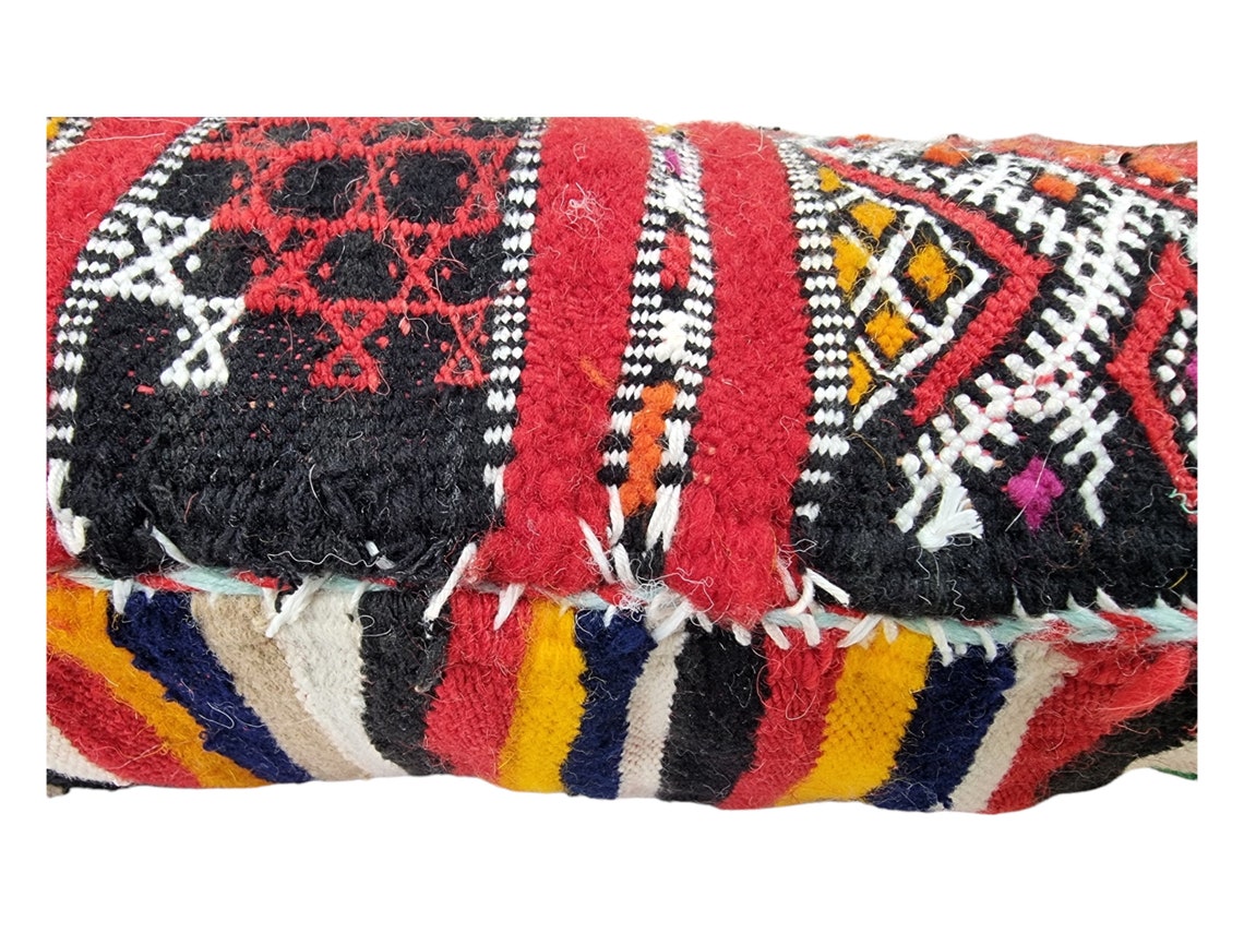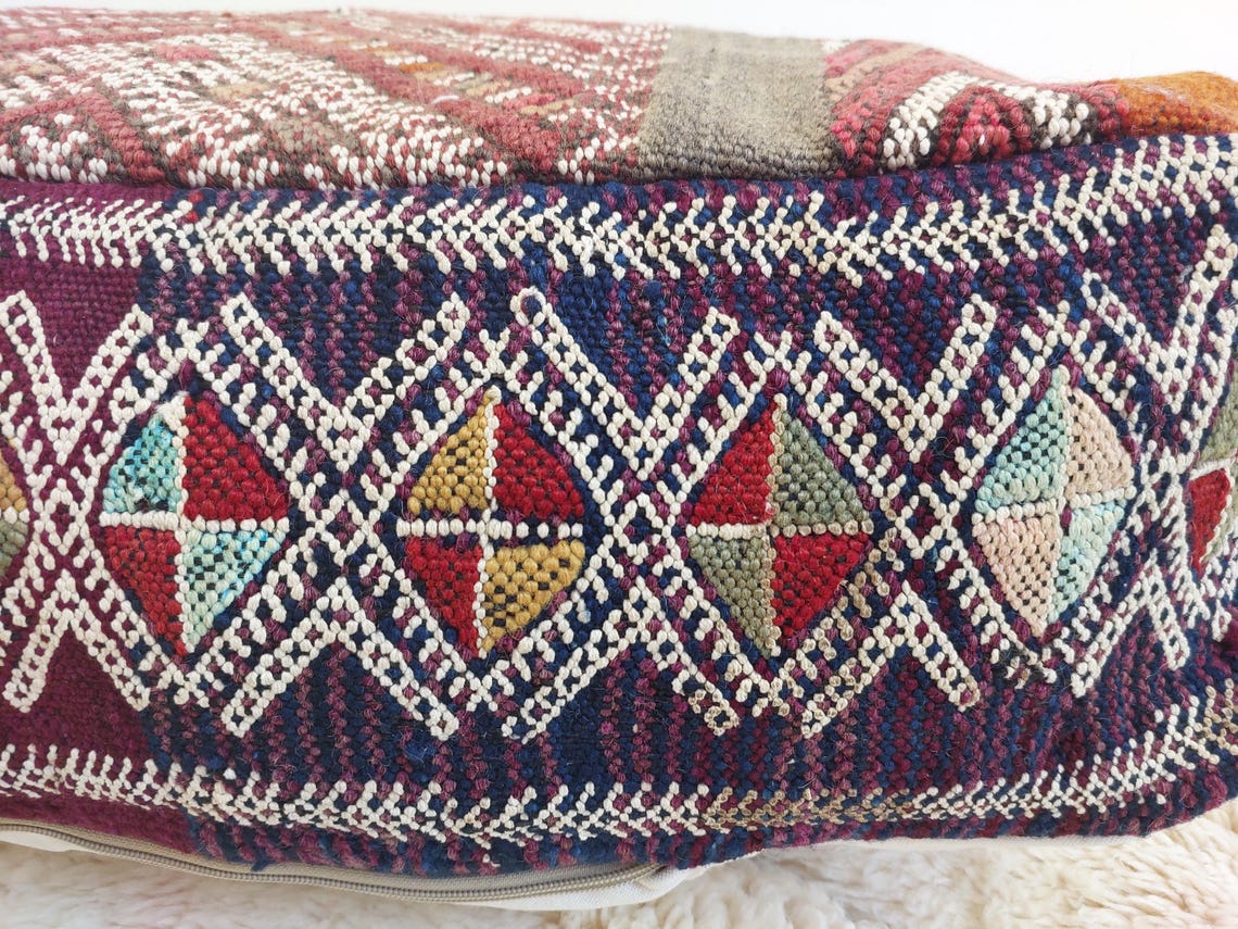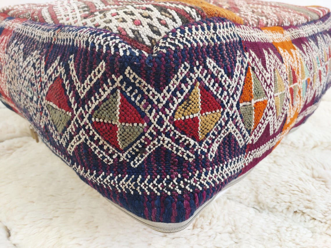 Vintage Moroccan Kilim Pouf: Handcrafted Berber Floor Ottoman, Colorful Wool Boujaad Cushion