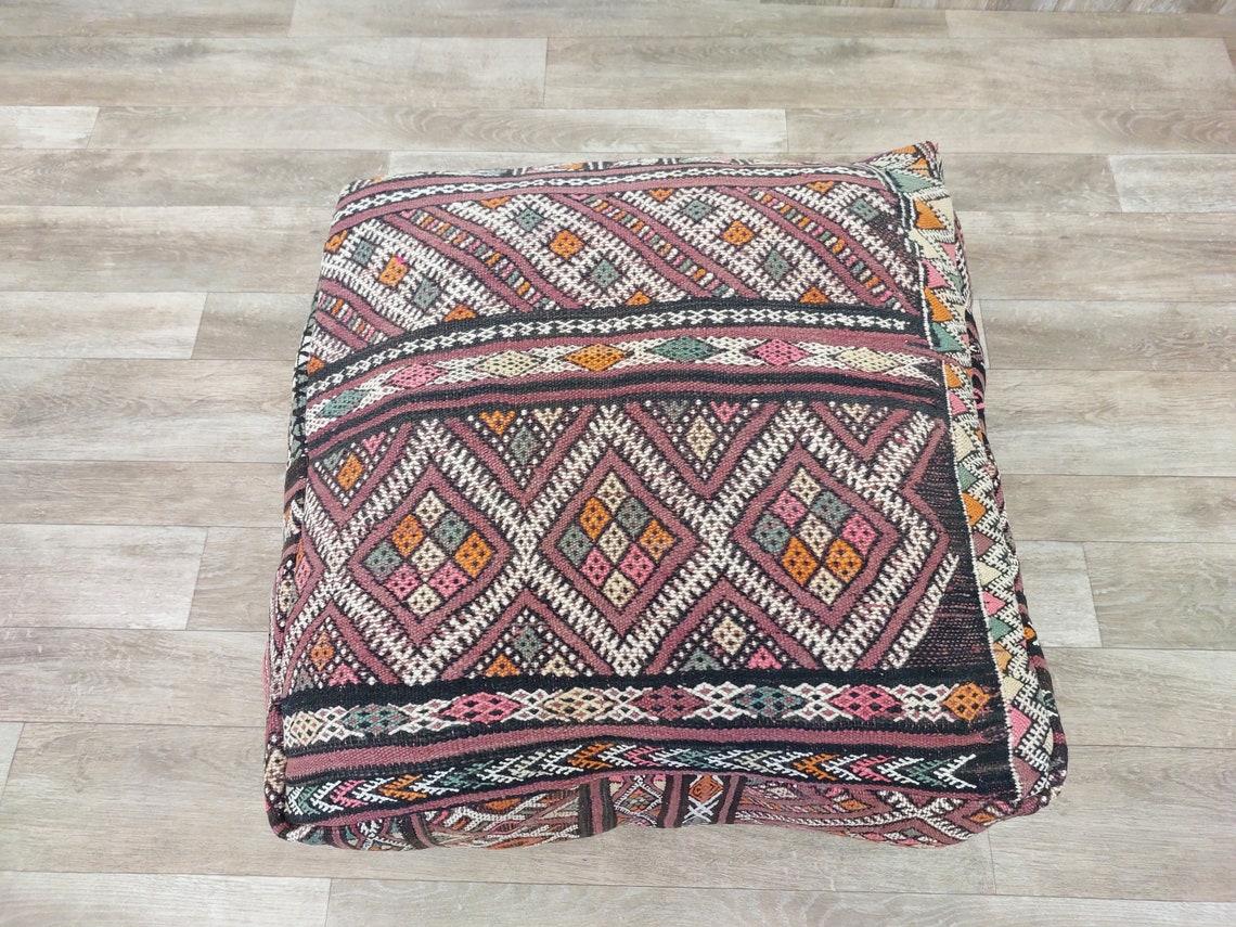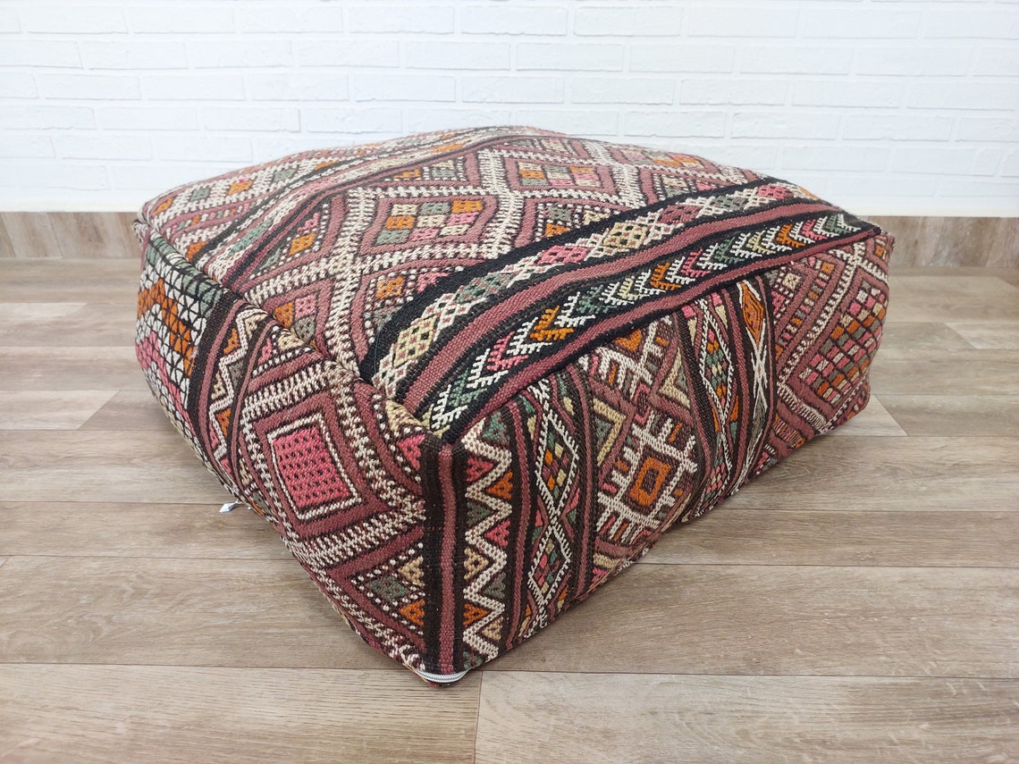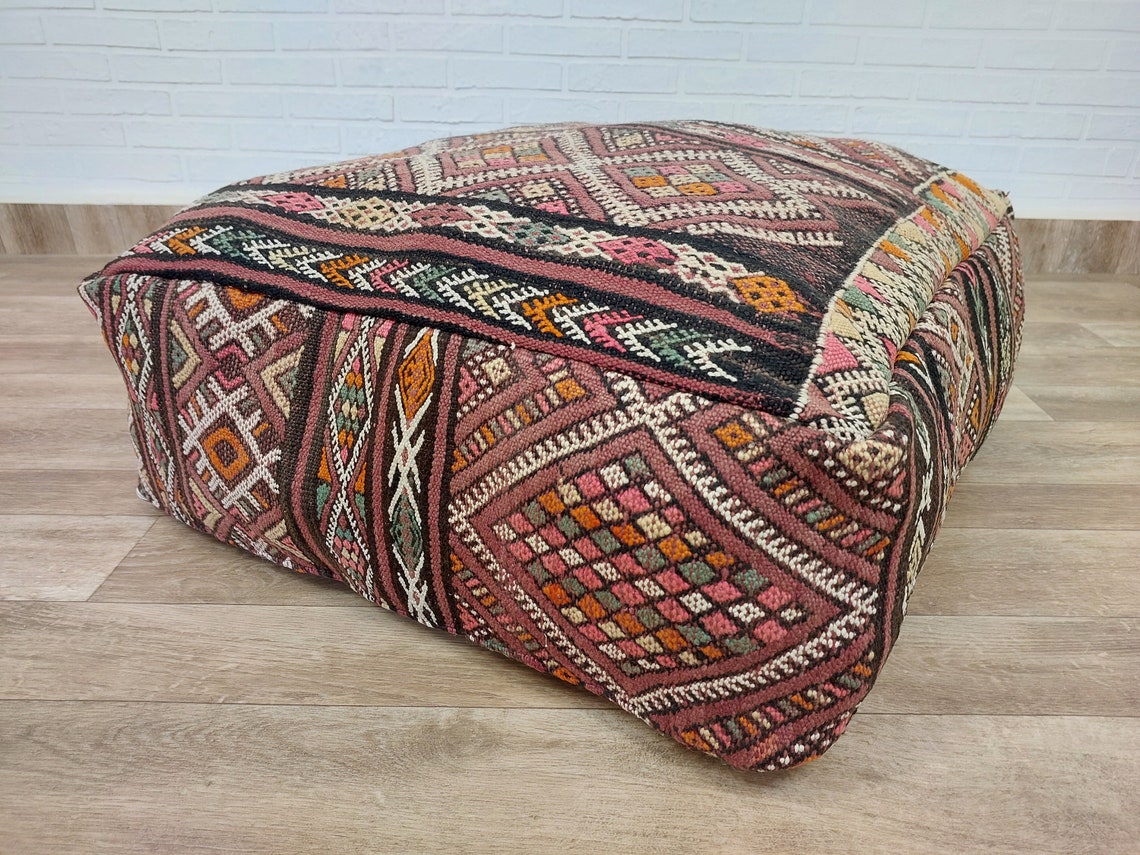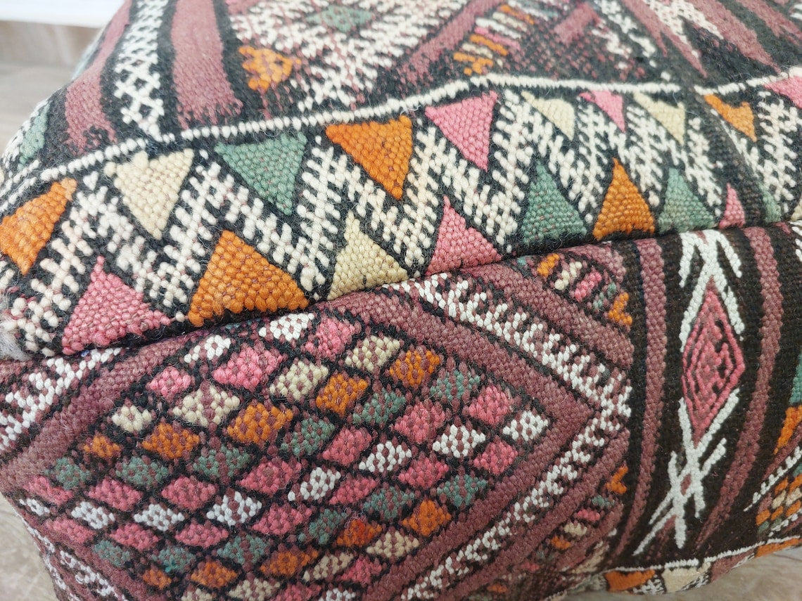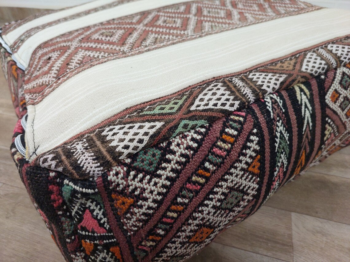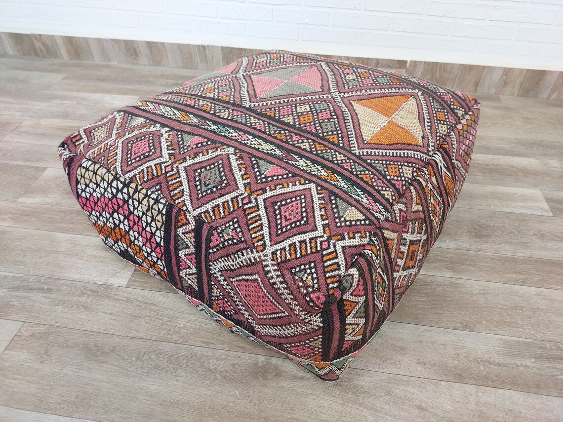 Vintage Moroccan Kilim Floor Pouf: Handmade Berber Wool Cushion Ottoman for Boho Home Decor