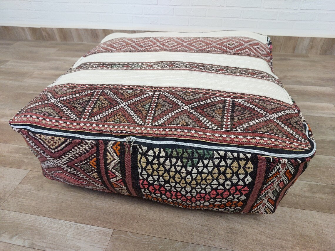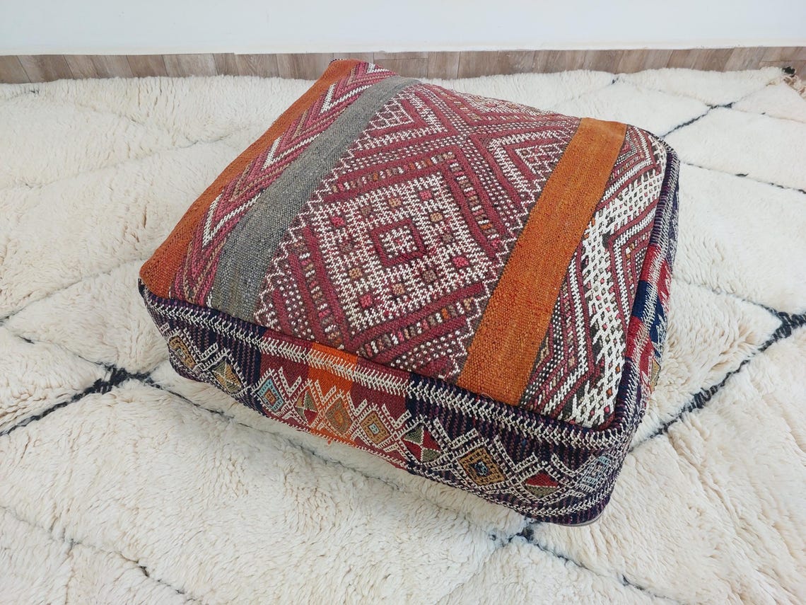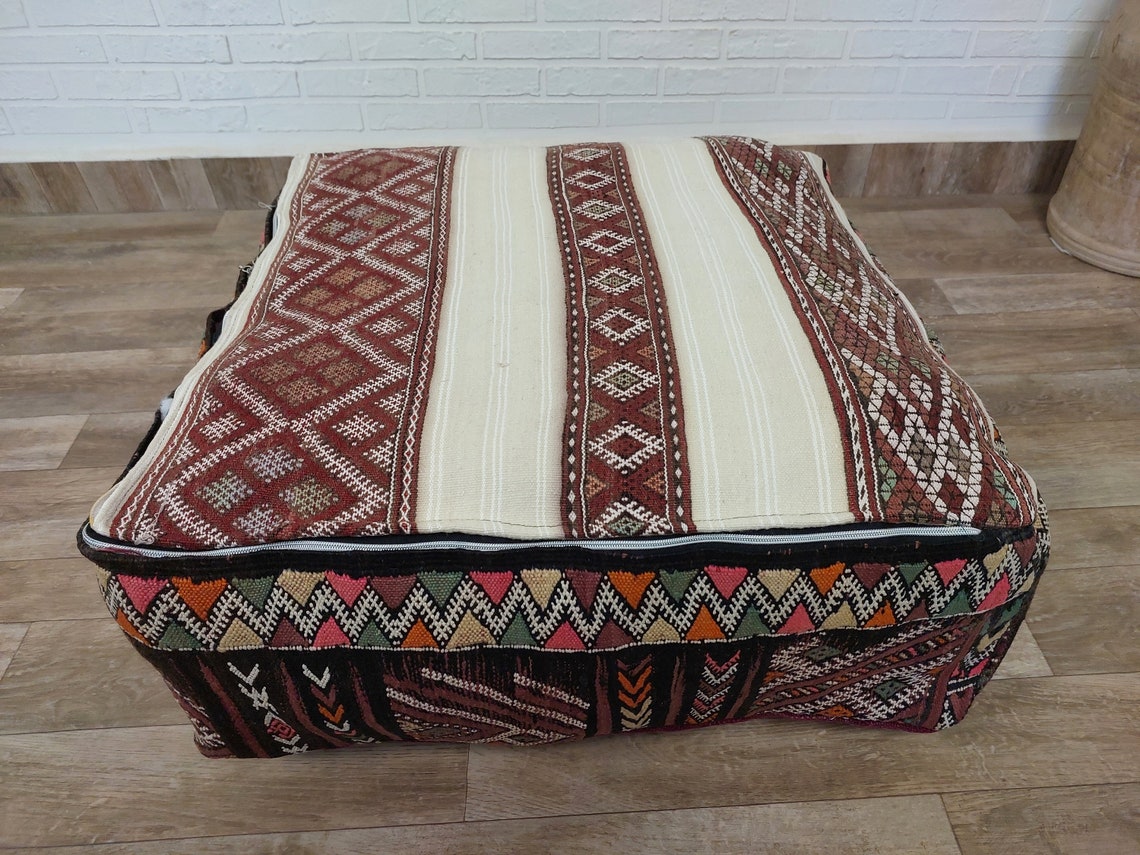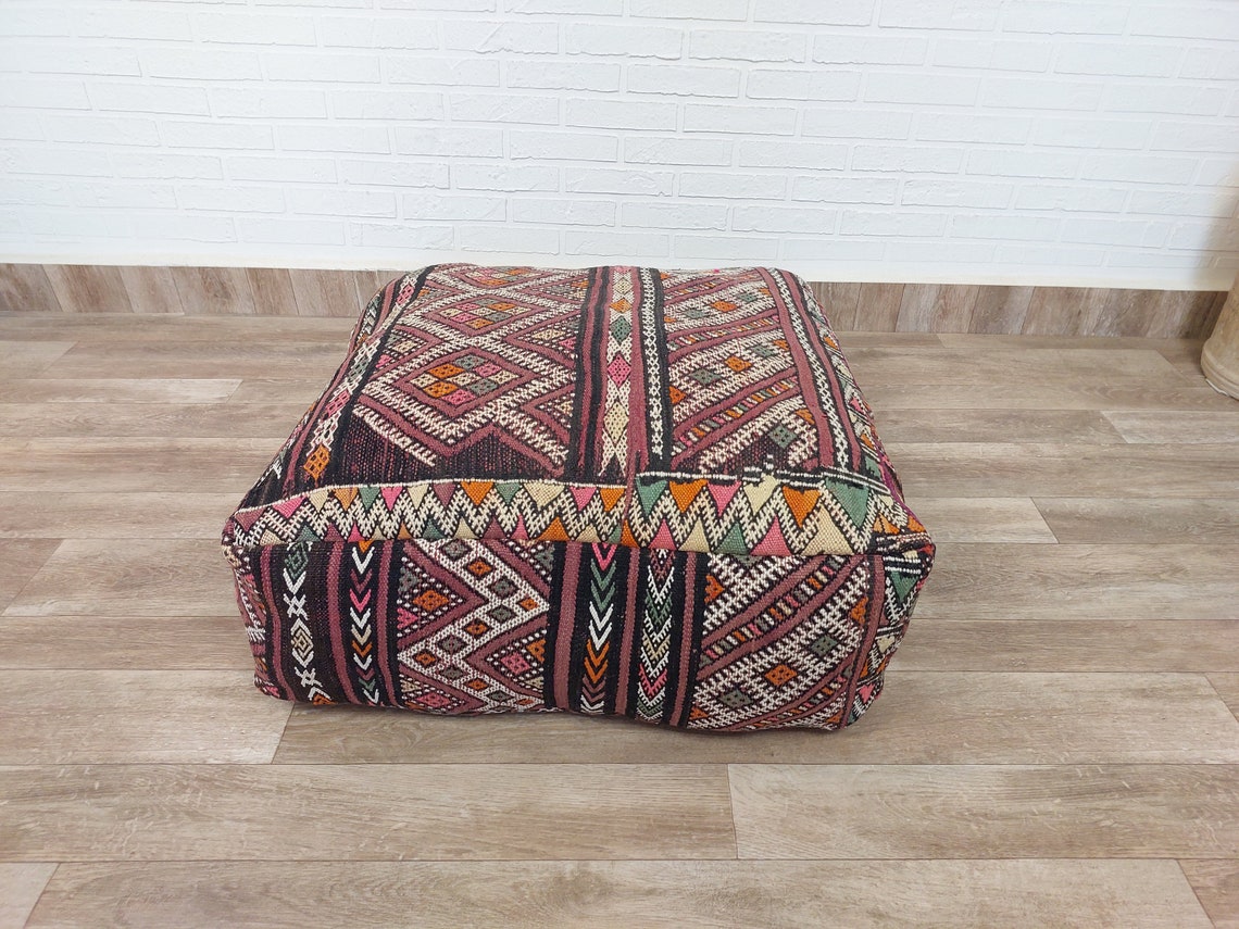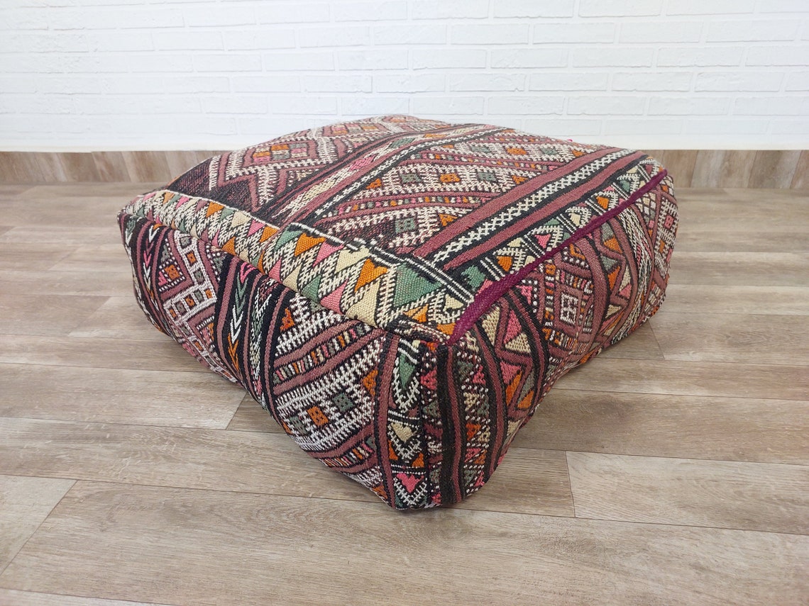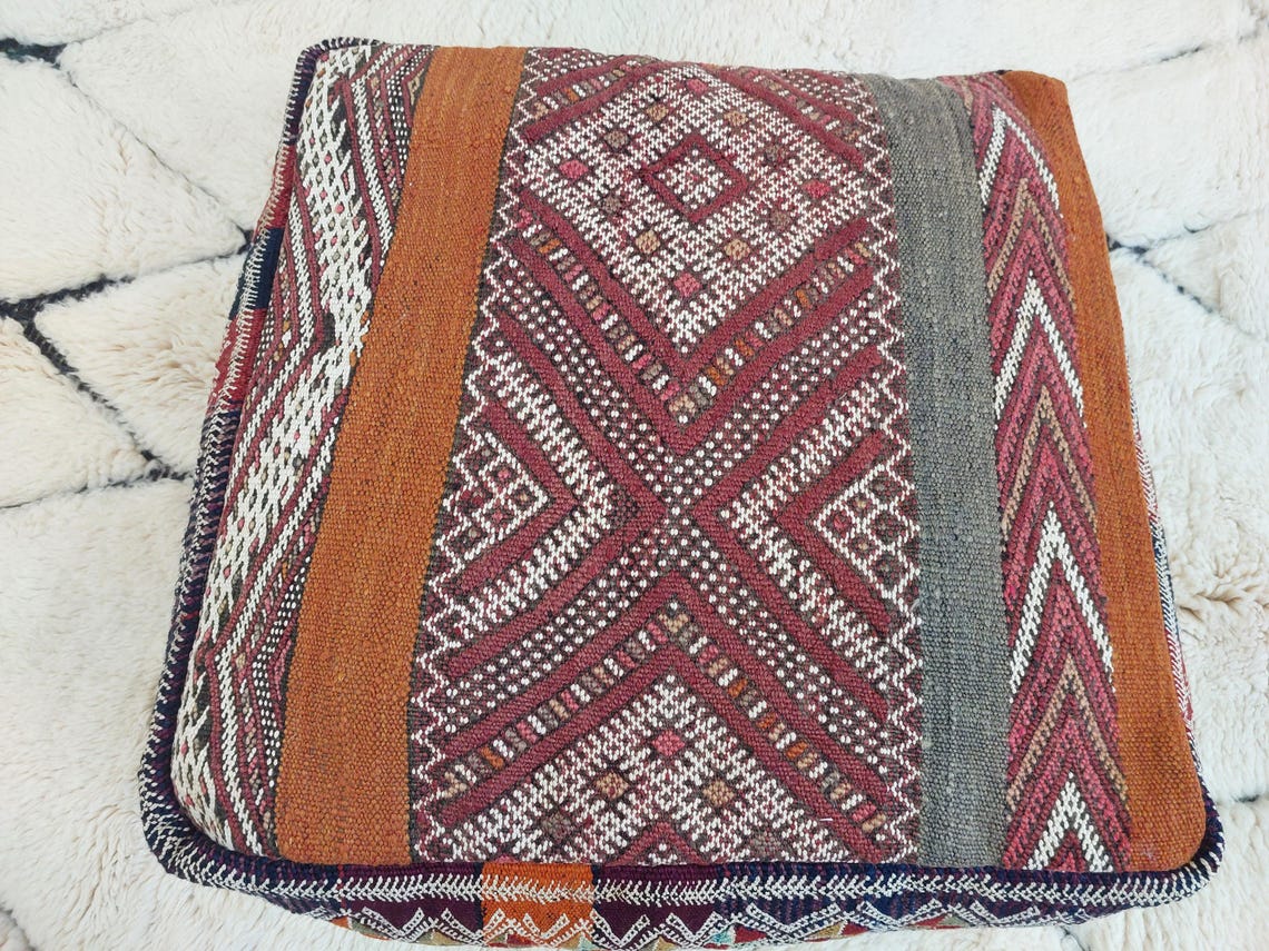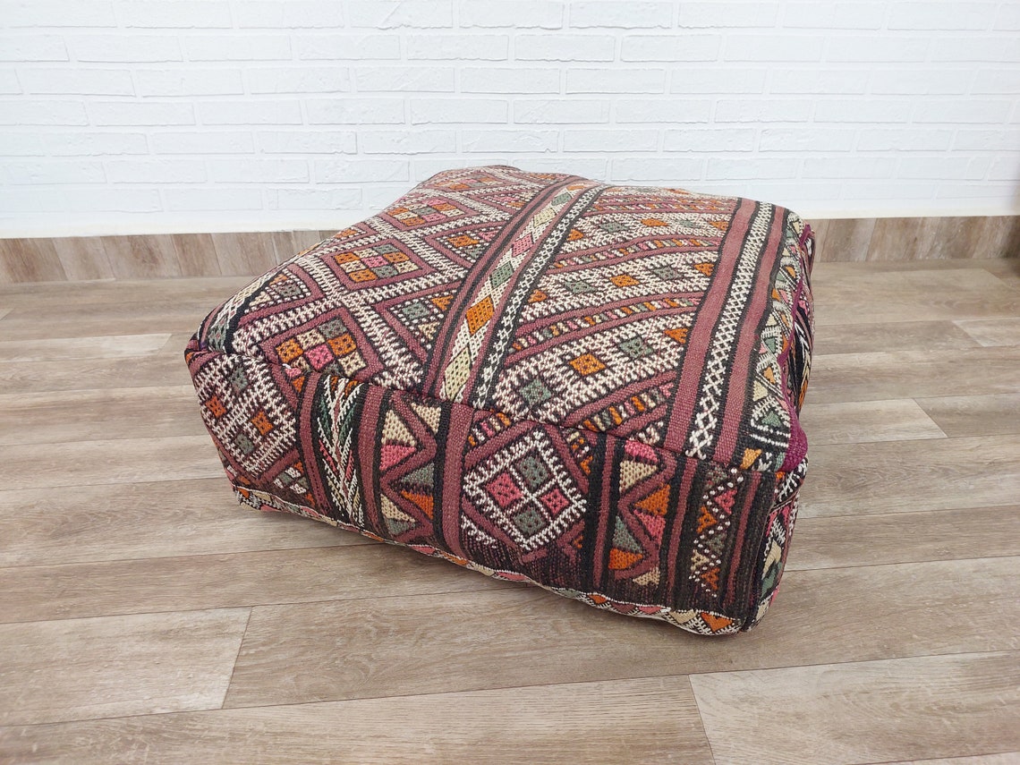 Vintage Moroccan Kilim Floor Pouf: Handmade Berber Wool Cushion Ottoman for Boho Home Decor