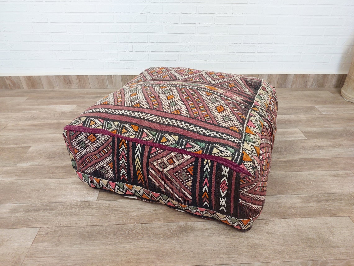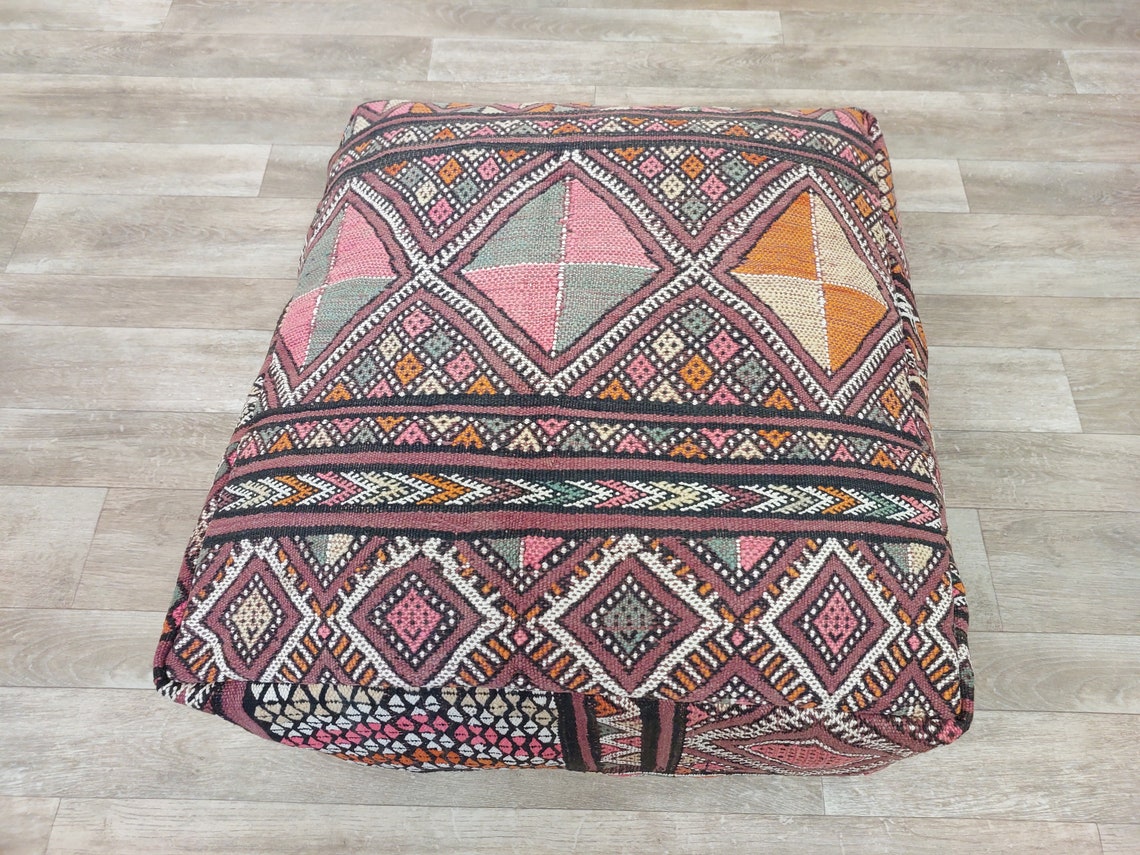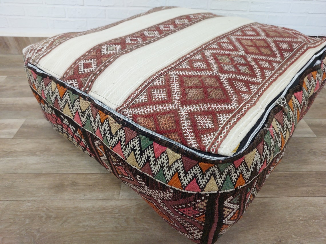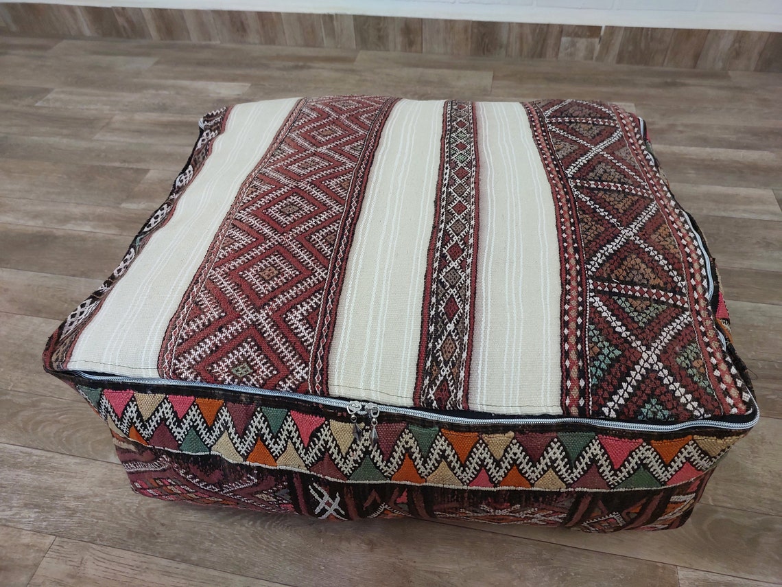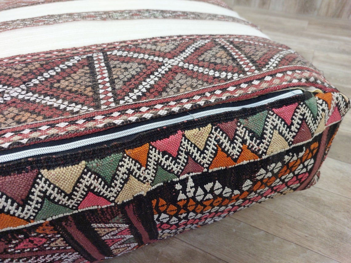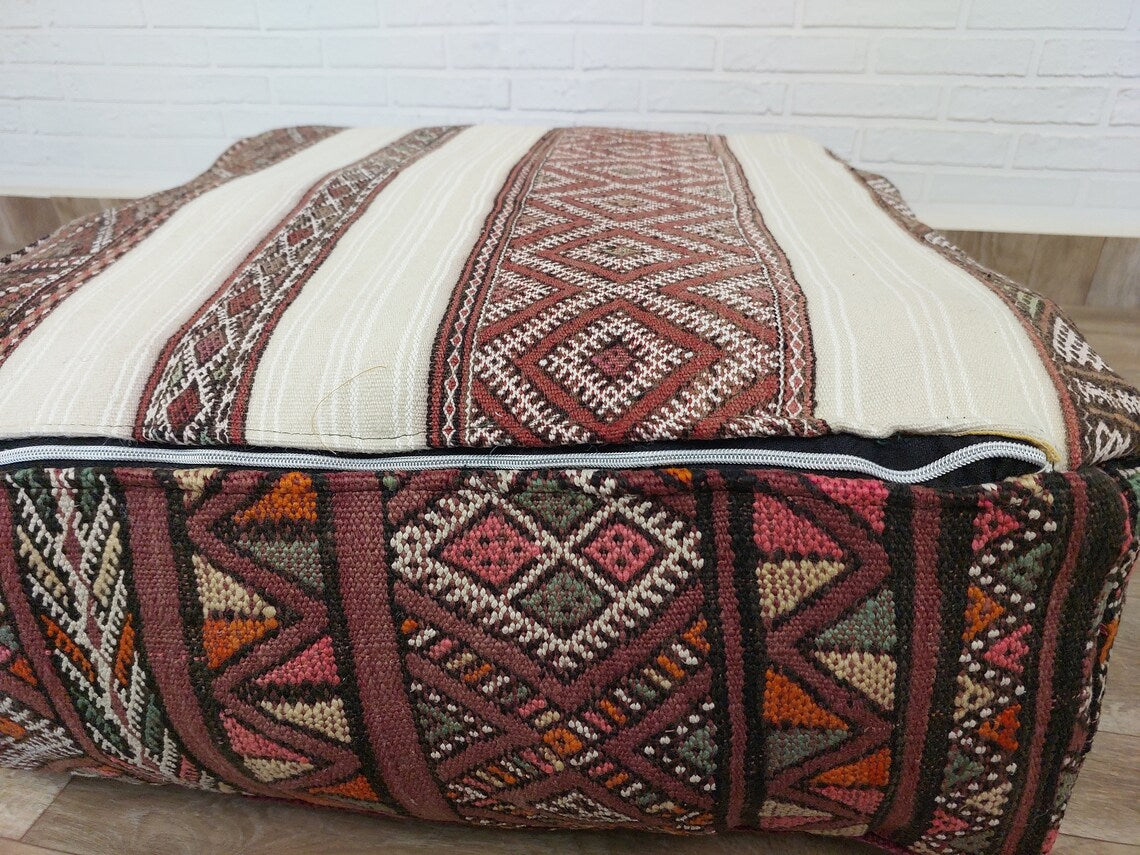 Vintage Moroccan Kilim Floor Pouf: Handmade Berber Wool Cushion Ottoman for Boho Home Decor
