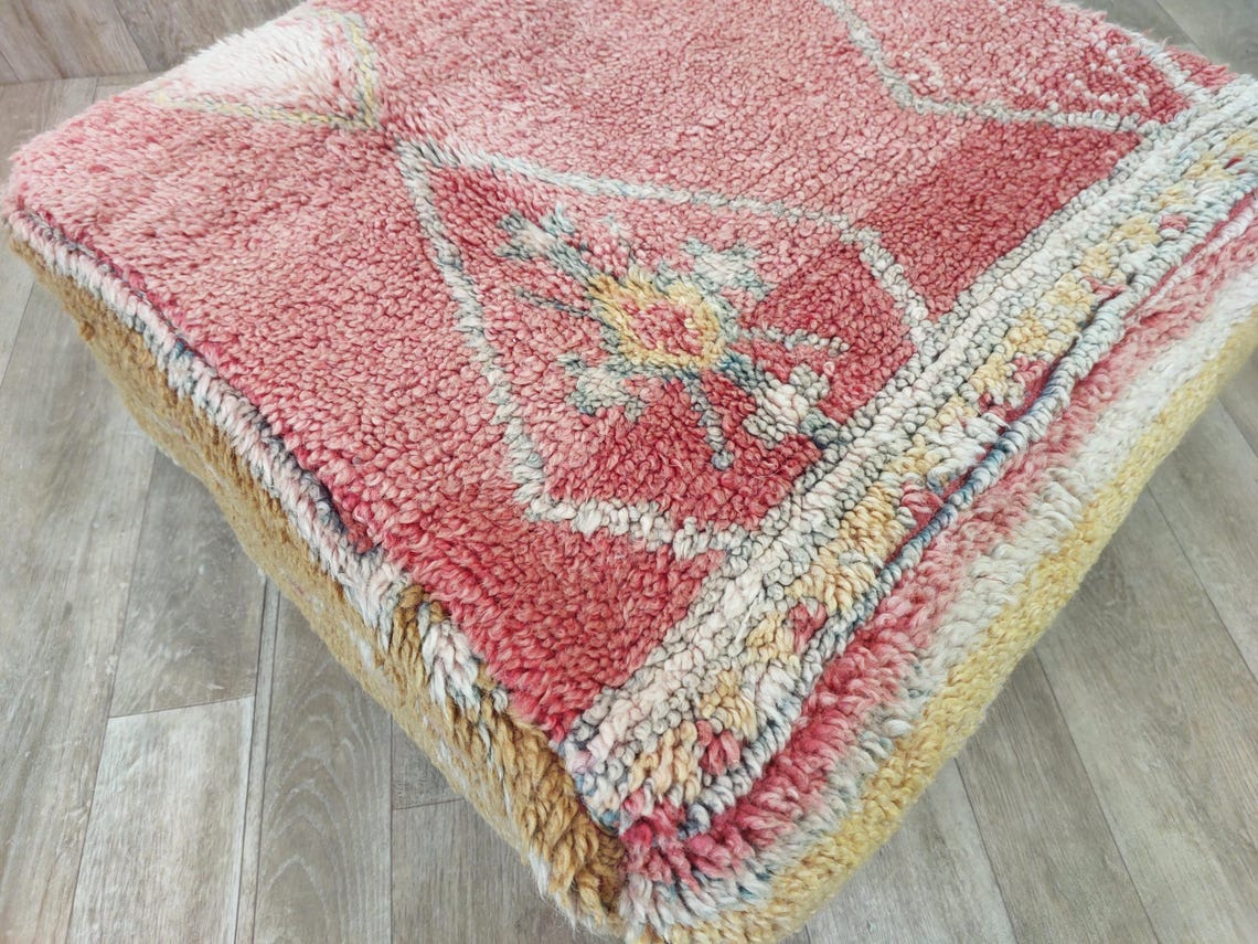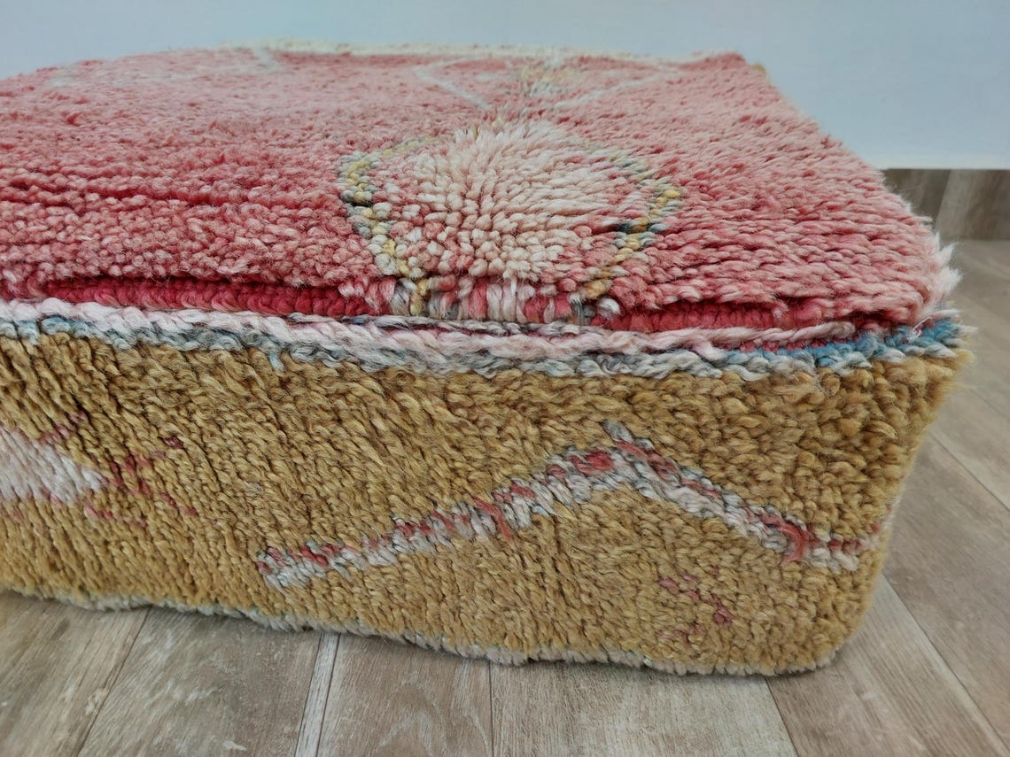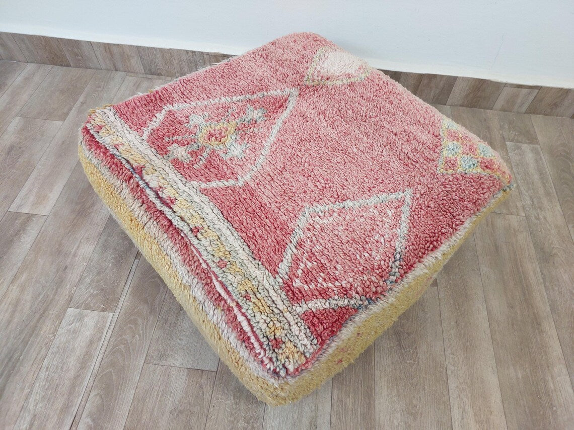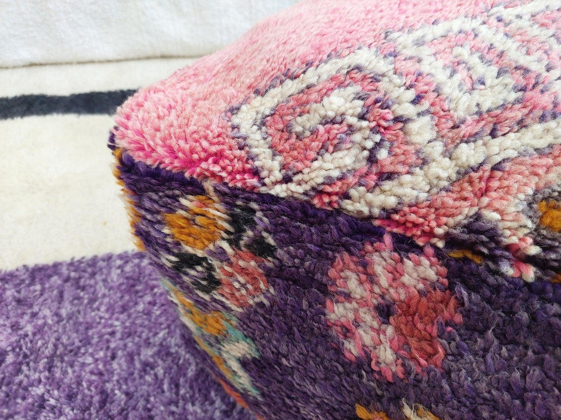Vintage Moroccan Berber Wool Pouf: Handmade Colorful Floor Cushion Ottoman For Bohemian Decor , High Quality Pink Pouf