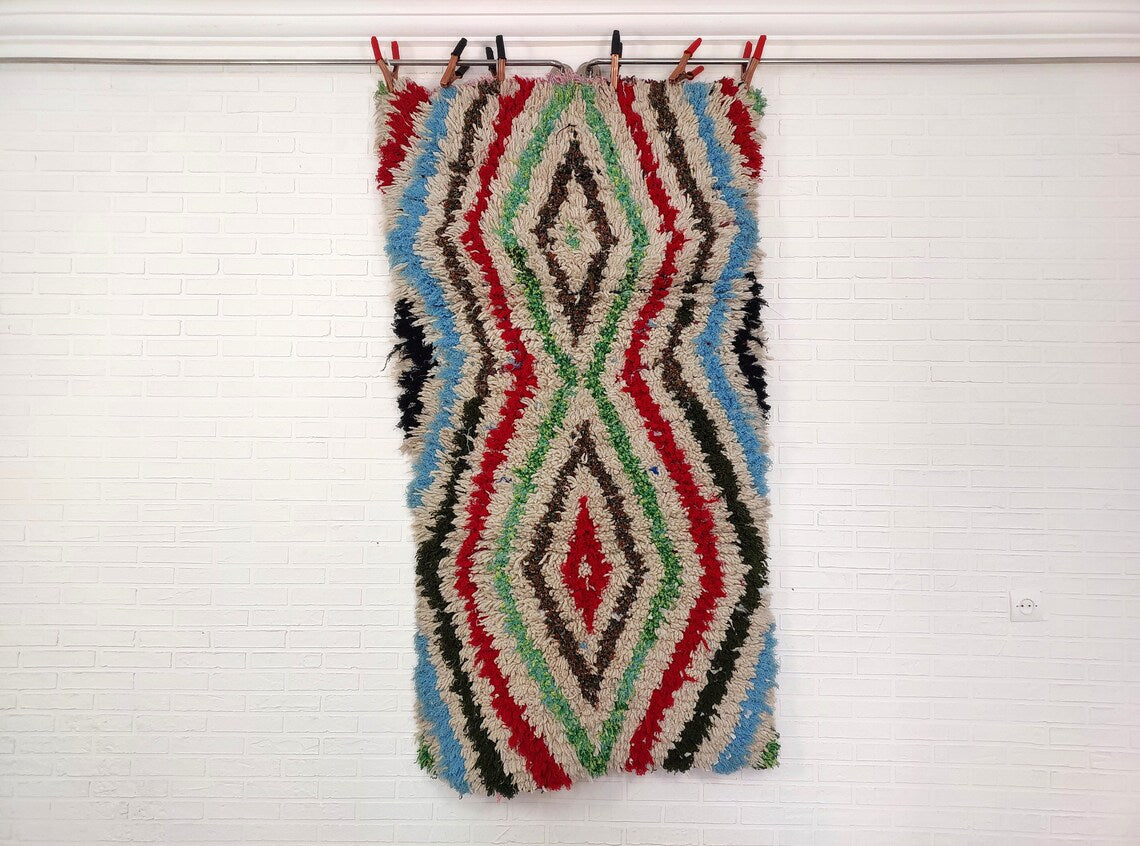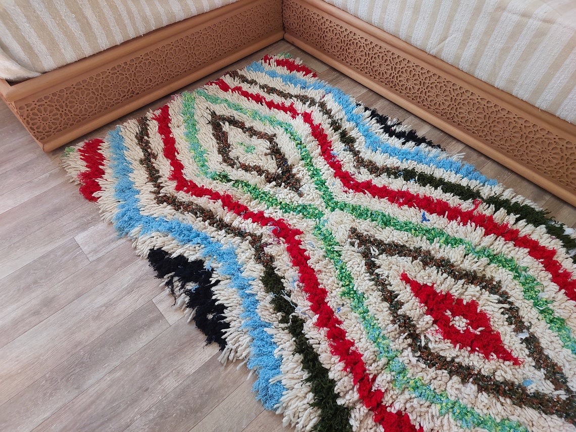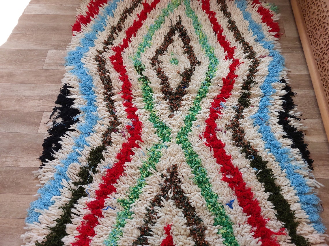 This beautiful vintage Boucherouite rug combines traditional Moroccan craftsmanship with eco-friendly recycled materials. Handwoven by skilled artisans, it features a vibrant patchwork of colors that adds warmth and character to any space. Perfect for use as a floor covering, wall hanging, or decorative accent, each rug is truly one-of-a-kind. Its soft texture and unique design make it an ideal addition to living rooms, bedrooms, or hallways. Bring a touch of Moroccan heritage and artistic flair into your home.