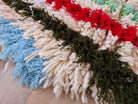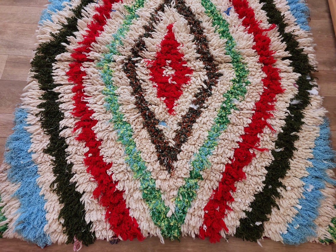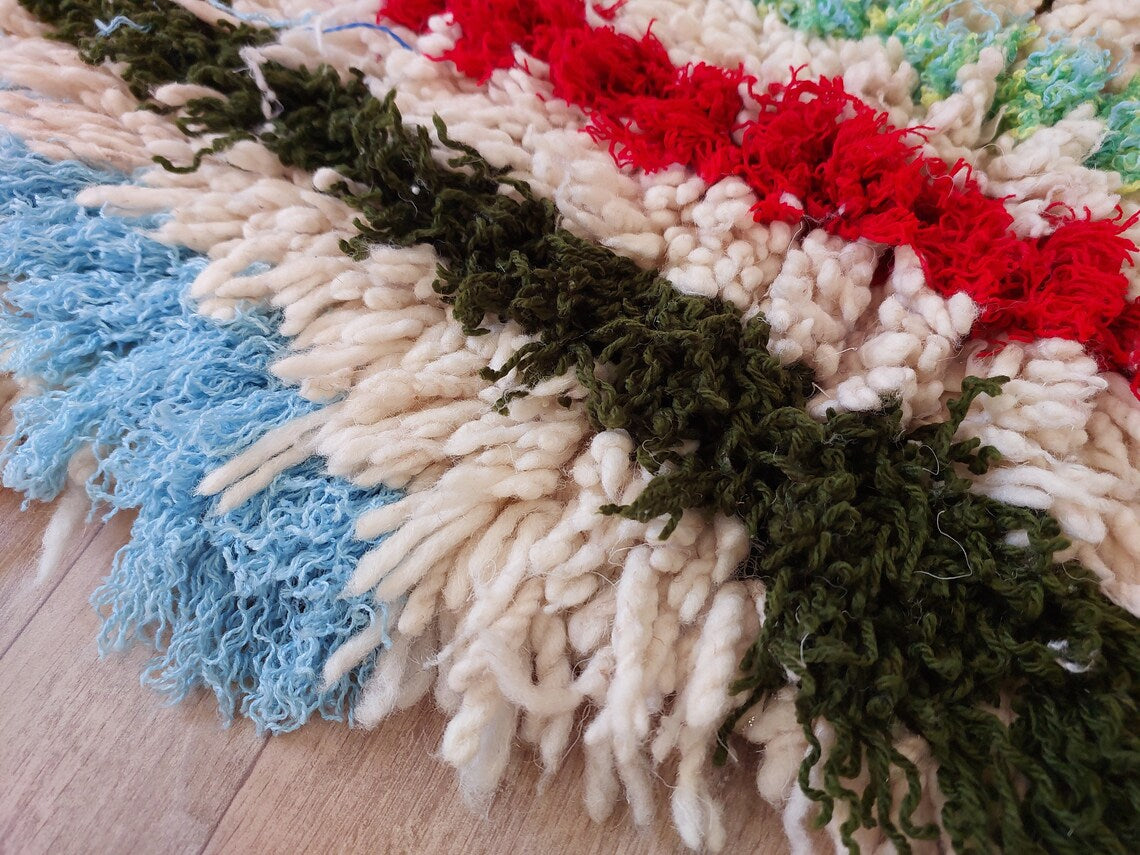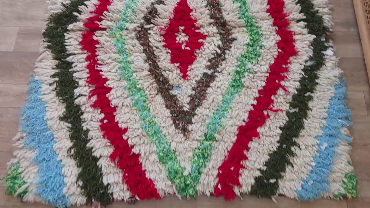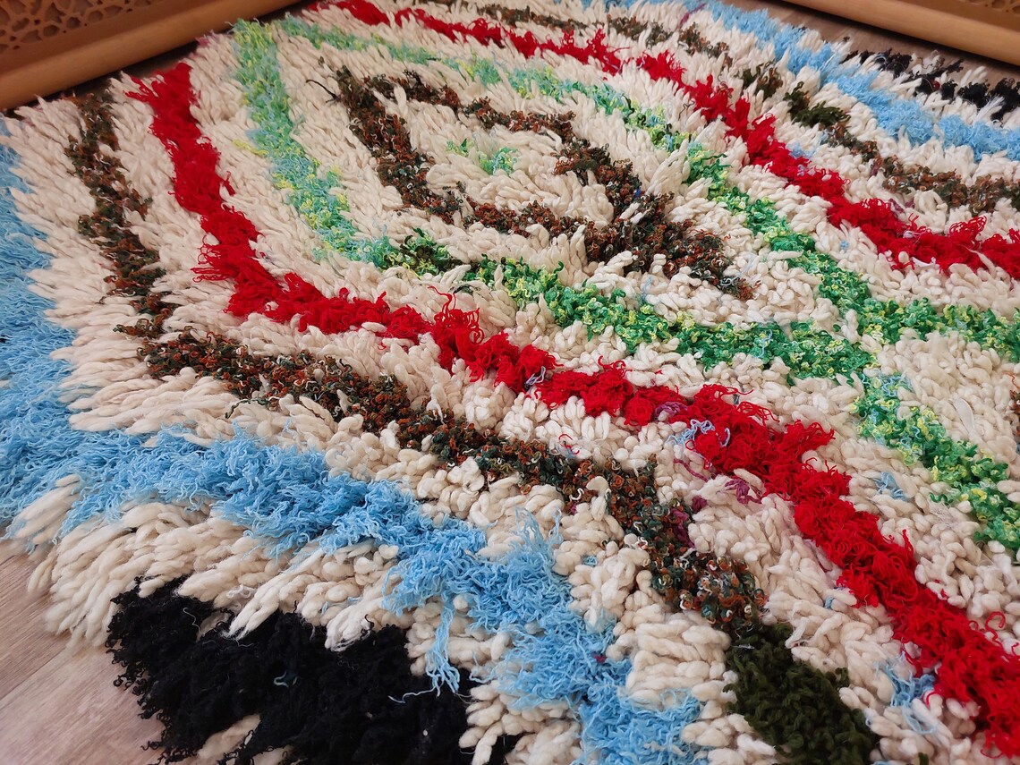This beautiful vintage Boucherouite rug combines traditional Moroccan craftsmanship with eco-friendly recycled materials. Handwoven by skilled artisans, it features a vibrant patchwork of colors that adds warmth and character to any space. Perfect for use as a floor covering, wall hanging, or decorative accent, each rug is truly one-of-a-kind. Its soft texture and unique design make it an ideal addition to living rooms, bedrooms, or hallways. Bring a touch of Moroccan heritage and artistic flair into your home.