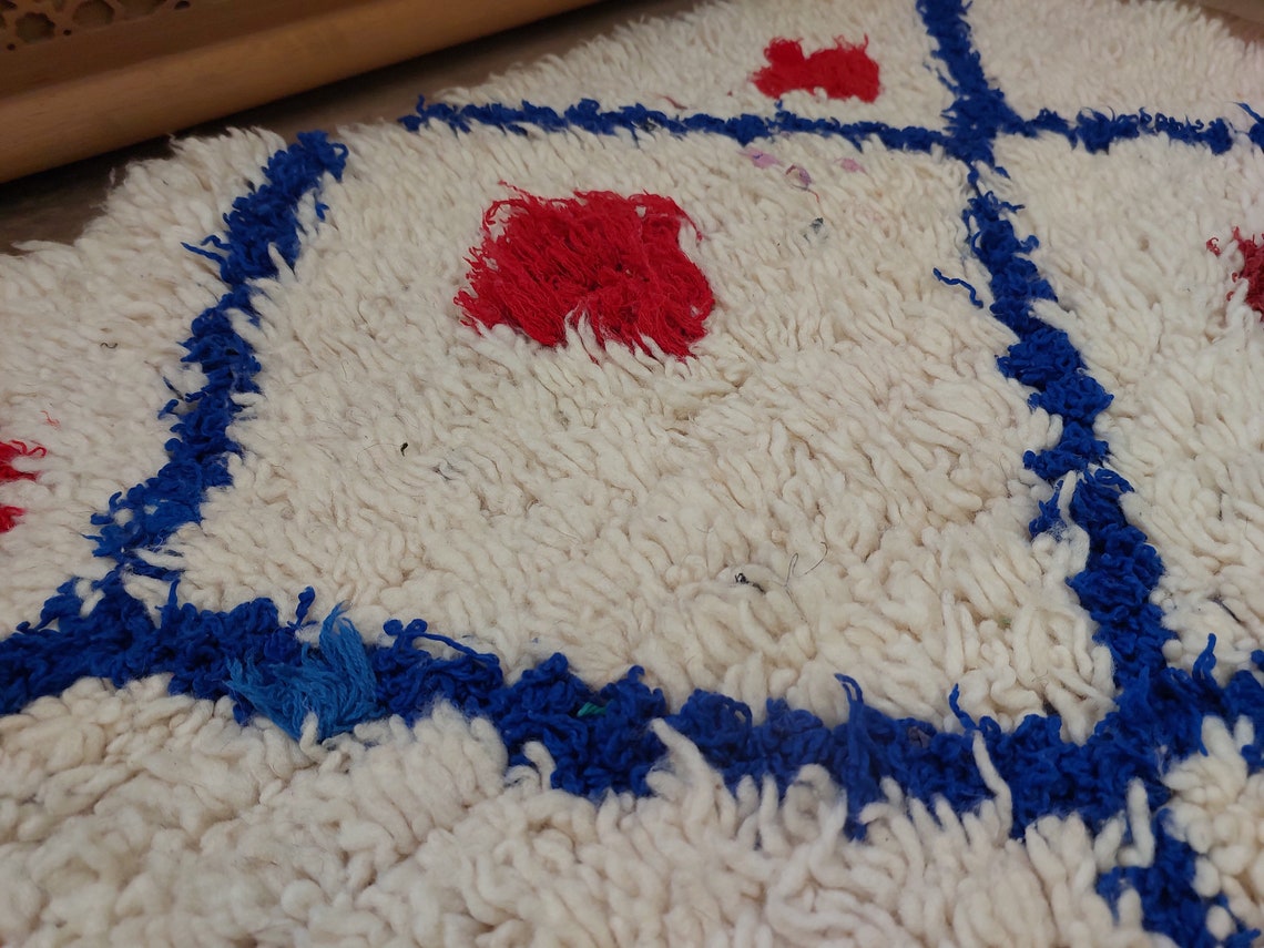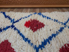 This small exquisite Beni Ourain rug is handcrafted from wool and recycled fabrics by Moroccan women. Its natural white base with a tender red ornament and playful fringe adds charm and character to any interior. Perfect for nursery rooms, bedrooms, walk-in closets, or as a decorative accent. Stain resistant and in excellent condition.