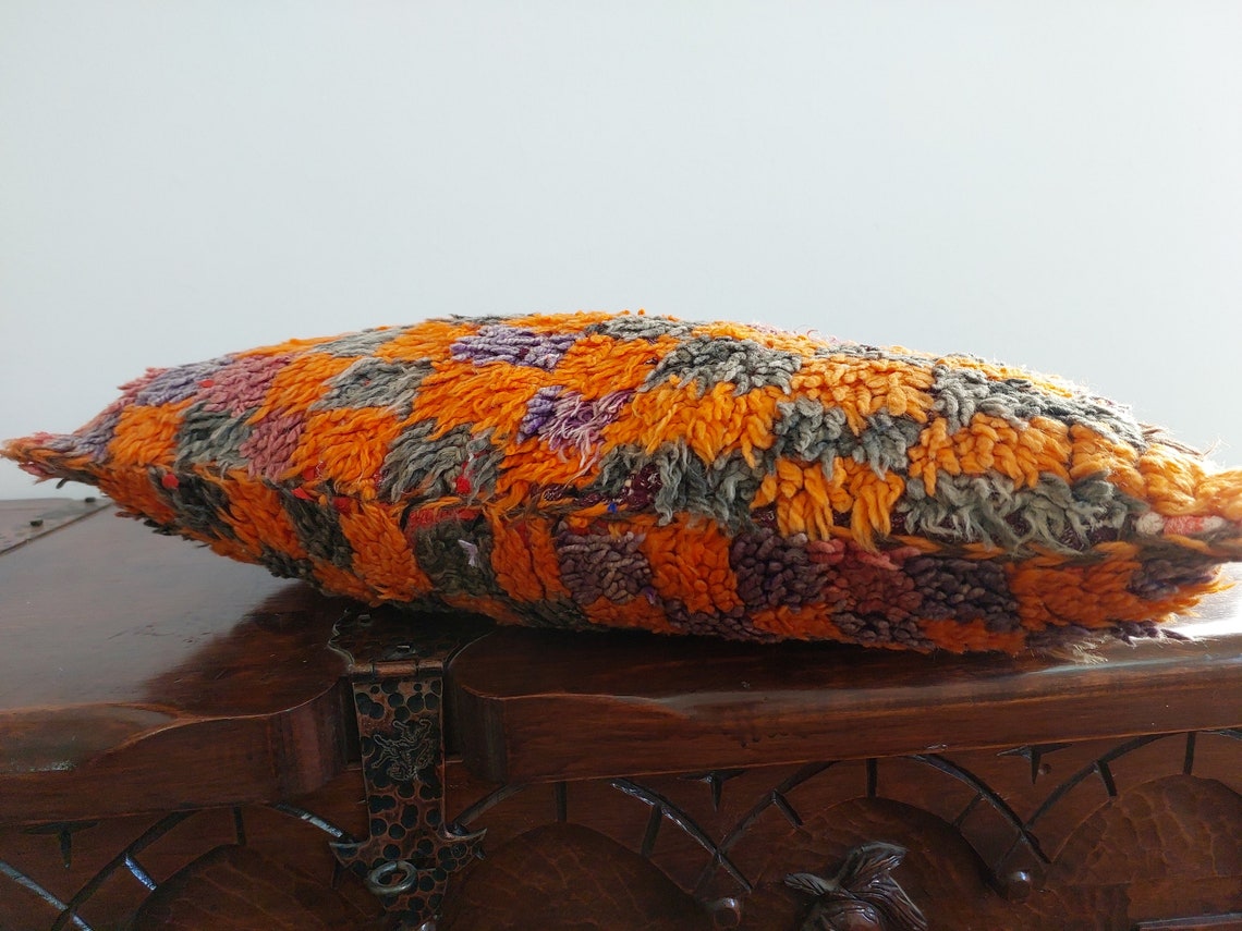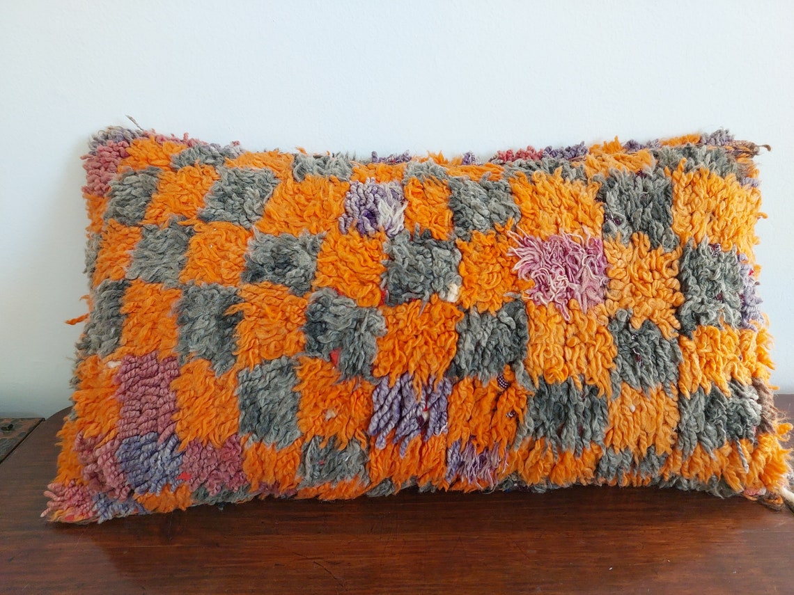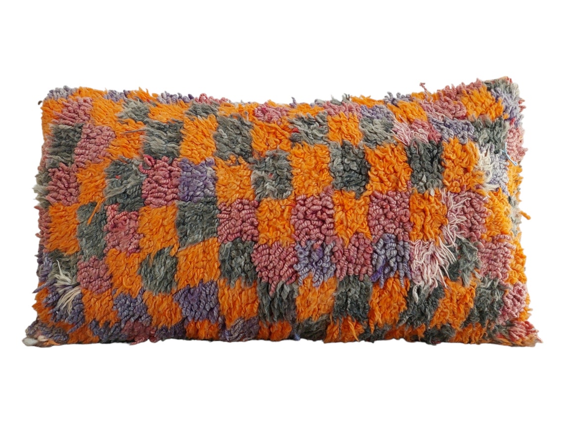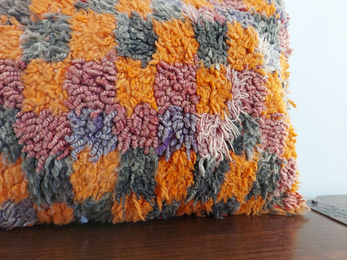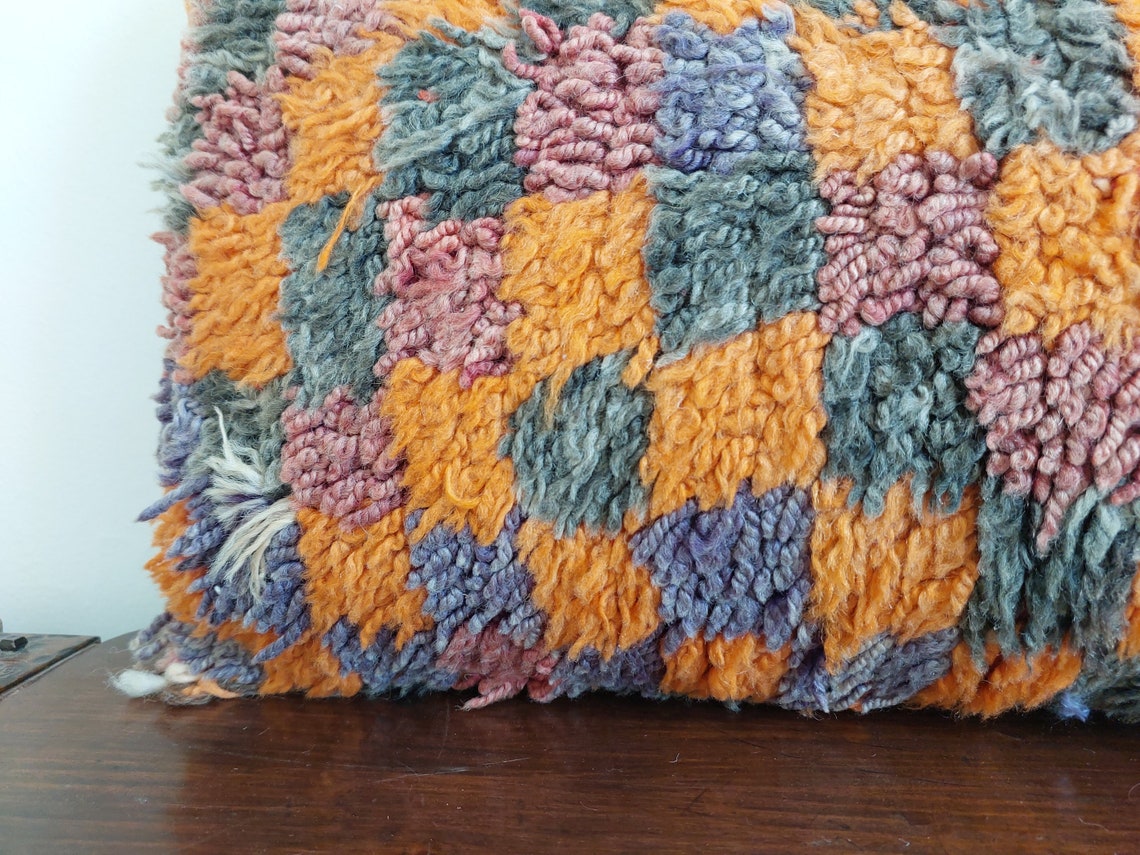 Vintage Checkered Talsint Pillow - Berber Cushion Double Sided - Handmade Wool Pillow 13"X23"