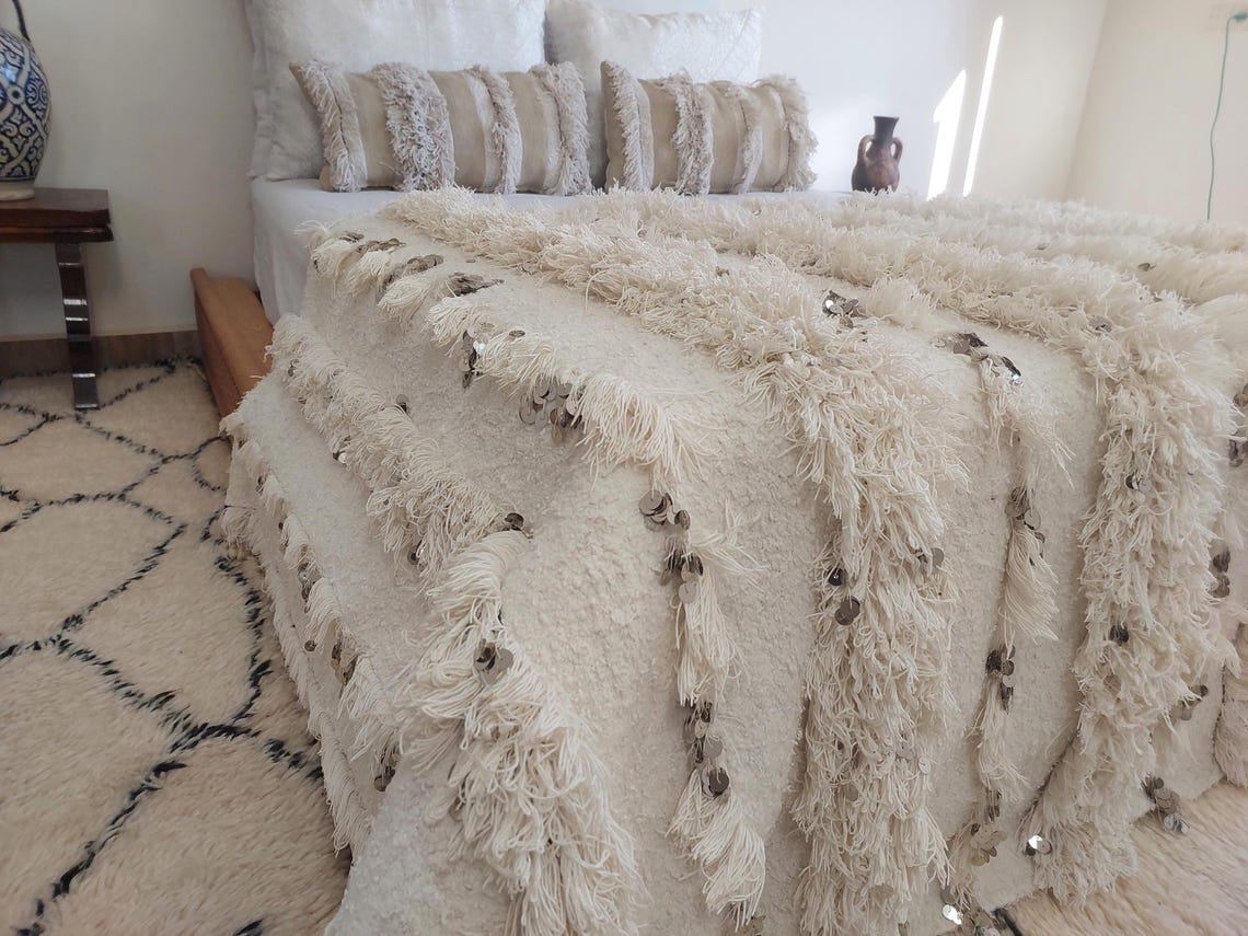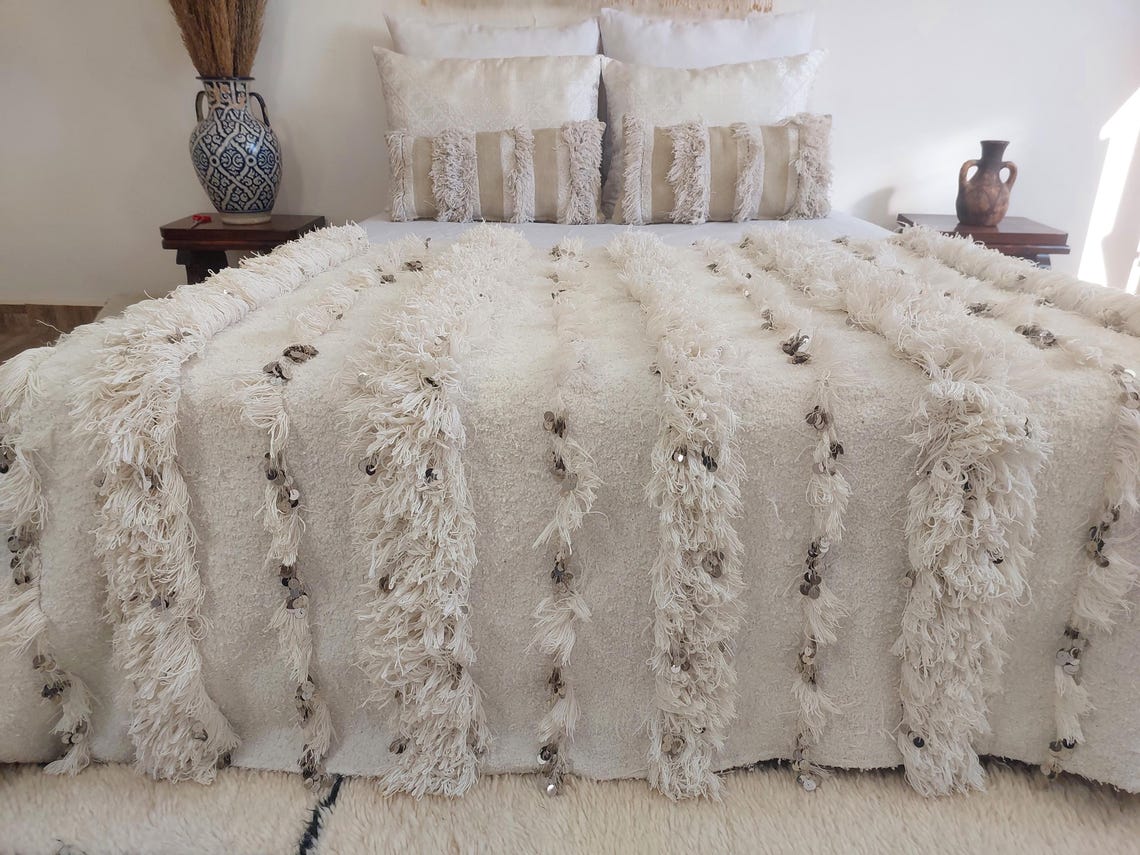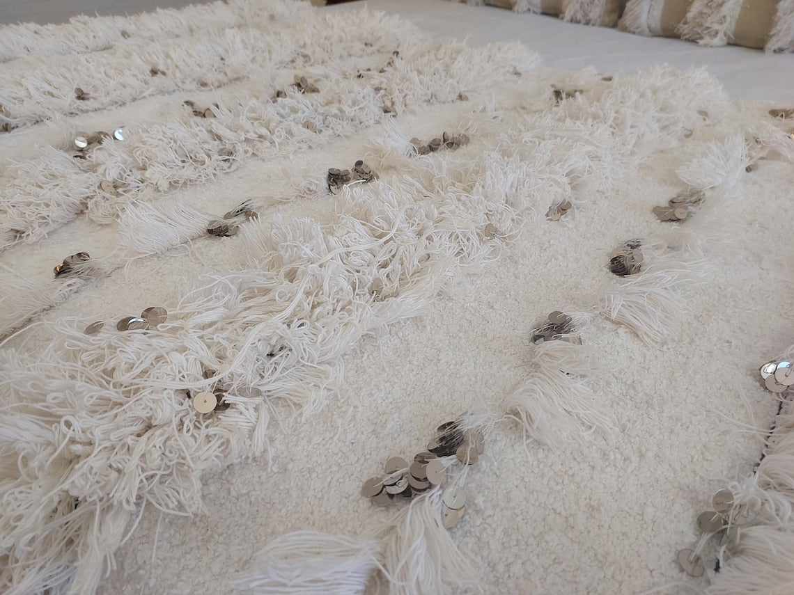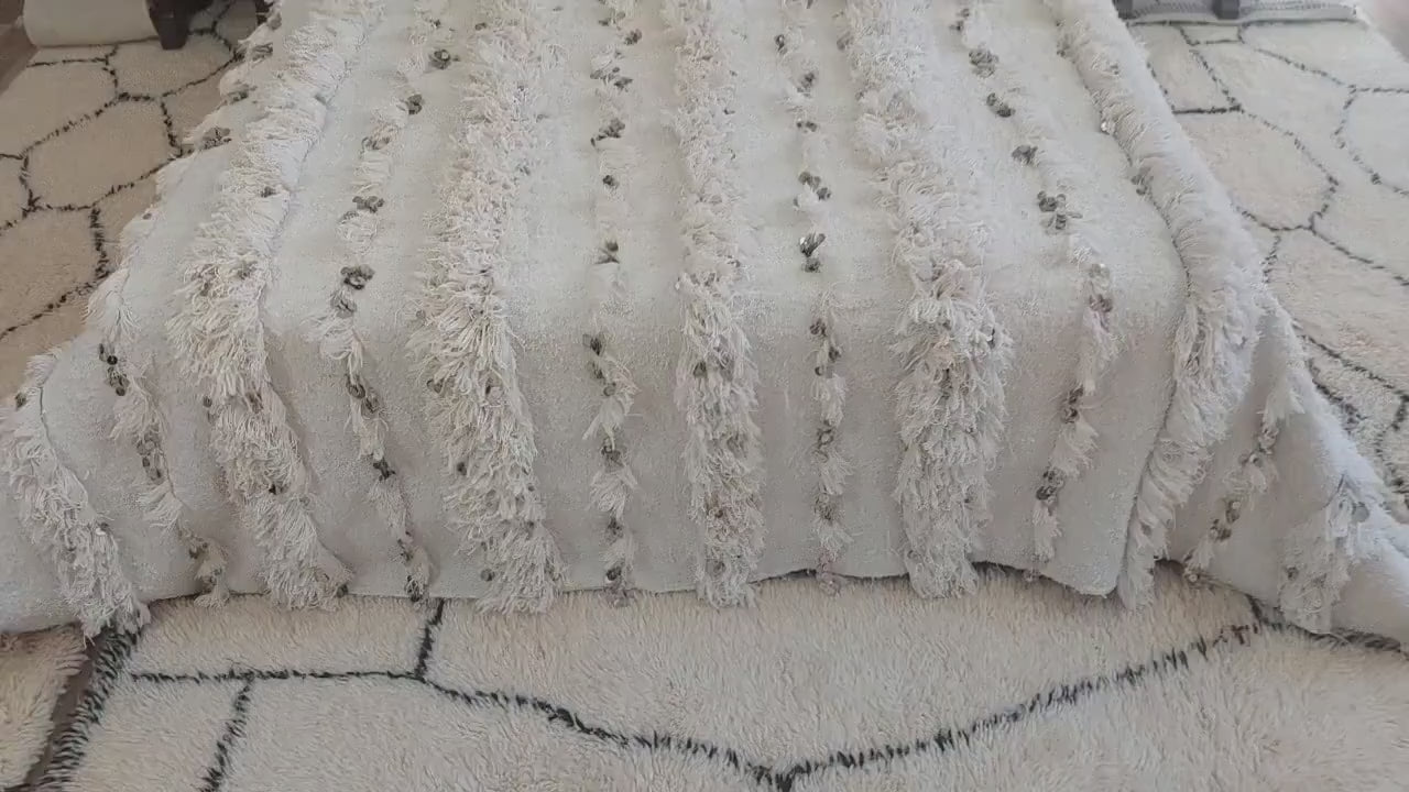 White Boho Blanket Cotton Moroccan Handira with Sequins and Heart Tassels