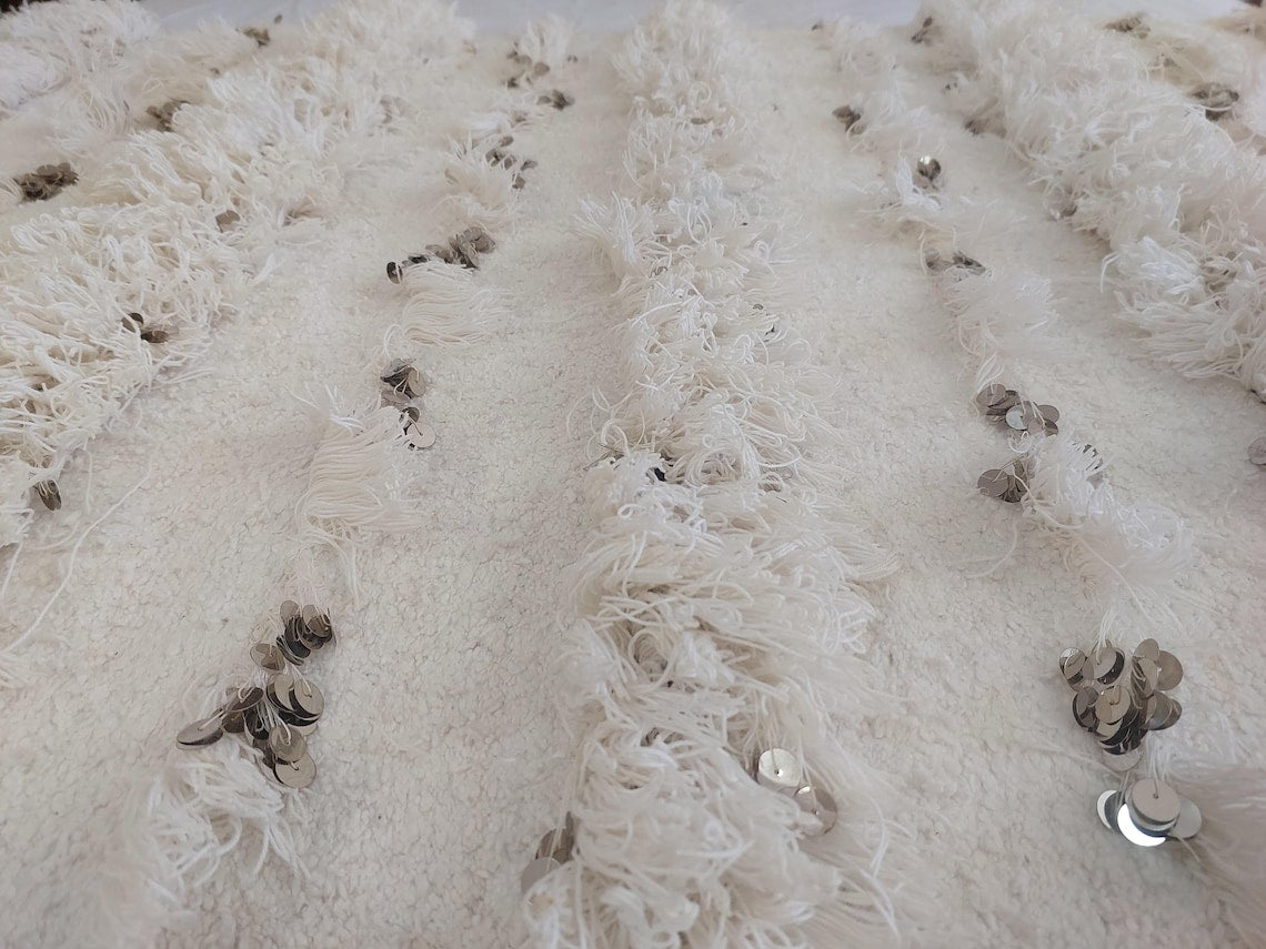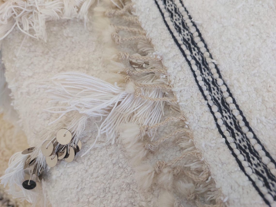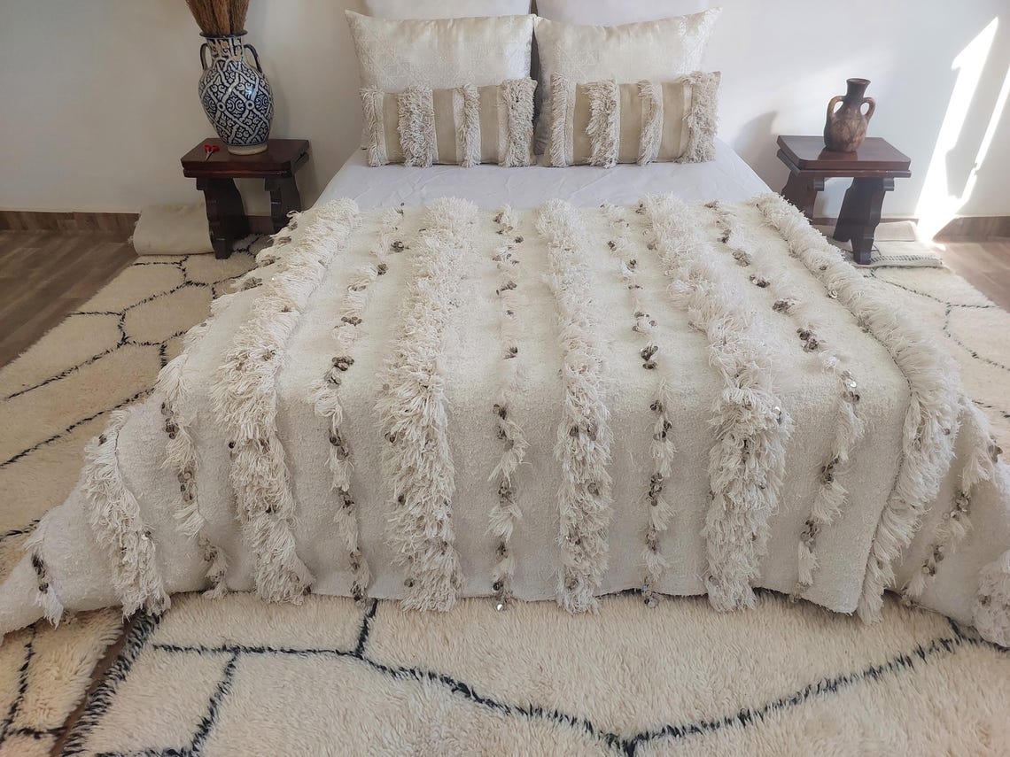 White Boho Blanket Cotton Moroccan Handira with Sequins and Heart Tassels