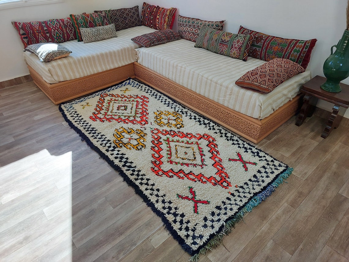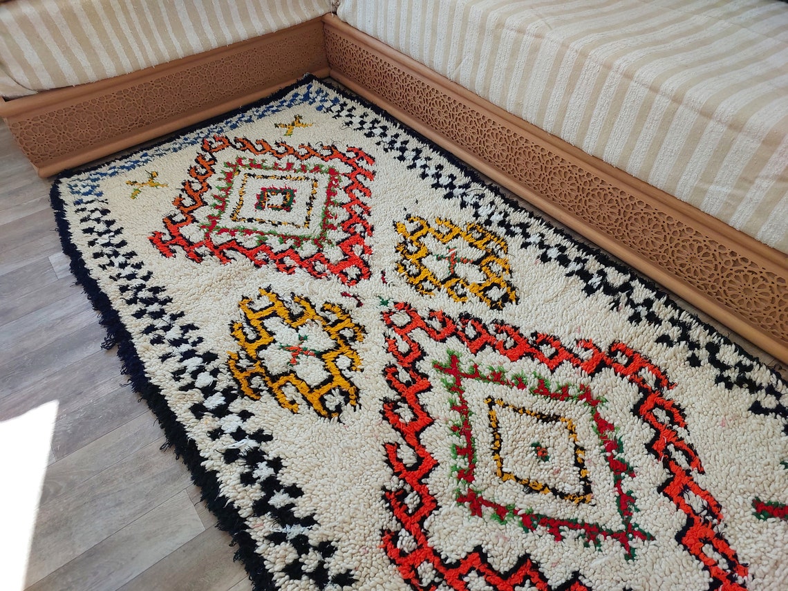 This vintage rug brings a cozy Moroccan touch to any interior. Perfect for nursery rooms, bedrooms, or walk-in closets. Its playful fringe and bright design create an intriguing mood while maintaining style and practicality.