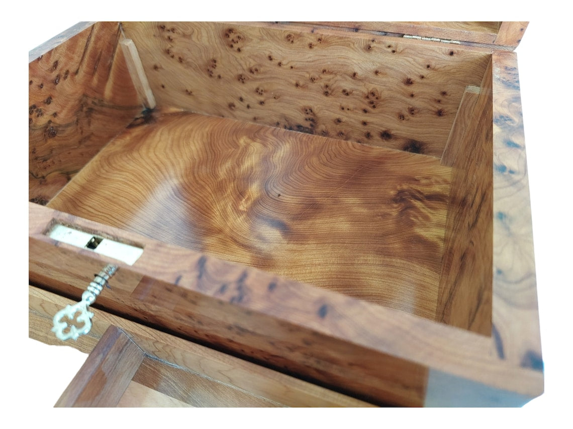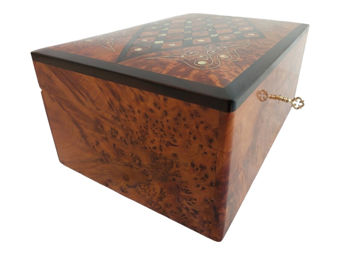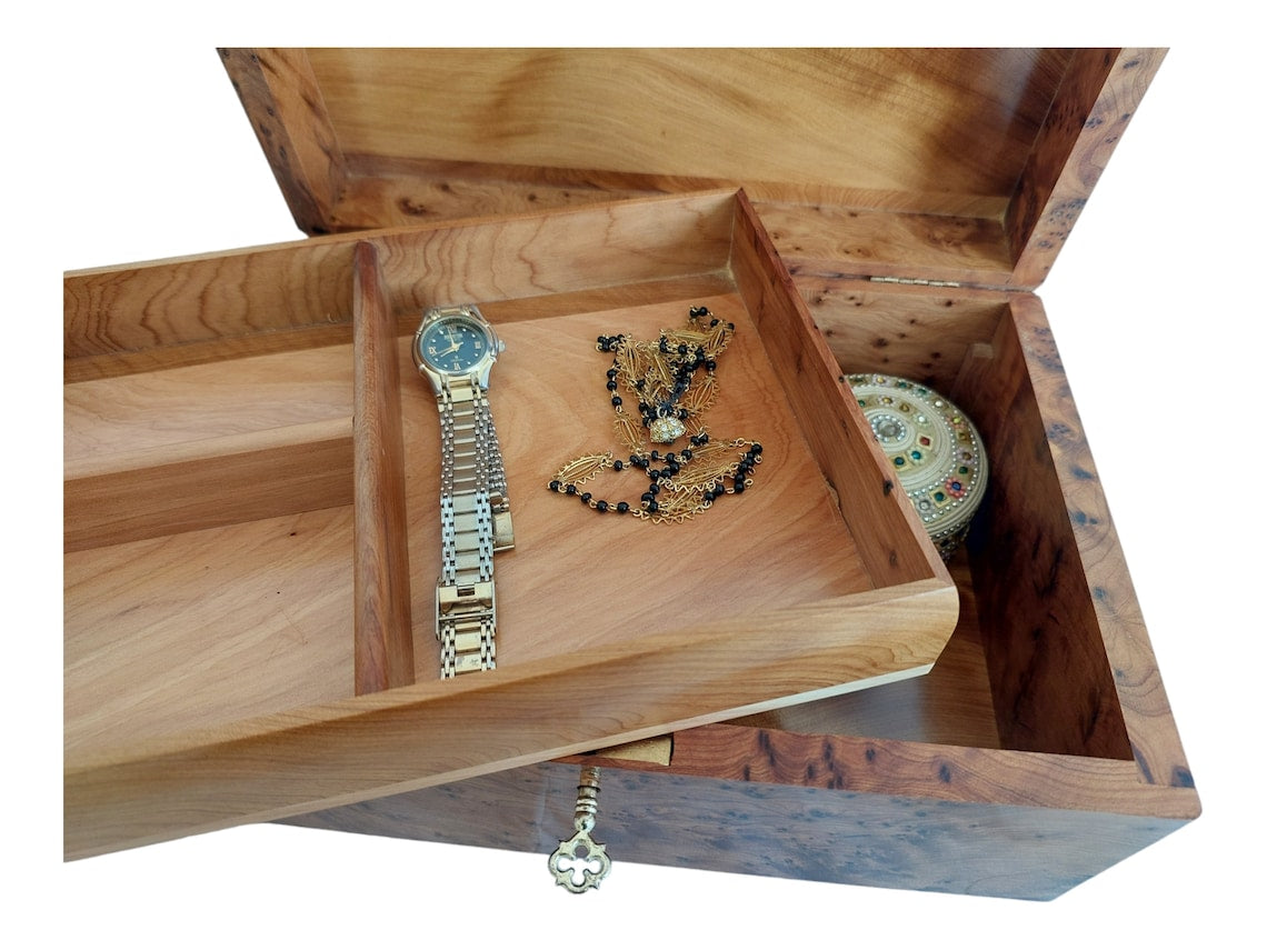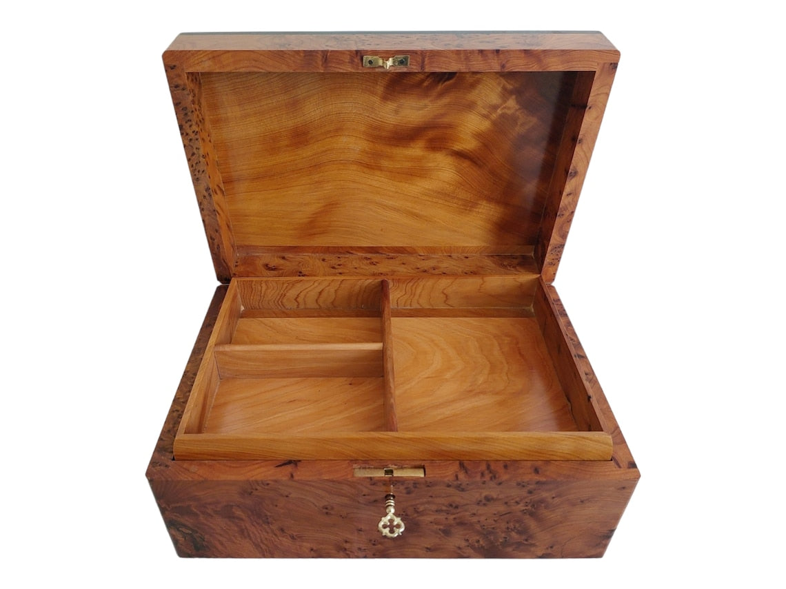 Handcrafted Moroccan Thuya Wood Jewelry Chest - Large Lockable Treasure Box, Unique Engraved Gift