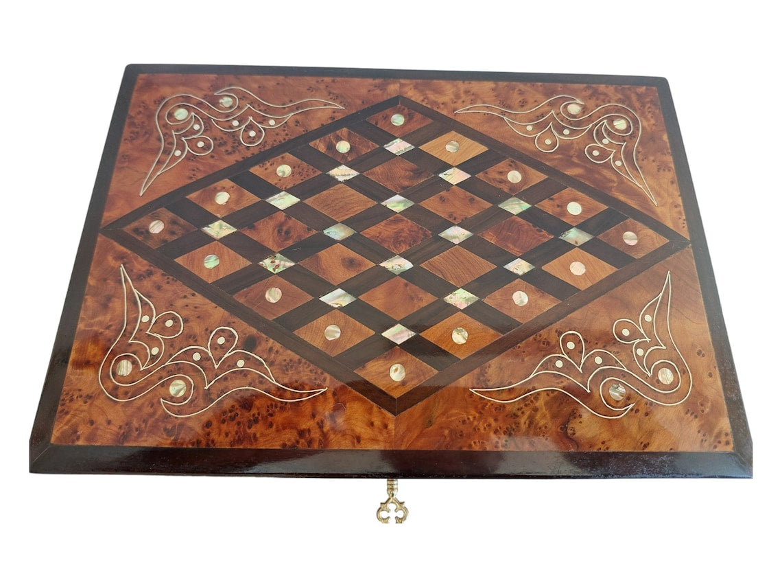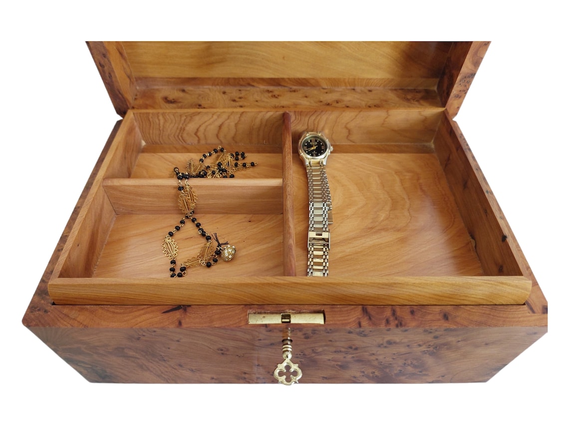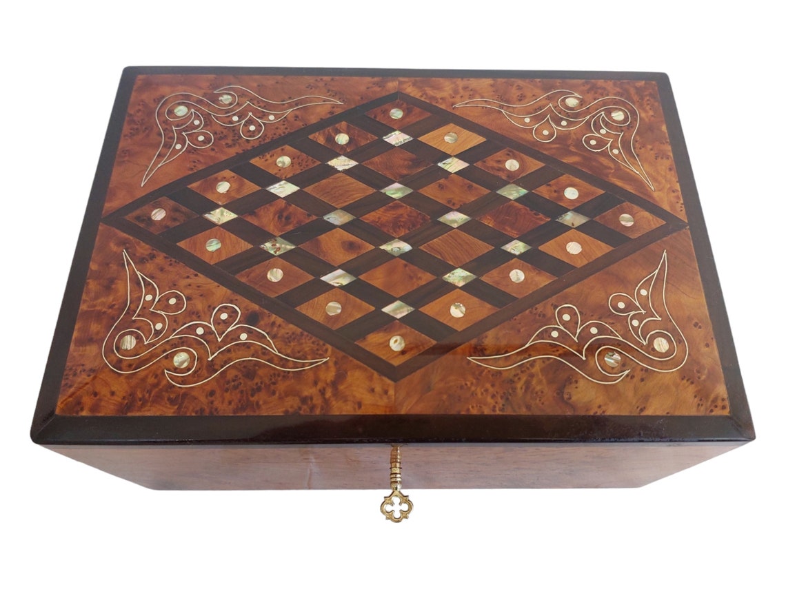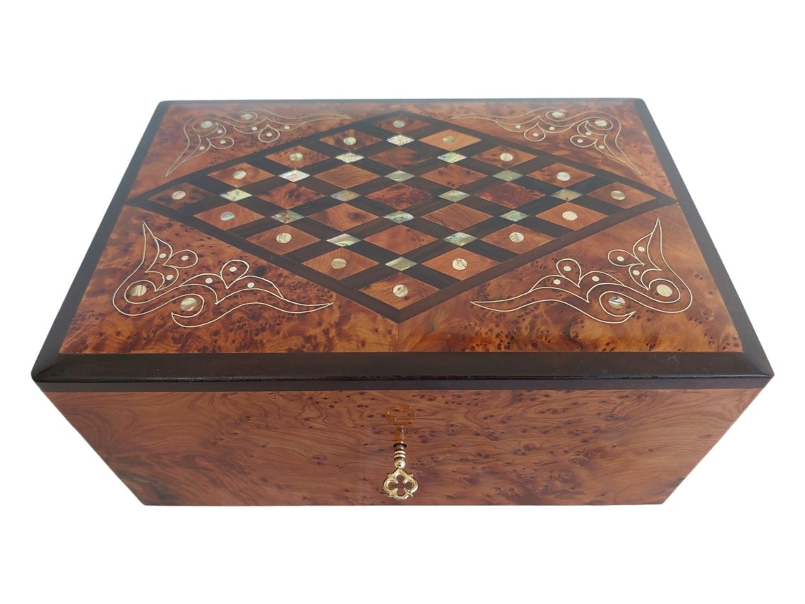 Handcrafted Moroccan Thuya Wood Jewelry Chest - Large Lockable Treasure Box, Unique Engraved Gift