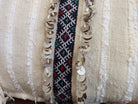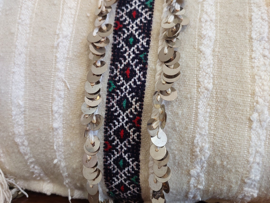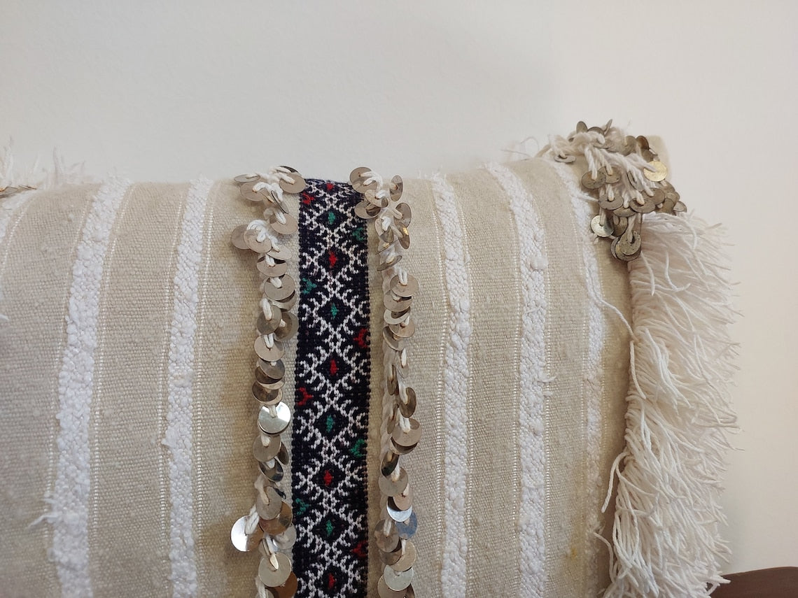 Vintage Moroccan Handira Pillow — Cotton & Wool Blend With Sequins, Handwoven By Berber Artisans, Traditional Wedding Blanket Design