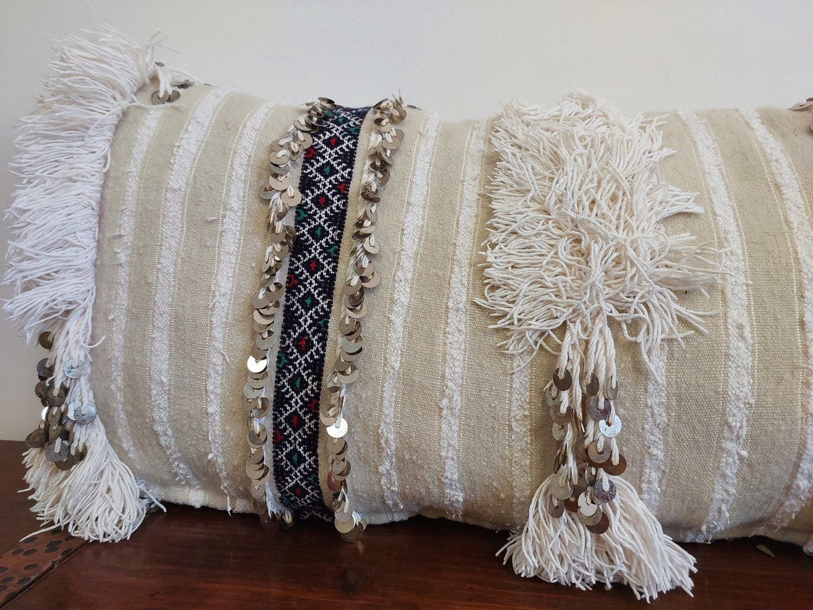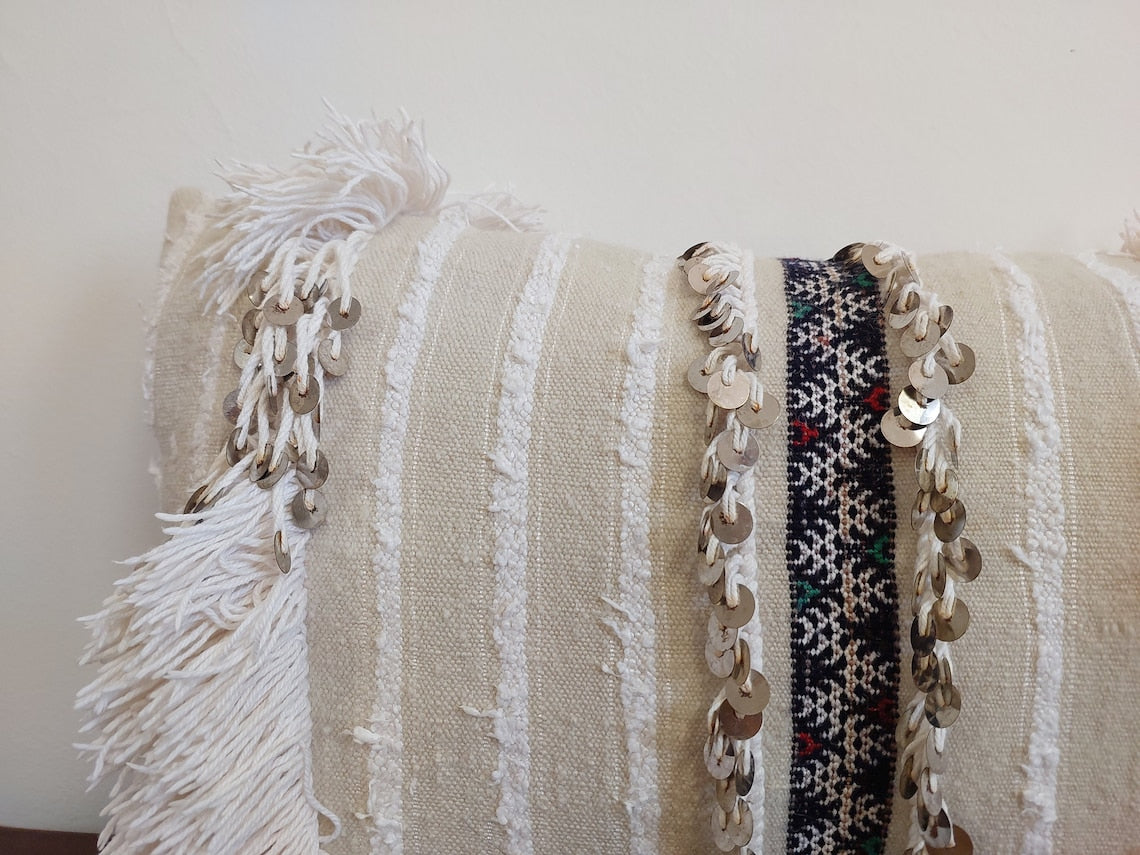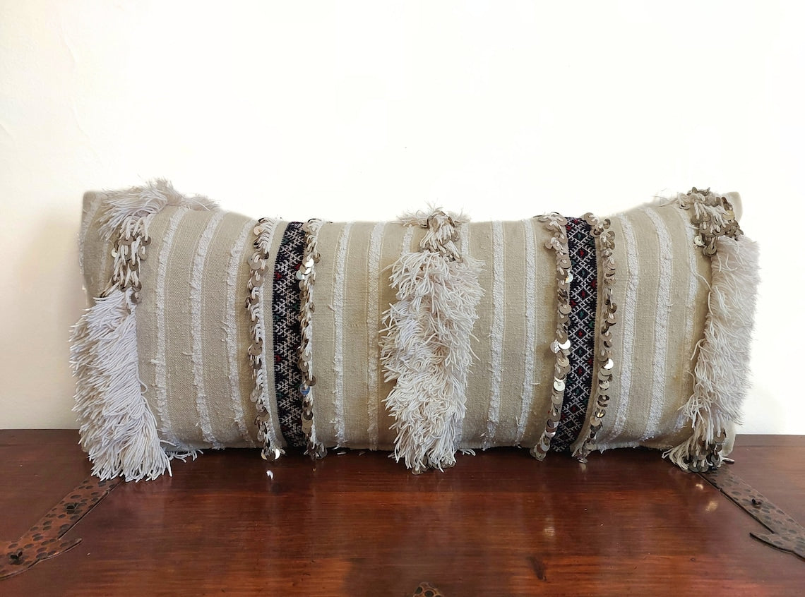 A Unique Handmade Lumbar Pillow Case Crafted From An Authentic Vintage Berber Wedding Blanket (Handira). Adorned With Glittering Silver Sequins, This Pillow Case Carries The Cultural Significance And Blessings Traditionally Associated With Moroccan Handira Blankets. Perfect As A Decorative Accent On Your Sofa, Bed, Or Chair.