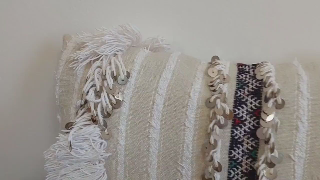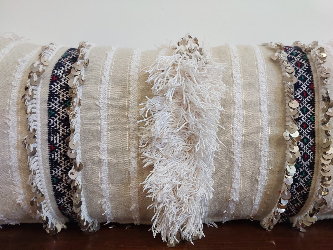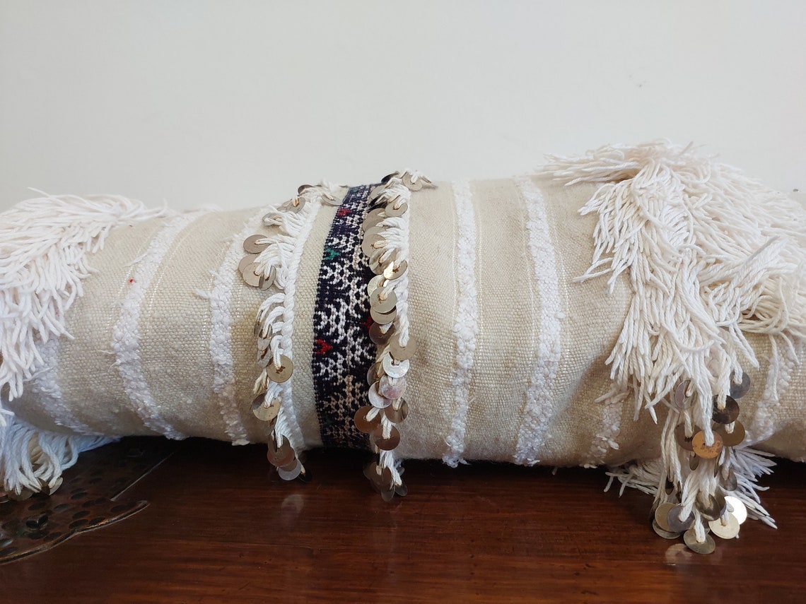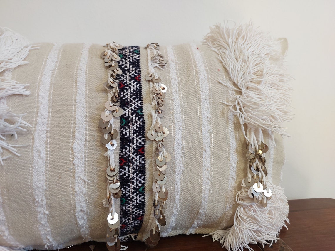 A Unique Handmade Lumbar Pillow Case Crafted From An Authentic Vintage Berber Wedding Blanket (Handira). Adorned With Glittering Silver Sequins, This Pillow Case Carries The Cultural Significance And Blessings Traditionally Associated With Moroccan Handira Blankets. Perfect As A Decorative Accent On Your Sofa, Bed, Or Chair.