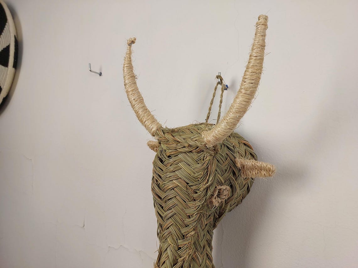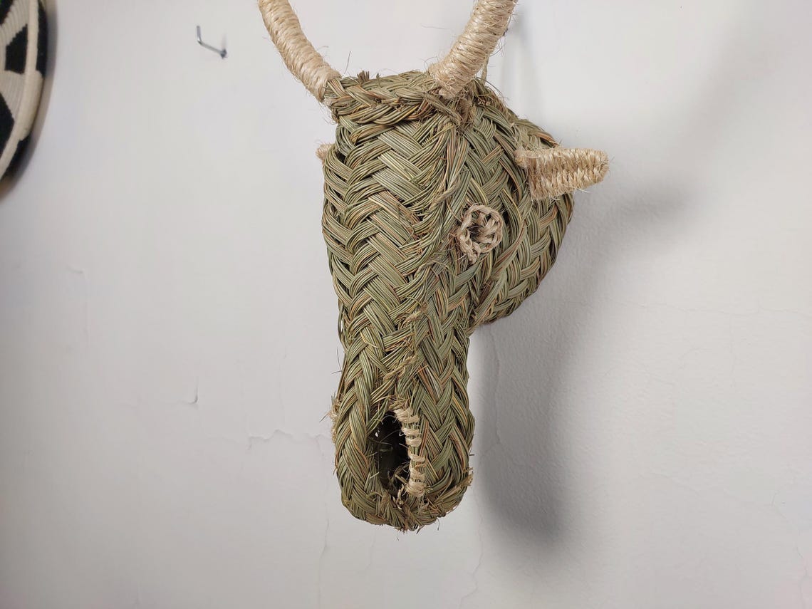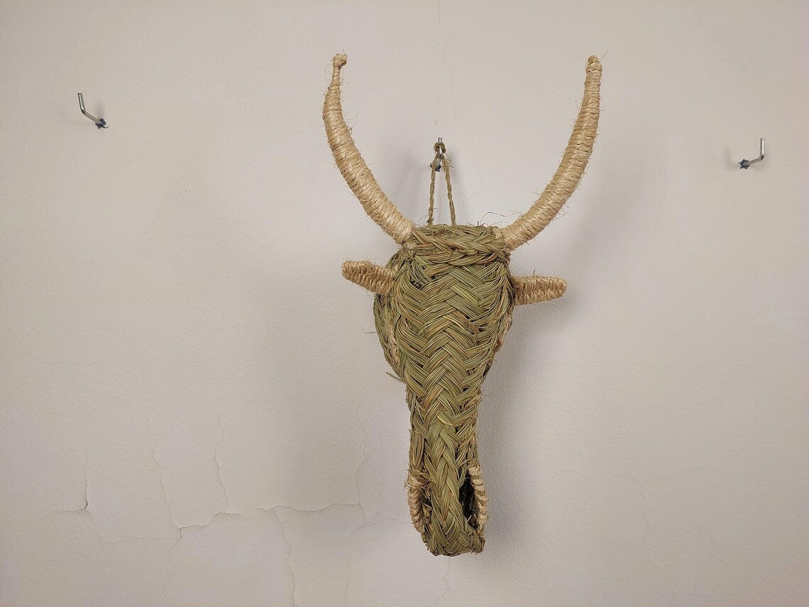 Add rustic charm and natural warmth to your walls with this handwoven goat head wall hanging, carefully braided from palm leaf (halfa grass) in Morocco. Its organic texture and earthy tones make it perfect for boho interiors, farmhouse spaces, nursery walls, or eclectic gallery displays. Each piece is one-of-a-kind, reflecting the artisanal skill and creativity of Moroccan craftsmen.