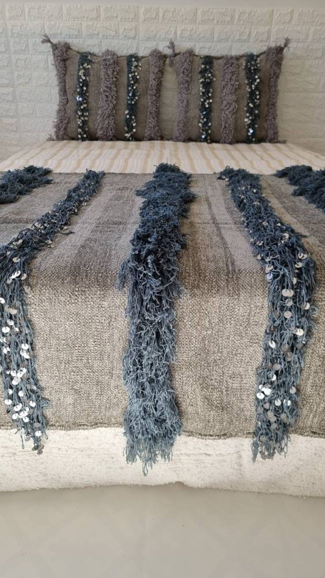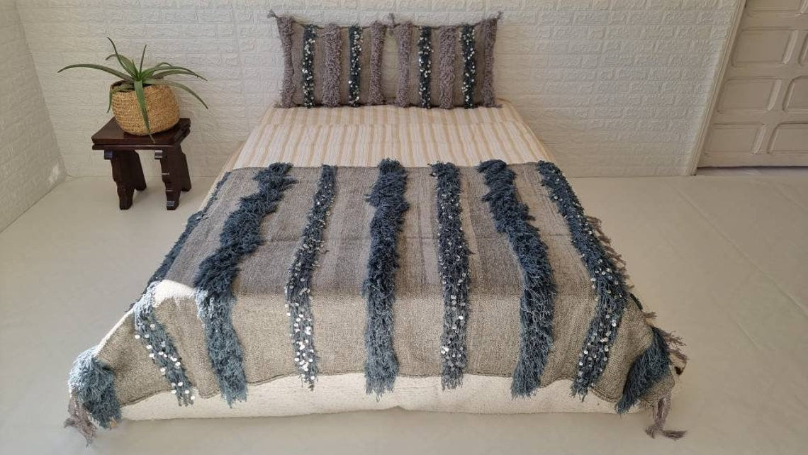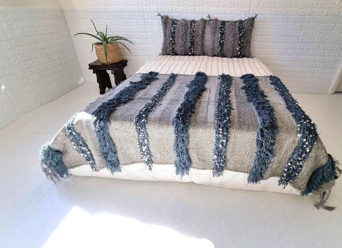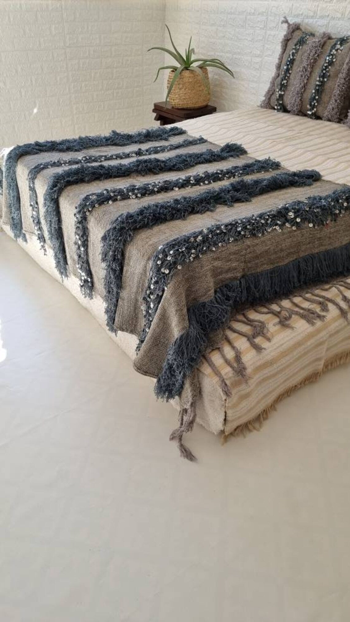 Elegant Moroccan Handira Wedding Blanket - Gray Berber Handwoven Decor for Bedroom