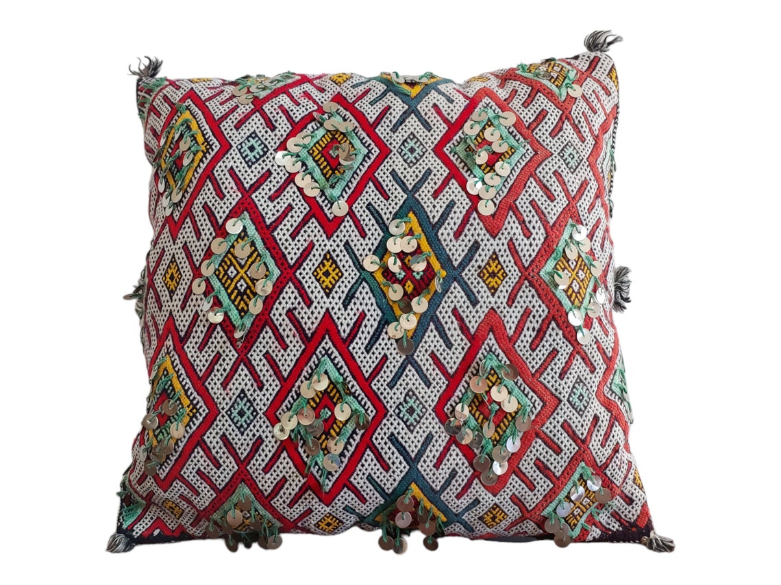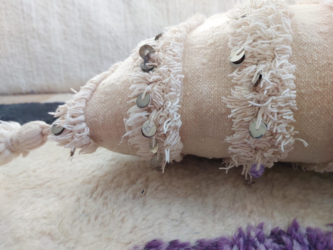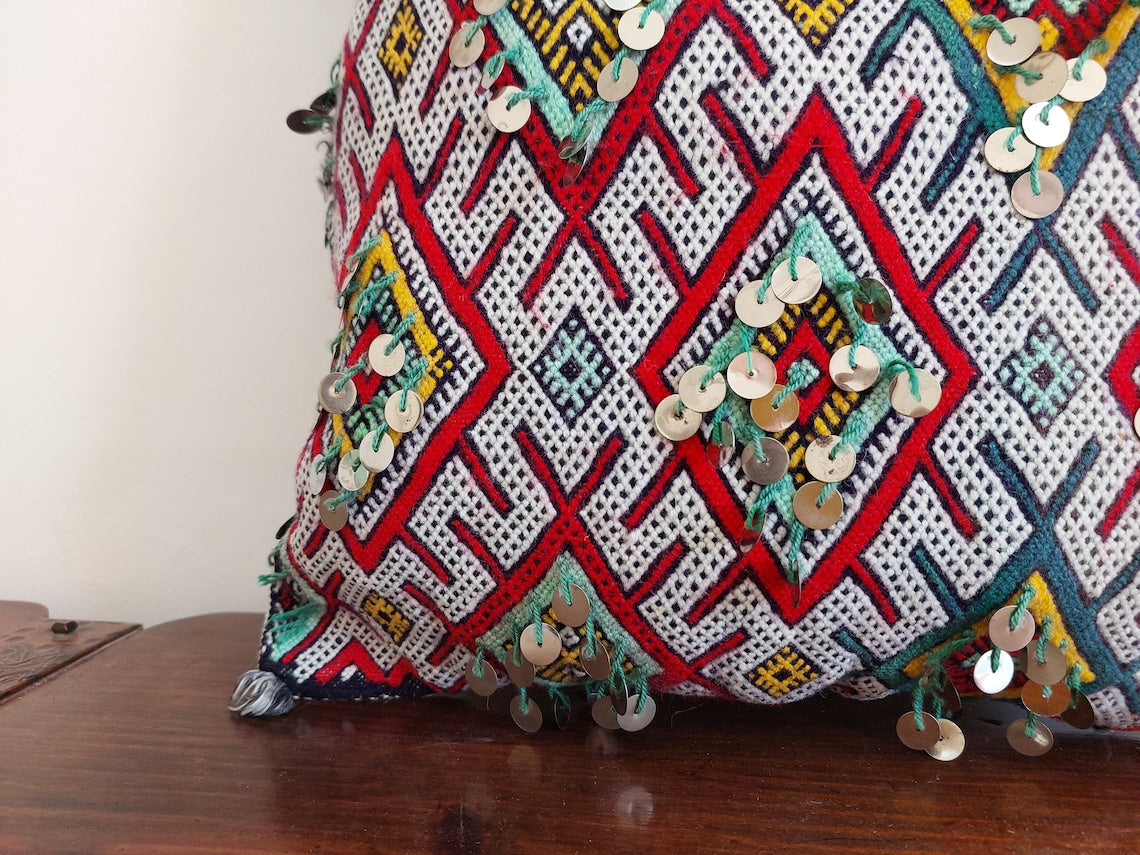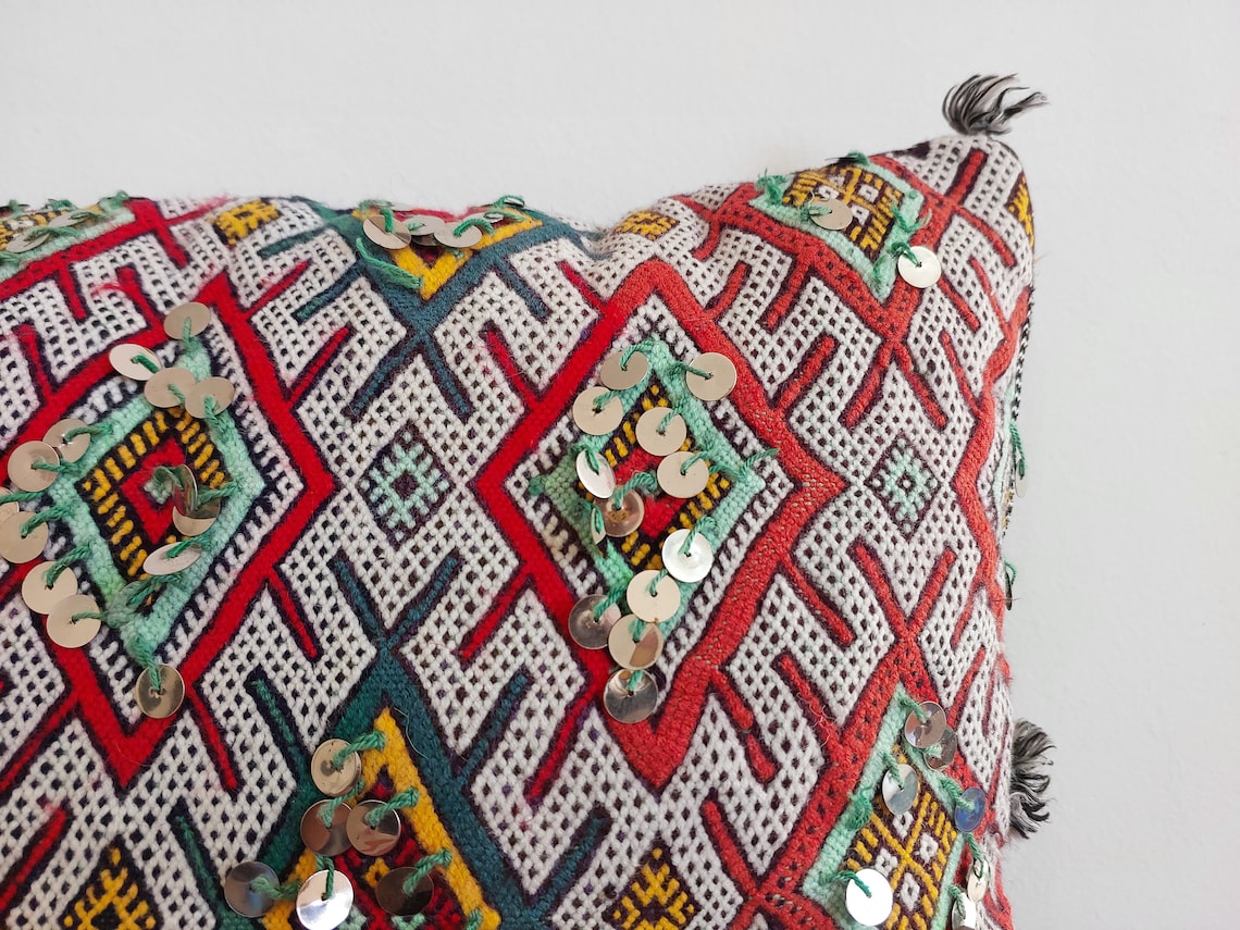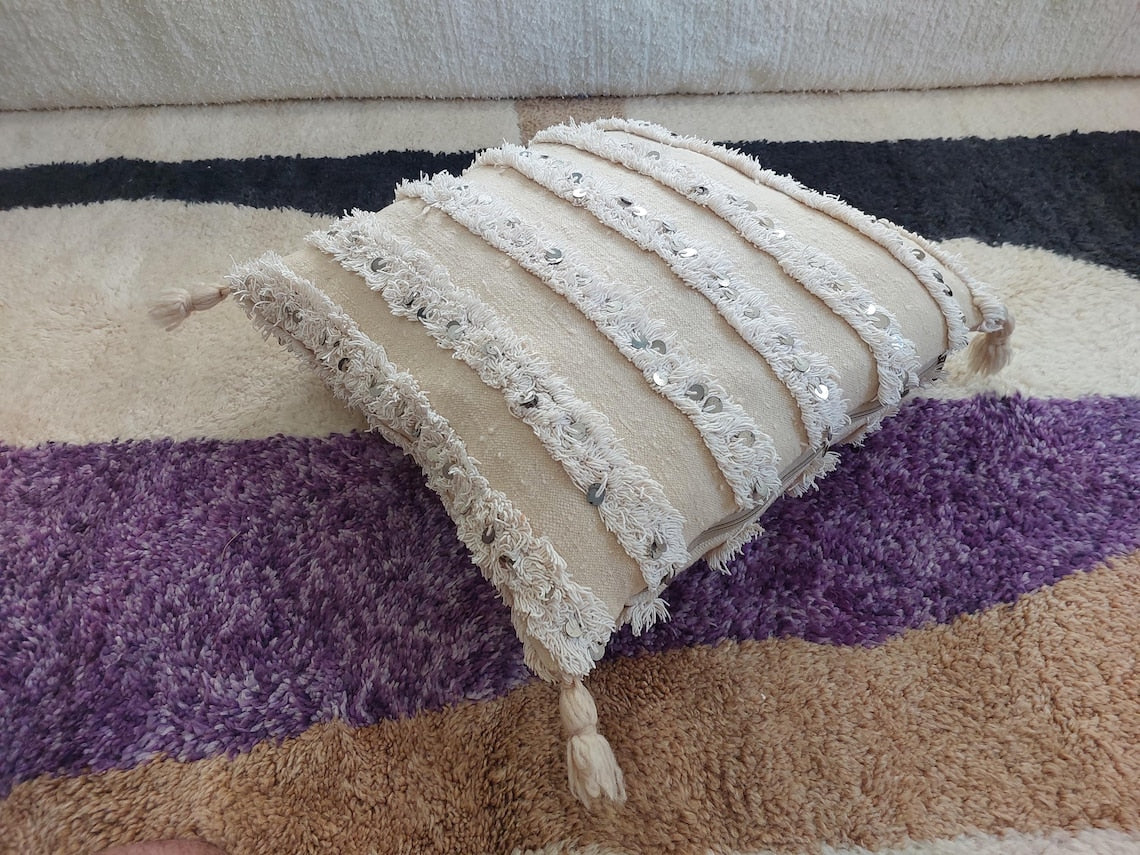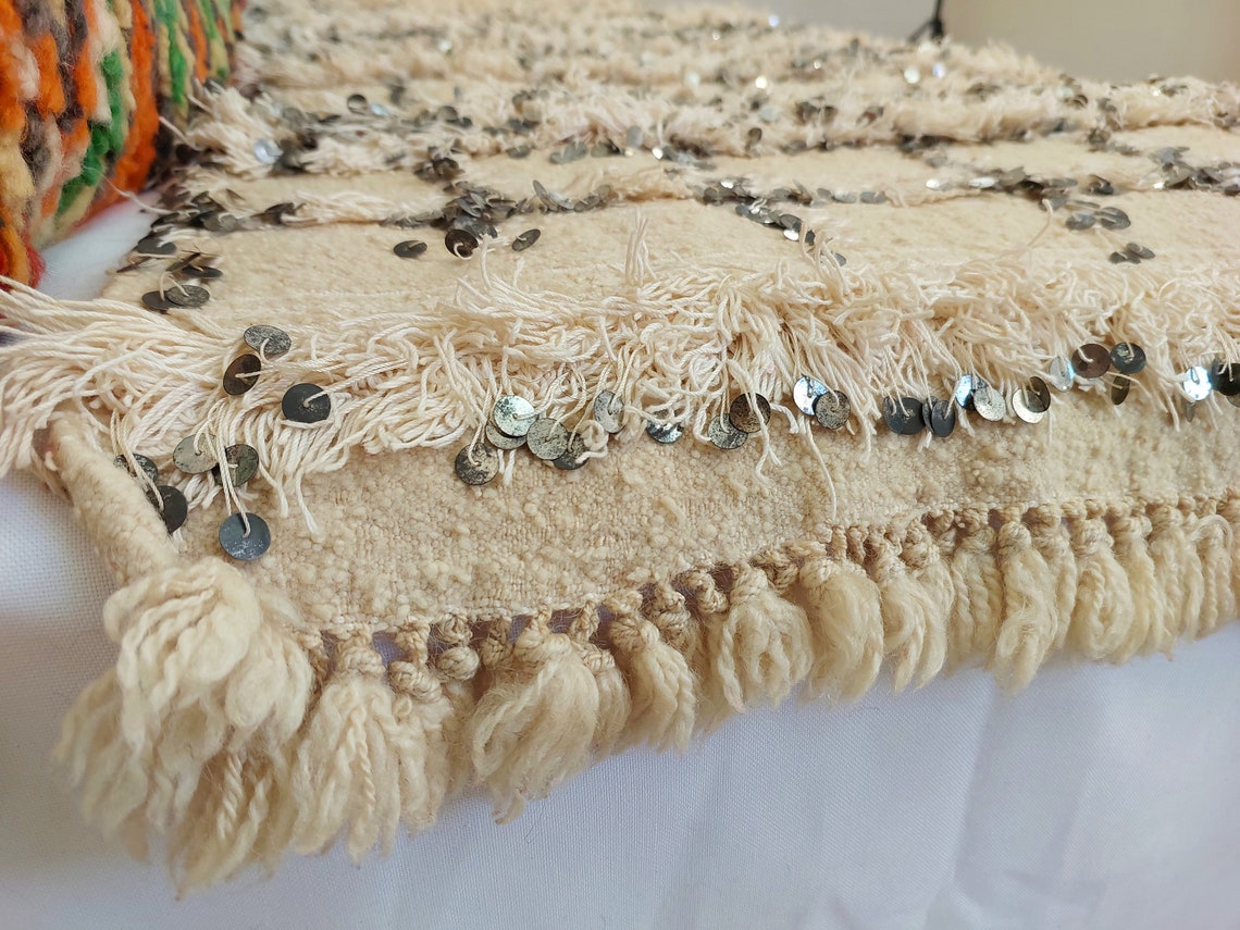 Double Sided Berber Wedding Blanket Throw Pillow, Pom Pom Handira Pillow Case, Sequines Woolen Pillow. 20"×20"