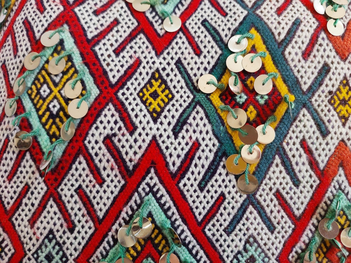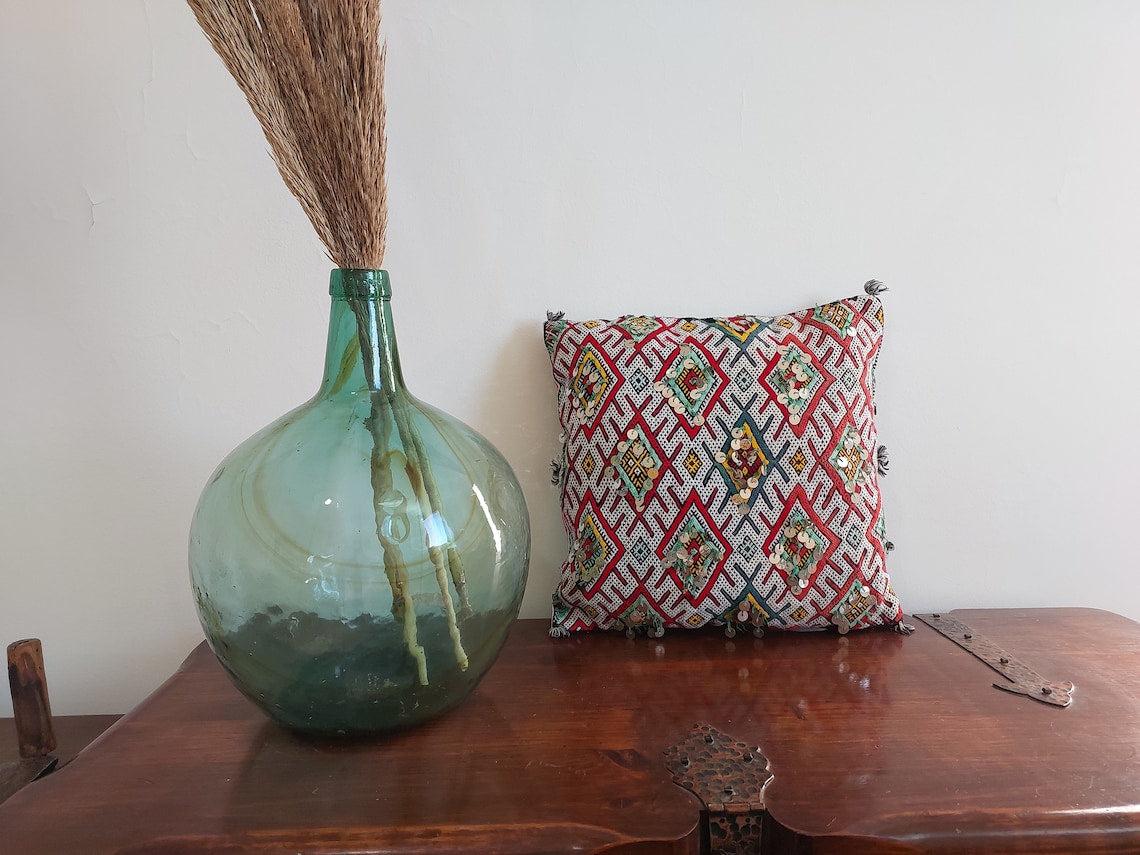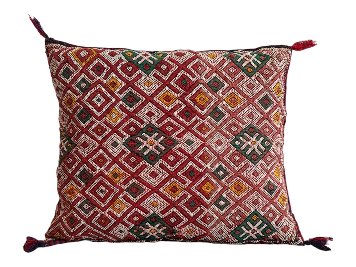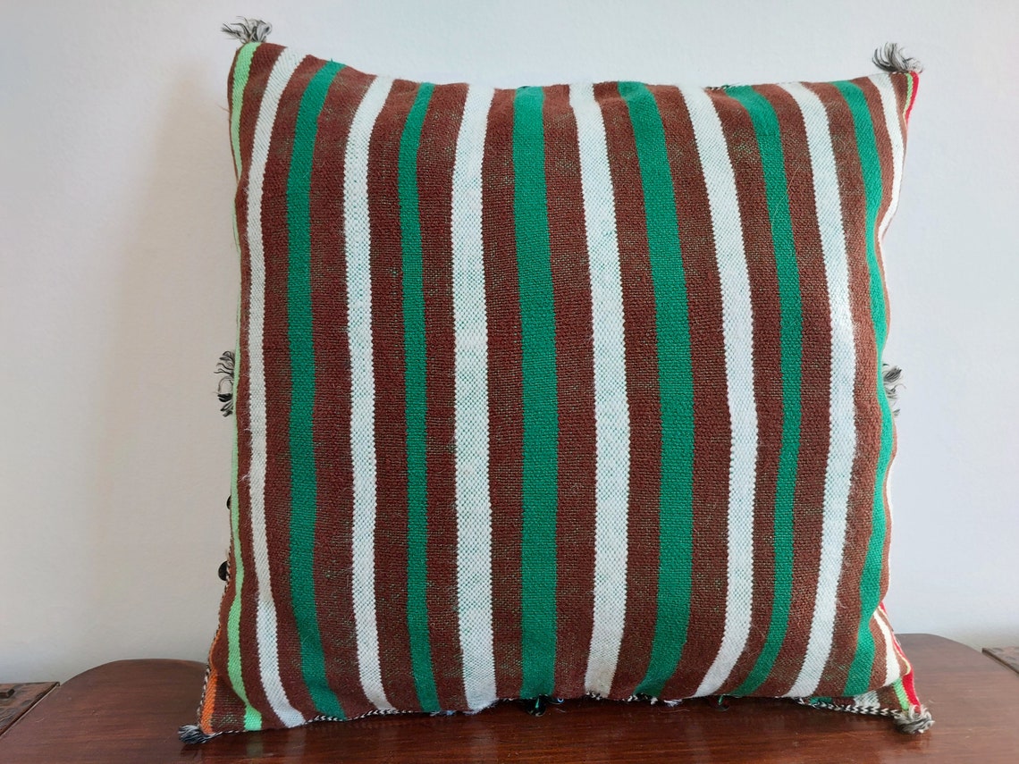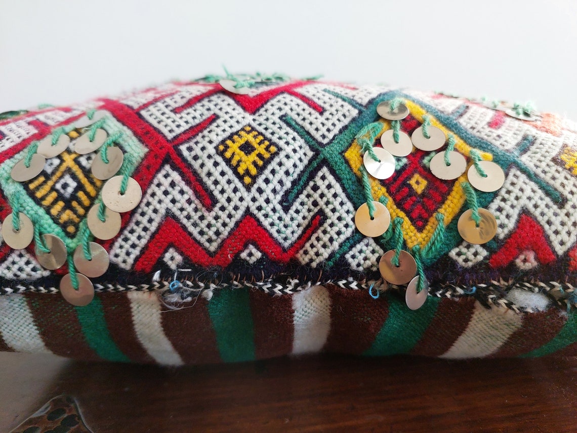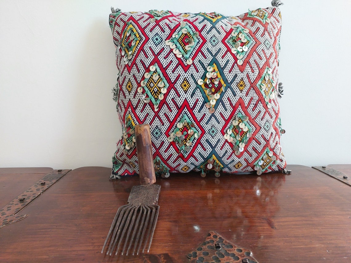 Double Sided Berber Wedding Blanket Throw Pillow, Pom Pom Handira Pillow Case, Sequines Woolen Pillow. 20"×20"