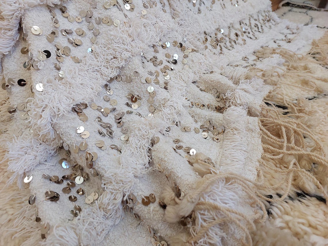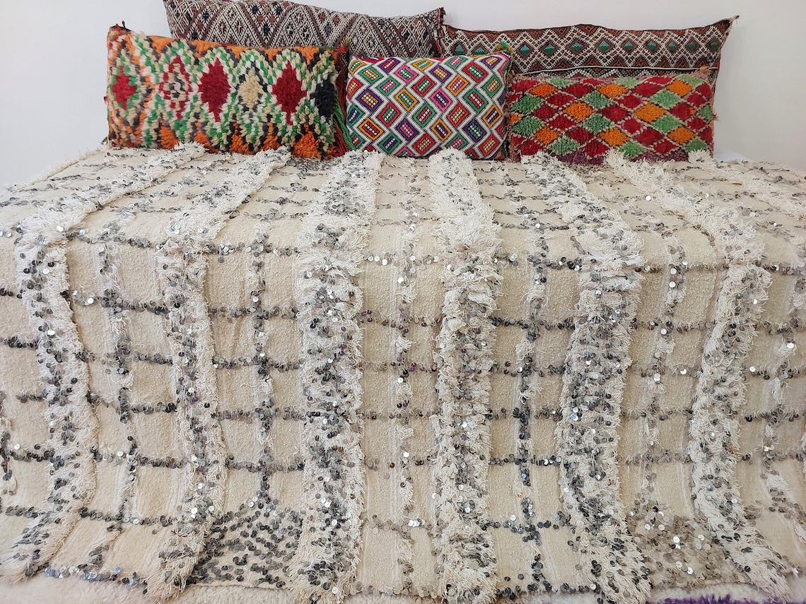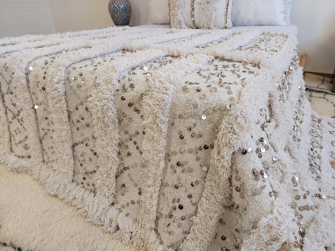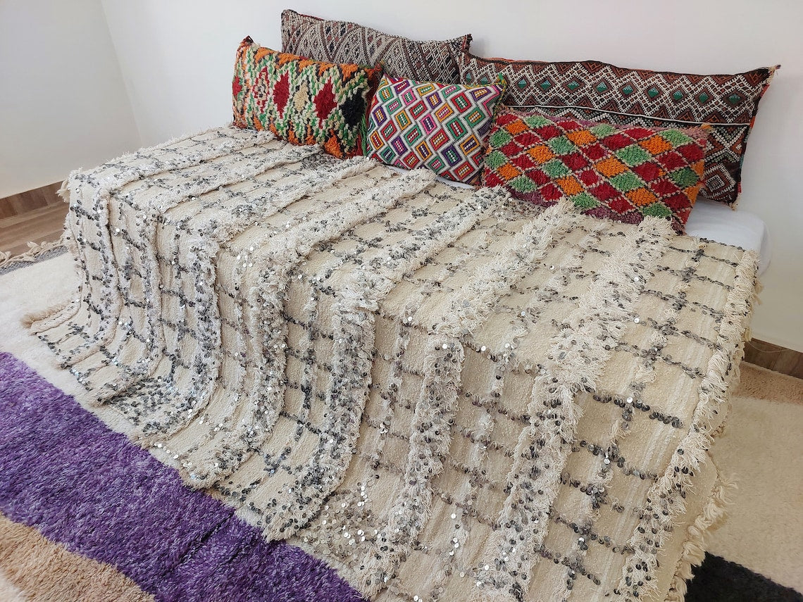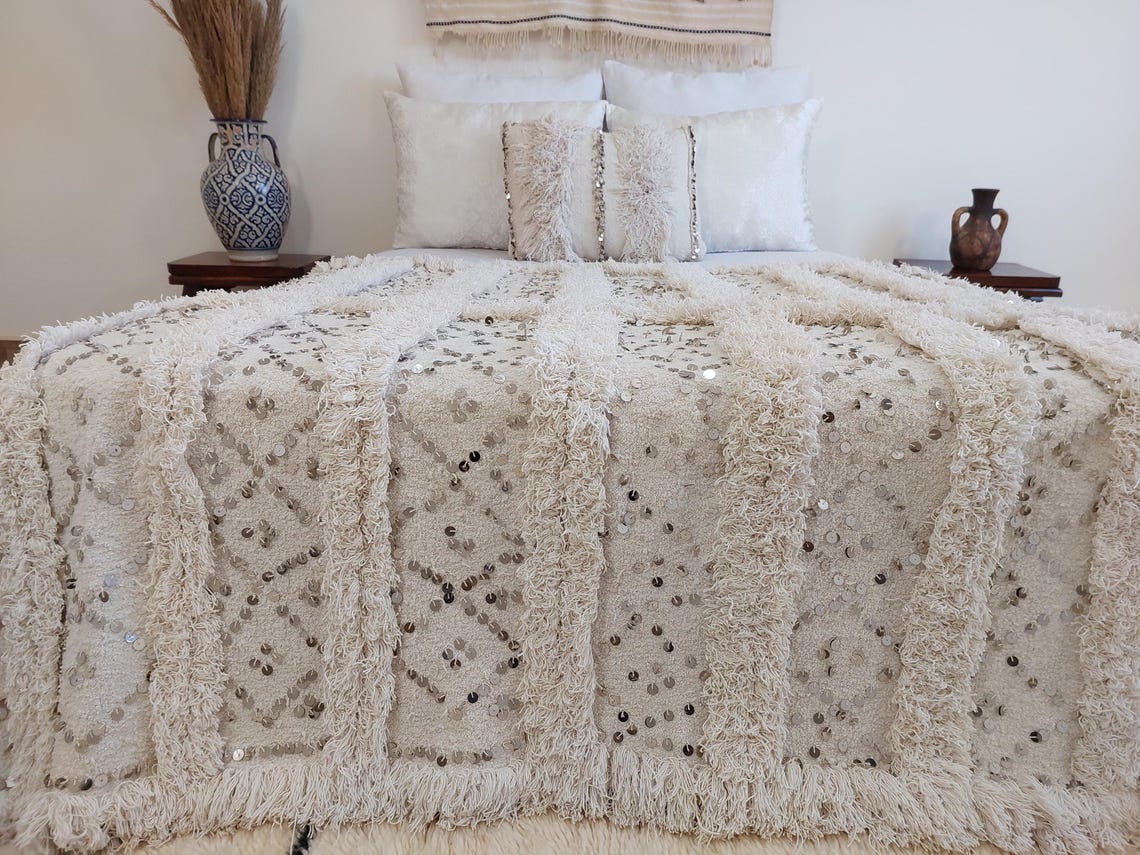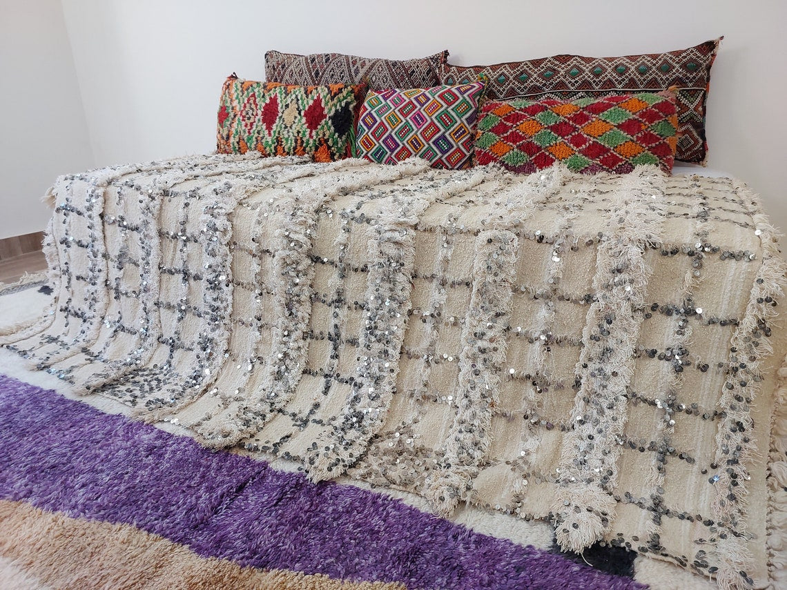 Cream Wool Blanket With Sequins: Handwoven Moroccan Throw, Off White Bedspread, Berber Style Rug