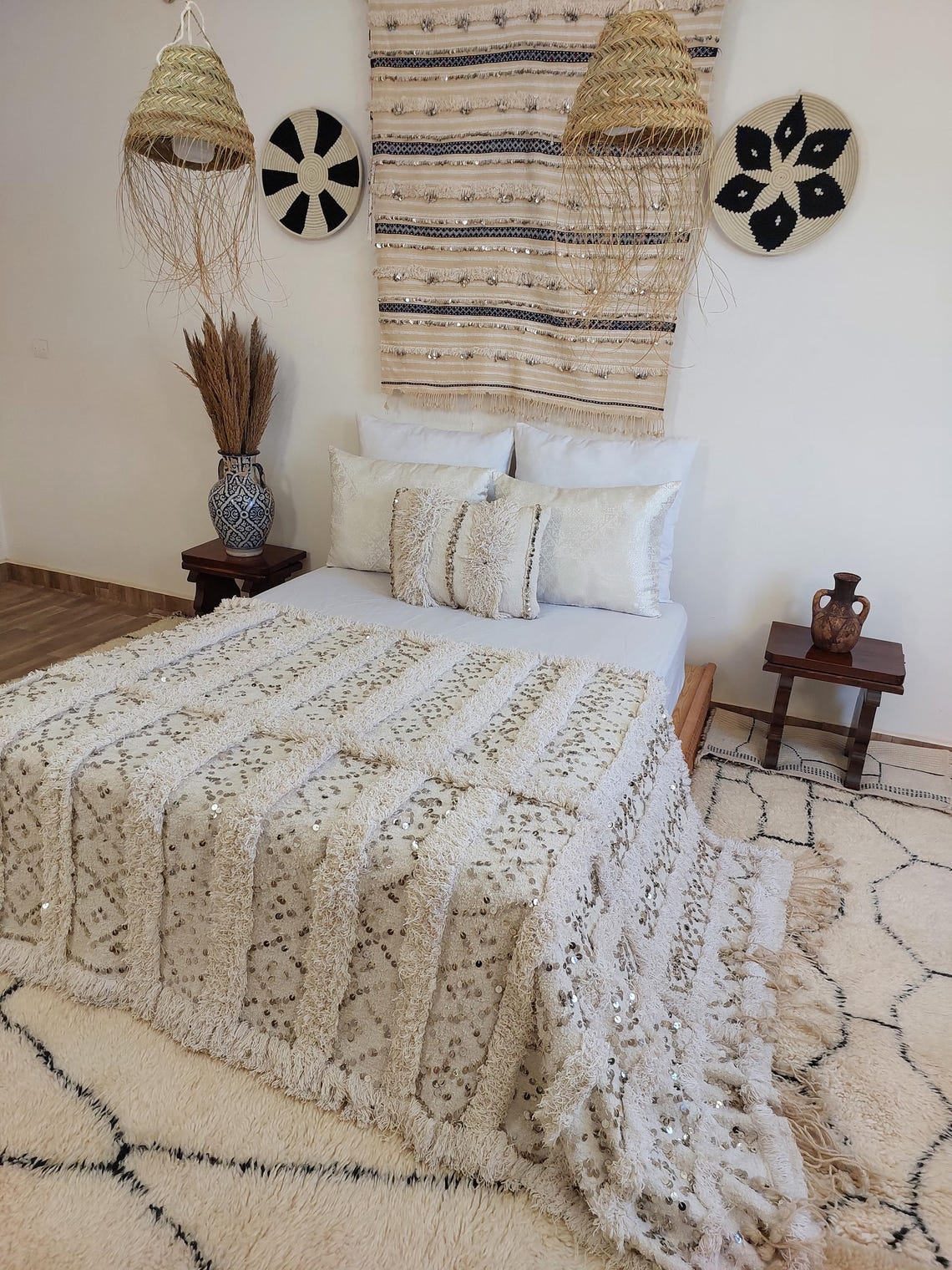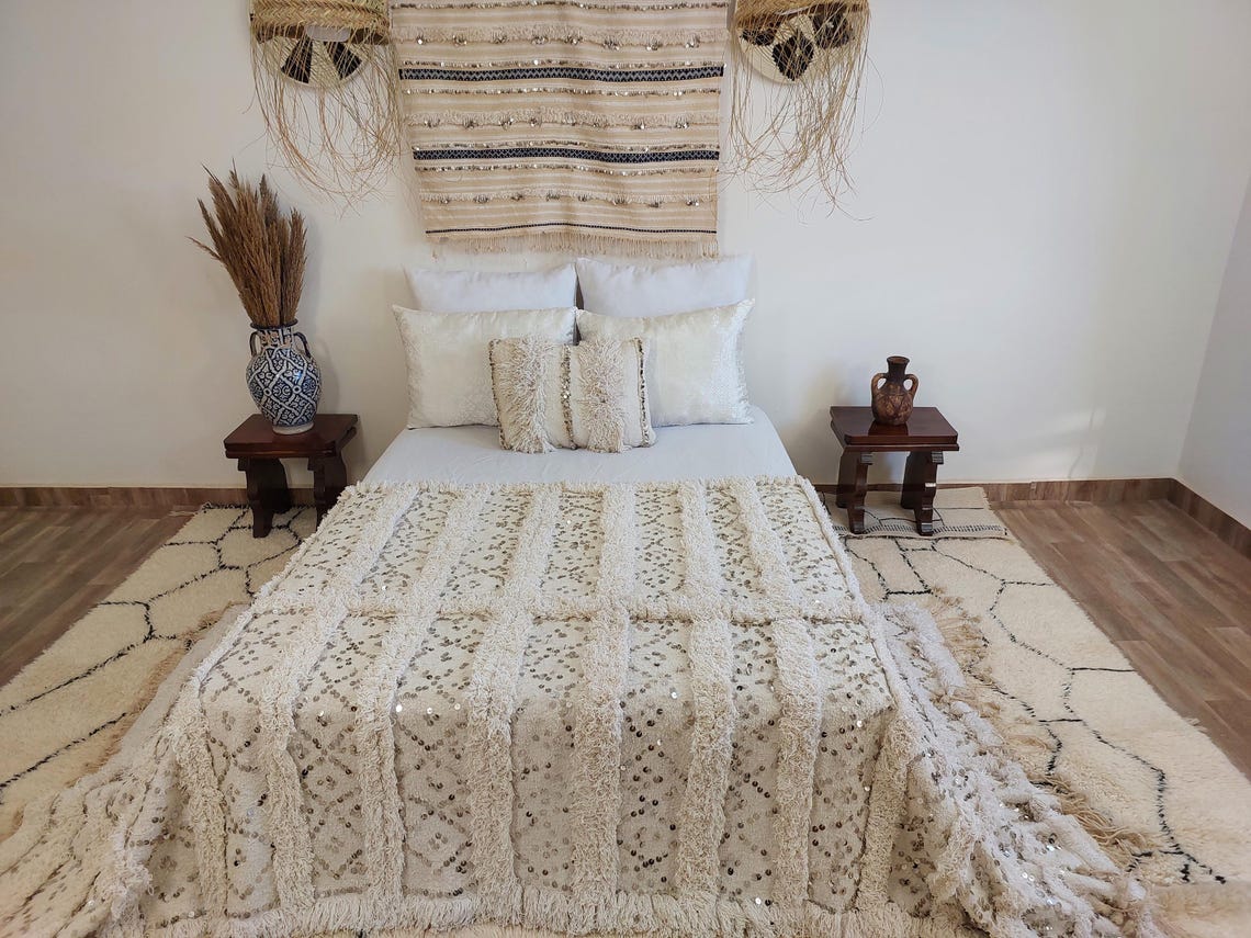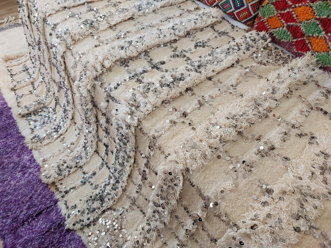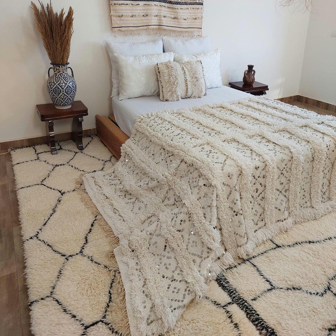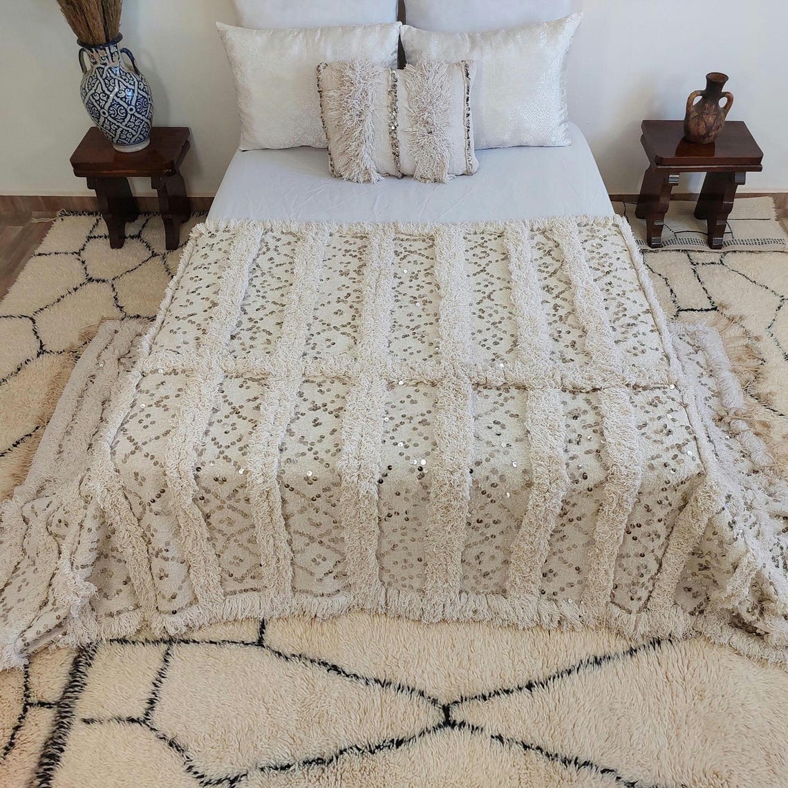 Cream Wool Blanket With Sequins: Handwoven Moroccan Throw, Off White Bedspread, Berber Style Rug