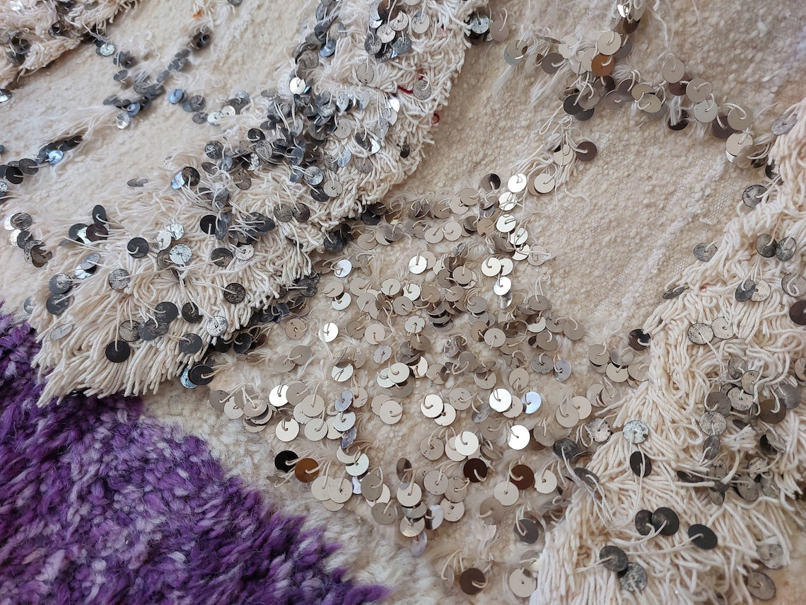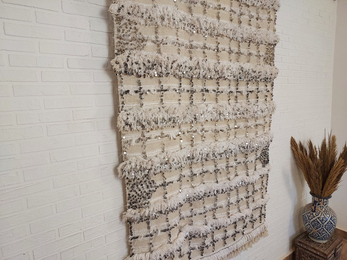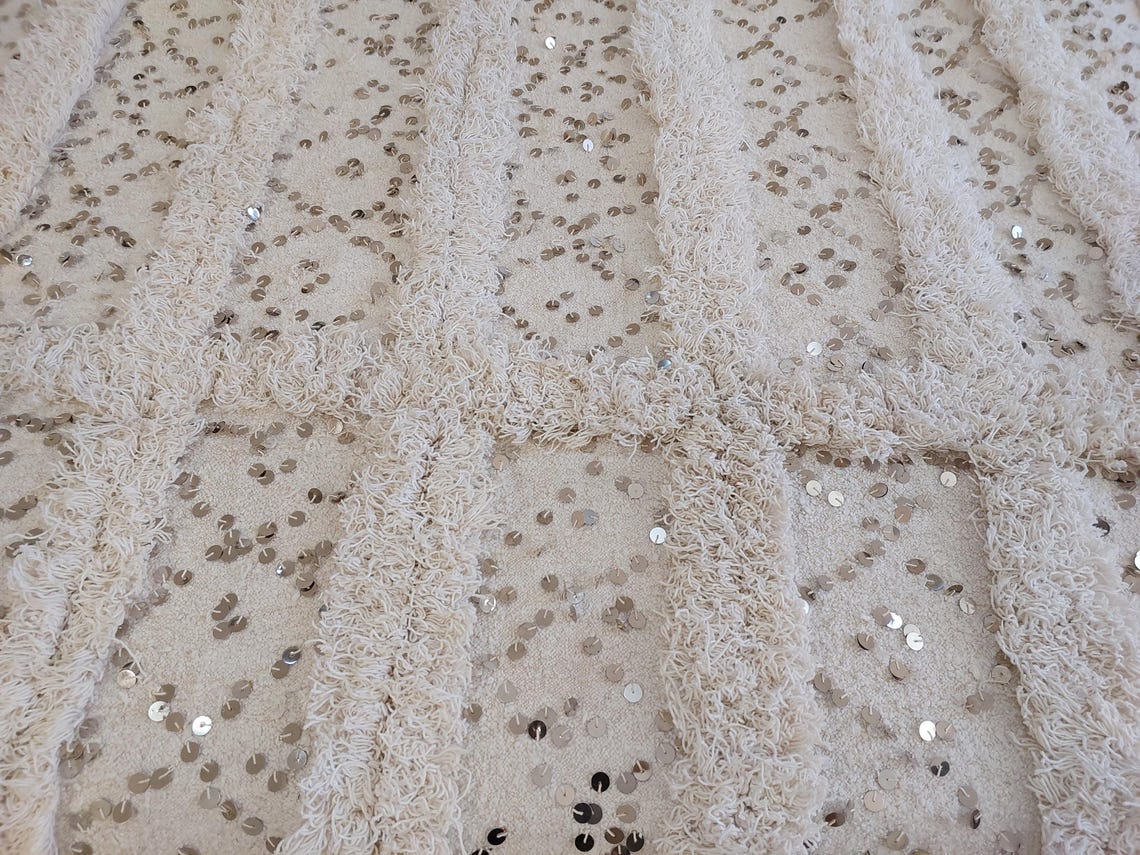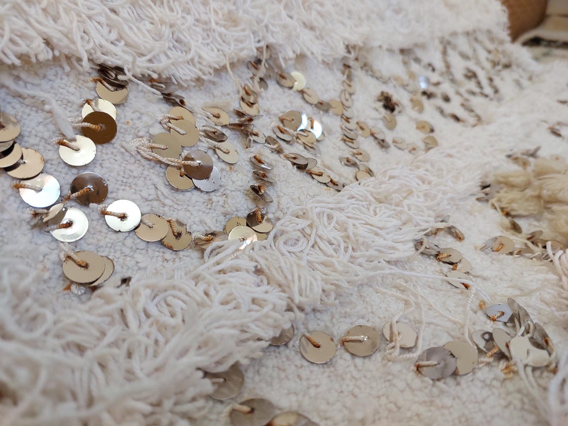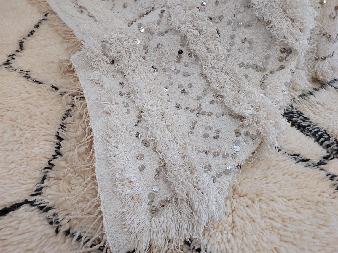 Cream Wool Blanket With Sequins: Handwoven Moroccan Throw, Off White Bedspread, Berber Style Rug