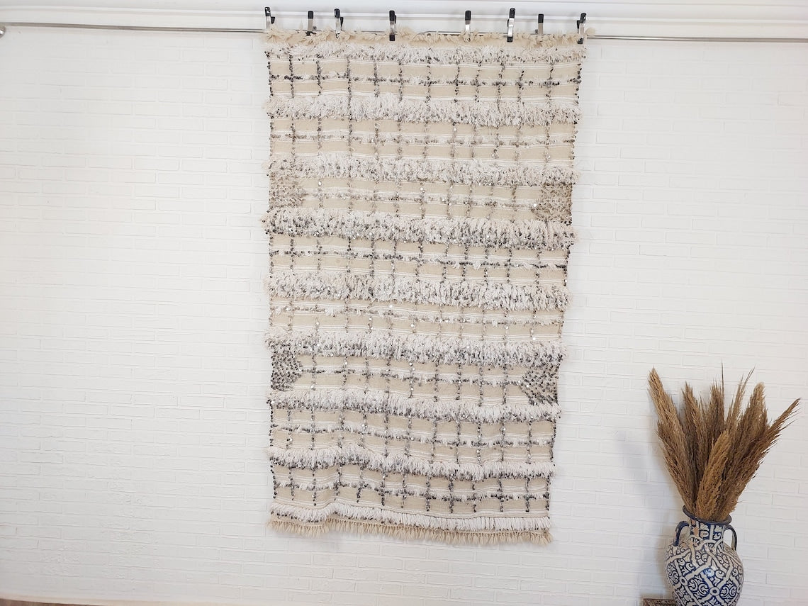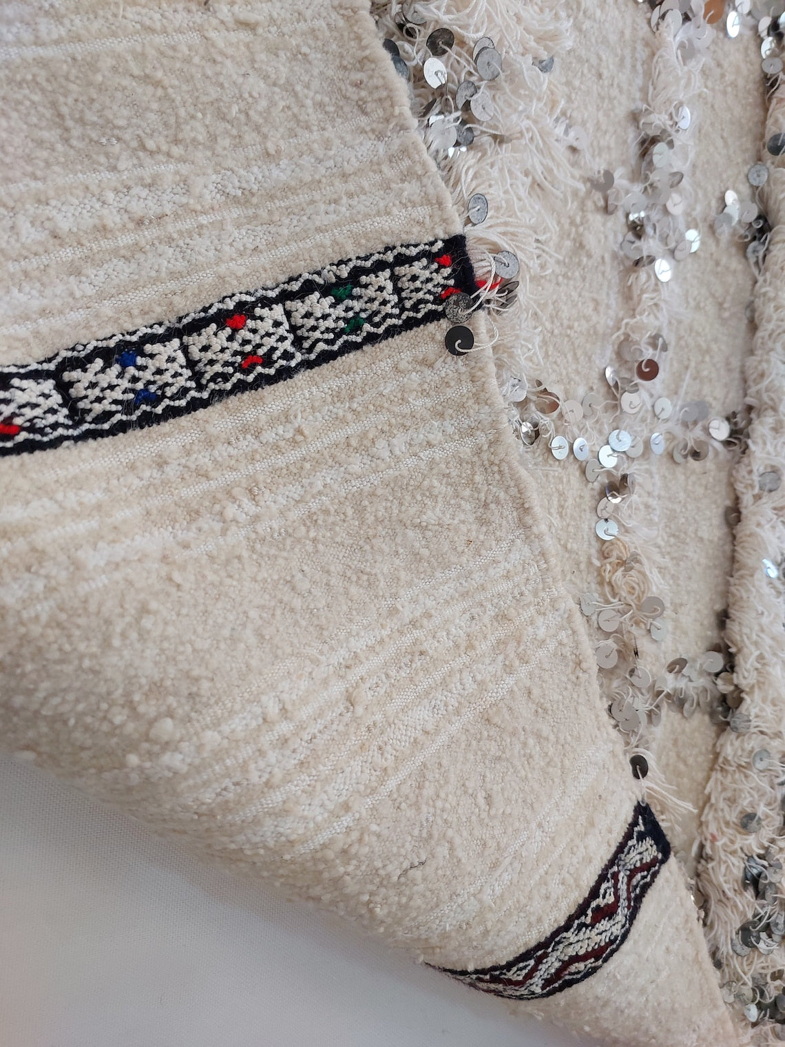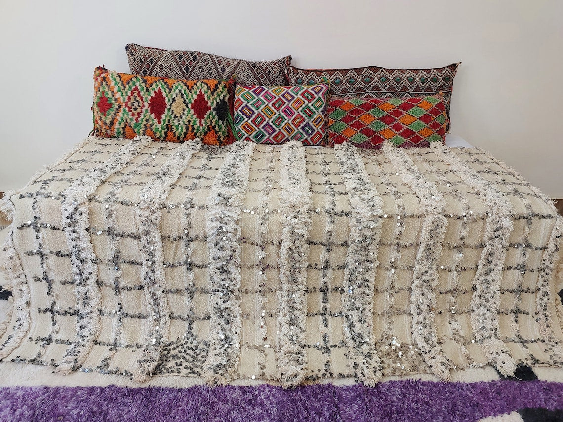 Cream Wool Blanket With Sequins: Handwoven Moroccan Throw, Off White Bedspread, Berber Style Rug