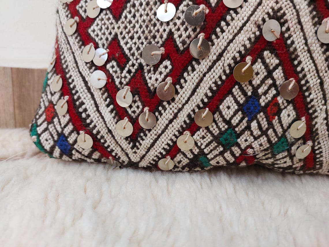 This vintage Moroccan kilim pillow cover is a unique and artisanal piece. Its intricate weaving, vibrant colors, and textured fabric make it perfect for adding a bohemian touch to any sofa, bed, or living space. Cleaned, washed, and ready to use in your home.