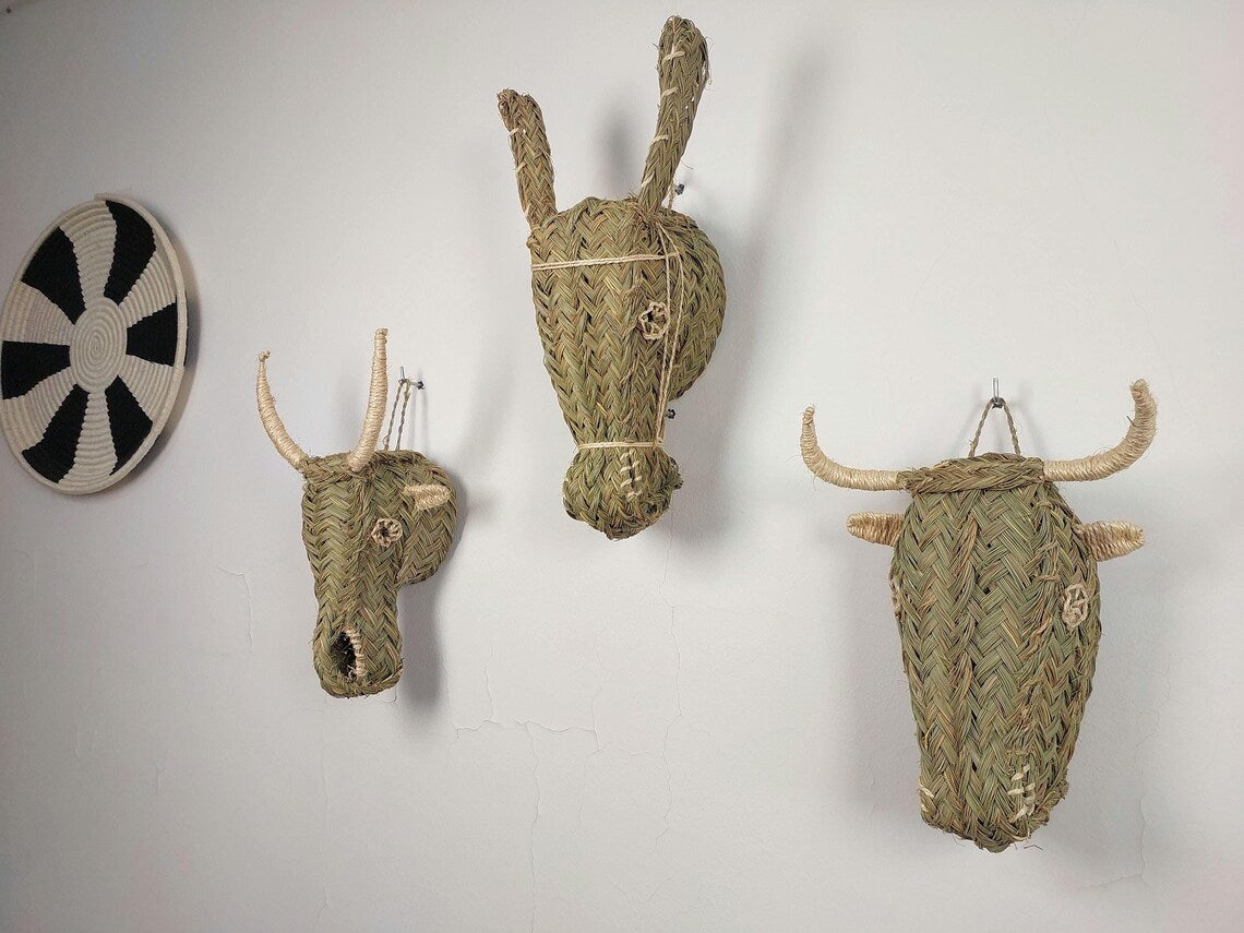 Set of 3 Handwoven bull , goat , Donkey Heads Wall Hanging – Custom Rattan Wall Art, Boho Nursery Decor, Moroccan Palm Leaf Animal Head