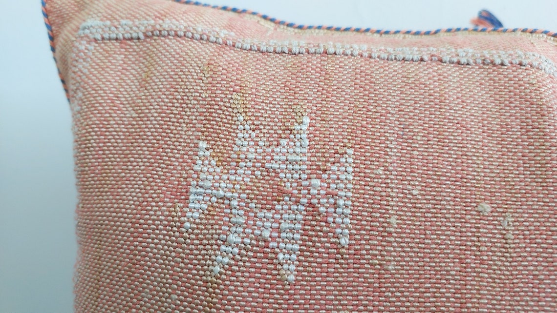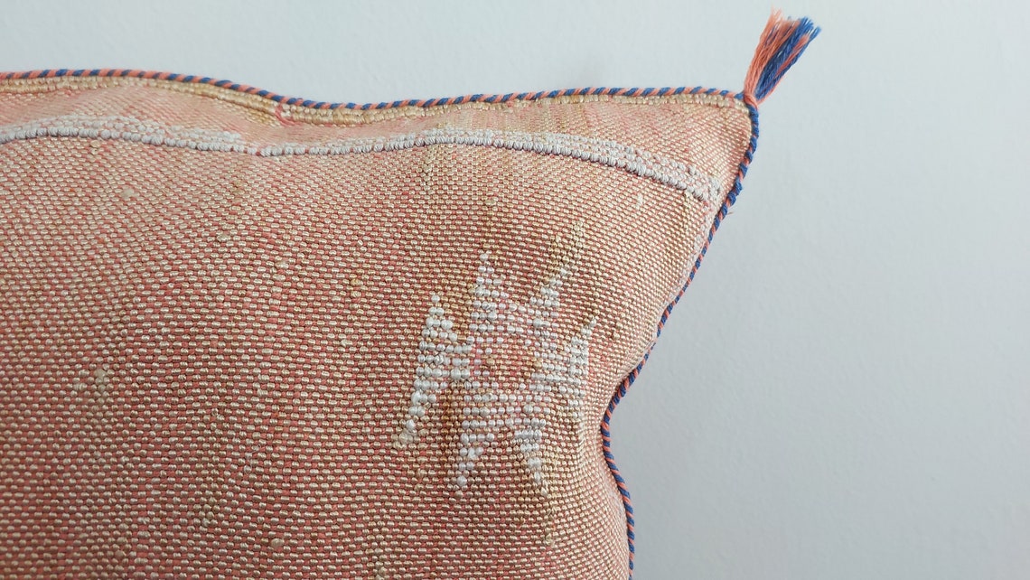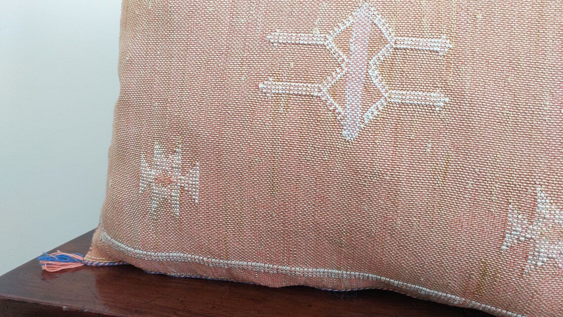 These Moroccan cactus silk pillows are hand crafted on traditional wooden looms by skilled Berber women. Each pillow is unique, featuring interlaced braiding on all four sides with tassels at the corners. The washed silk gives a vintage look with subtle flexions of light tones, making them a standout addition to any bedroom, living room, or nursery.