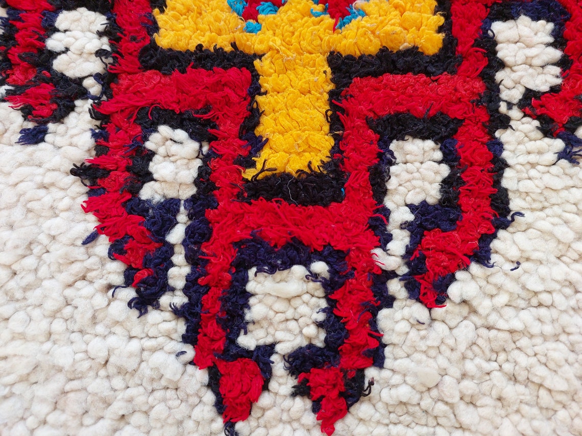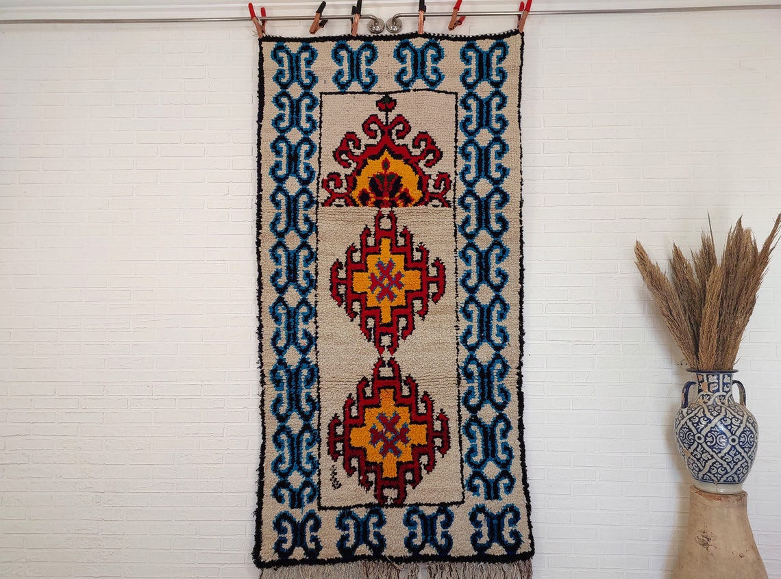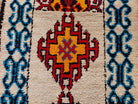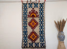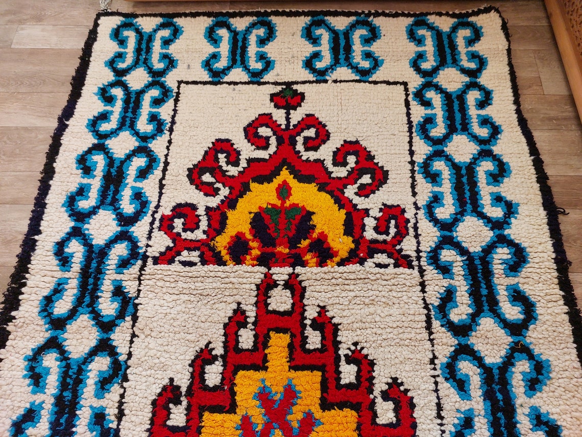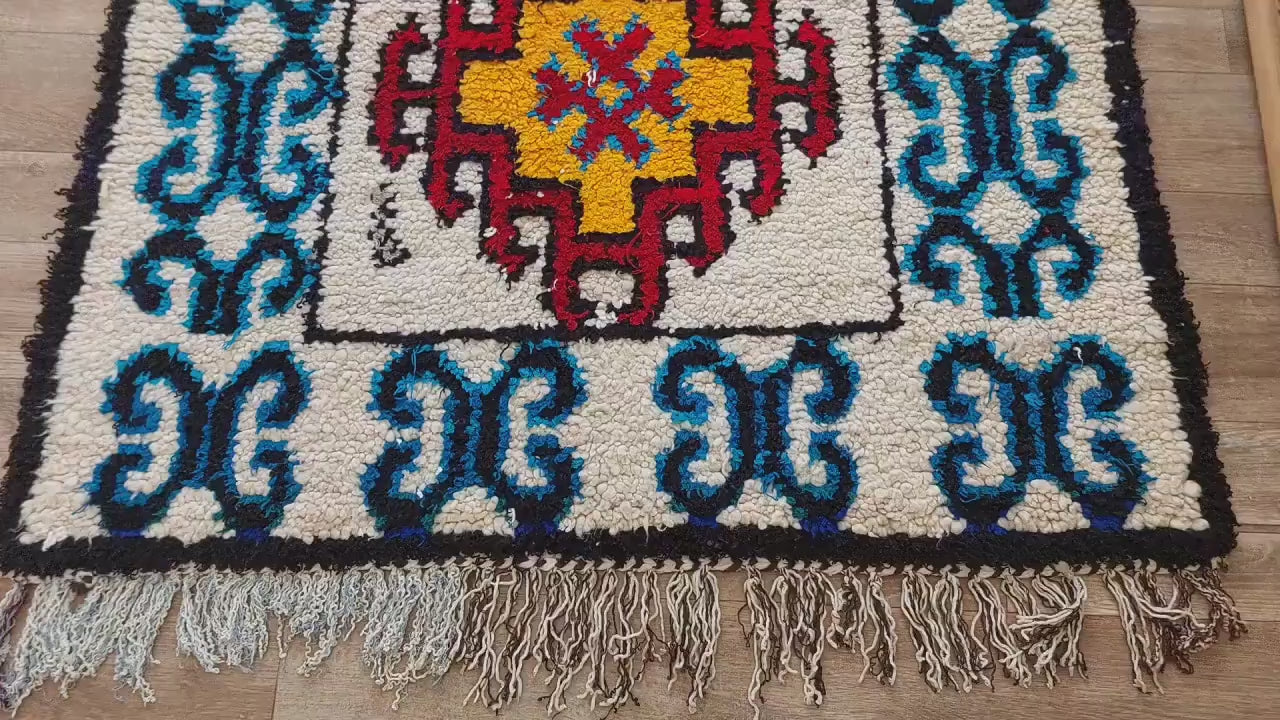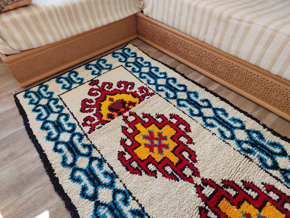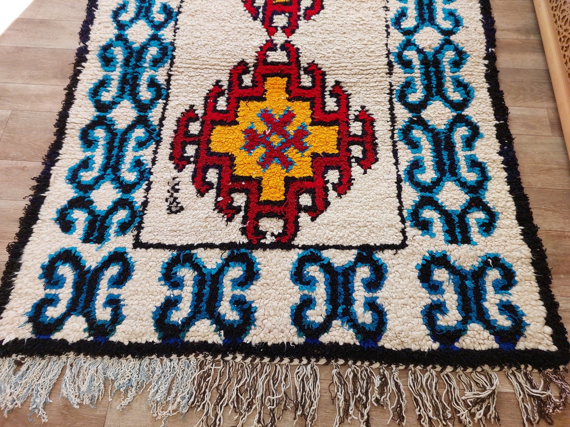 This vintage Boucherouite rug is handcrafted from wool and recycled fabrics by Moroccan women. Each piece is unique, reflecting vibrant colors and the rich generosity of Moroccan culture. Perfect as a statement rug, wall hanging, or for enhancing any living space.