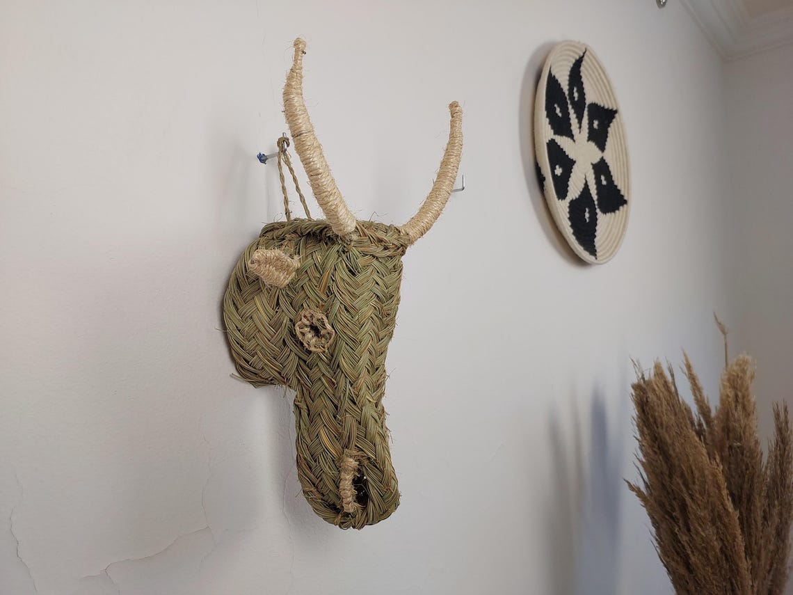 Add rustic charm and natural warmth to your walls with this handwoven goat head wall hanging, carefully braided from palm leaf (halfa grass) in Morocco. Its organic texture and earthy tones make it perfect for boho interiors, farmhouse spaces, nursery walls, or eclectic gallery displays. Each piece is one-of-a-kind, reflecting the artisanal skill and creativity of Moroccan craftsmen.