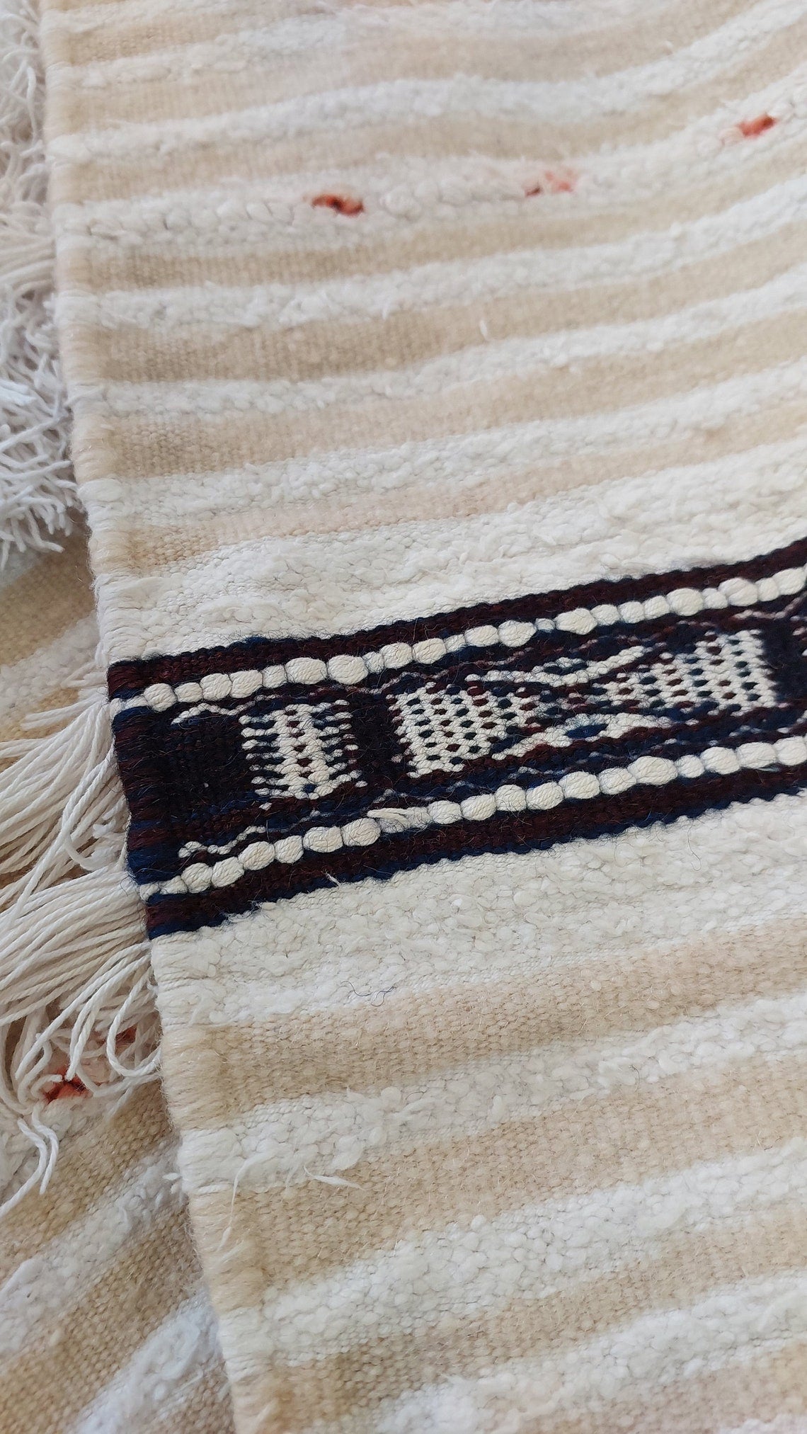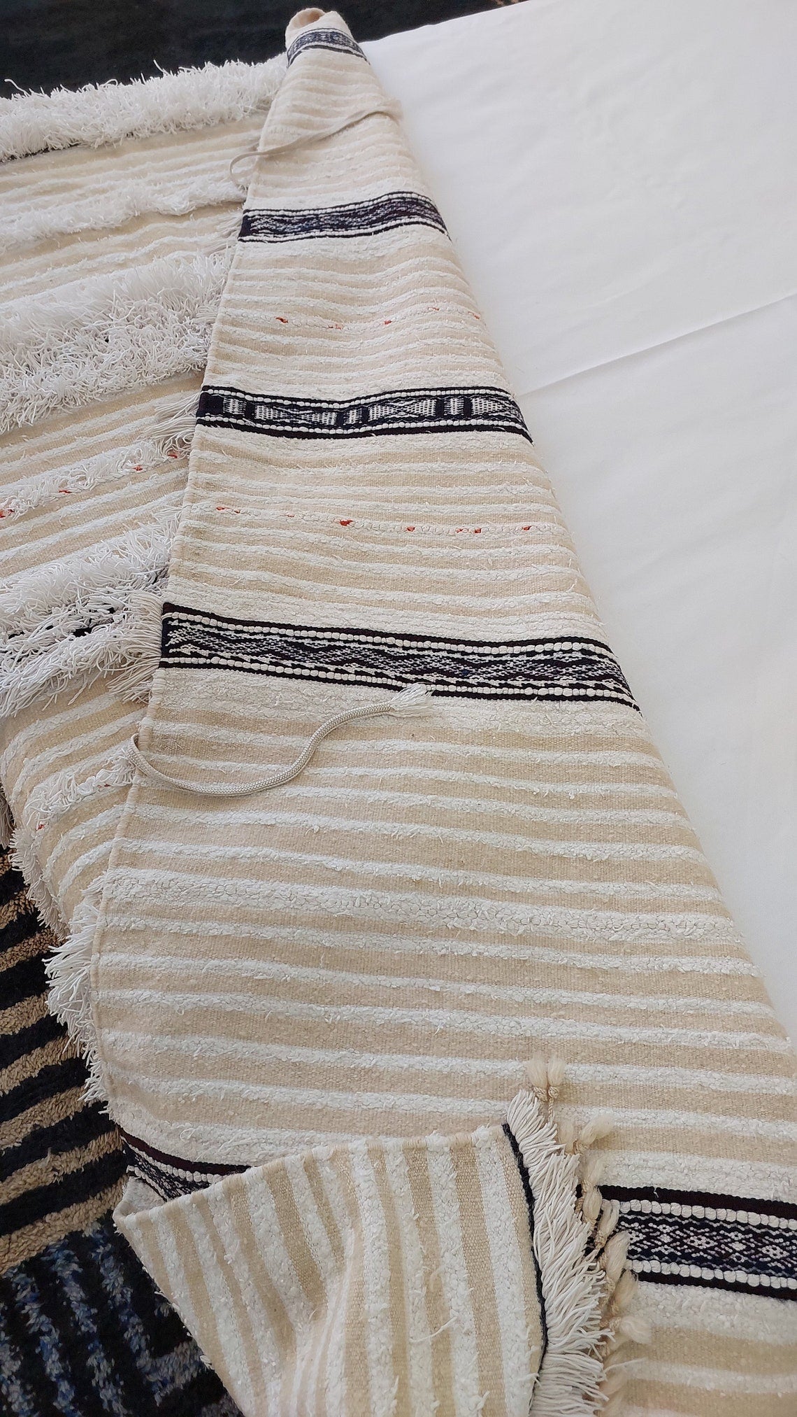 Vintage Moroccan Handira — Cream & White Palette, Wool & Cotton Blend, Traditional Berber Wedding Blanket Without Sequins