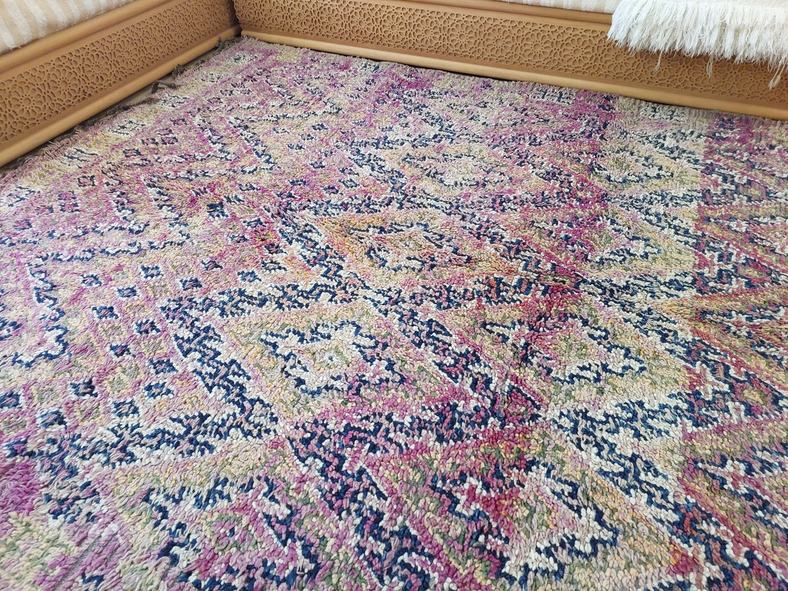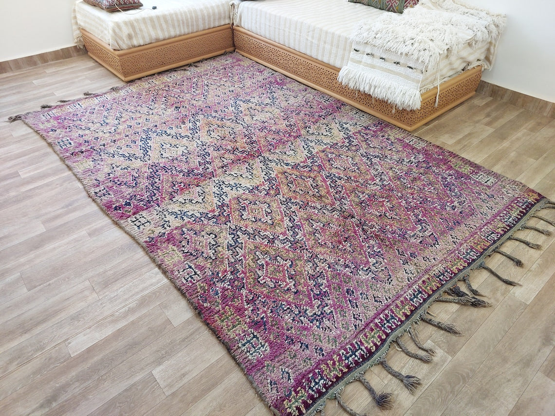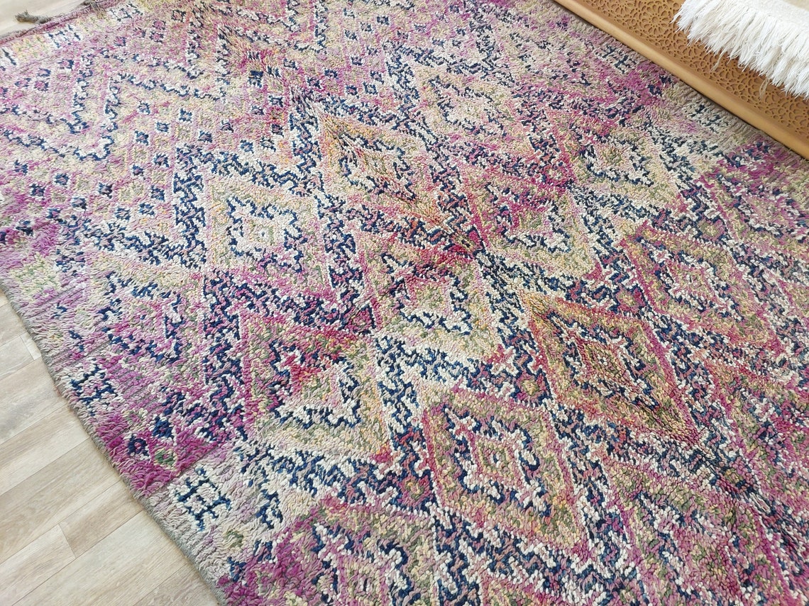 Plush pile vintage Beni M'Guild Moroccan rug — handwoven by skilled Berber artisans, featuring reversible design and vibrant tribal motifs.